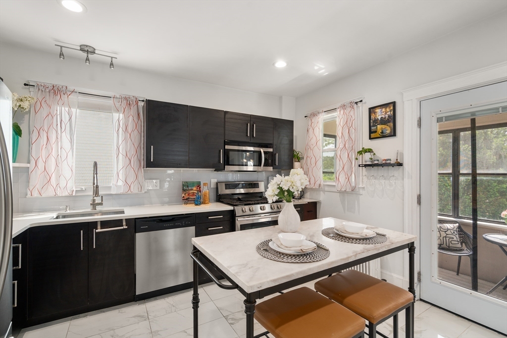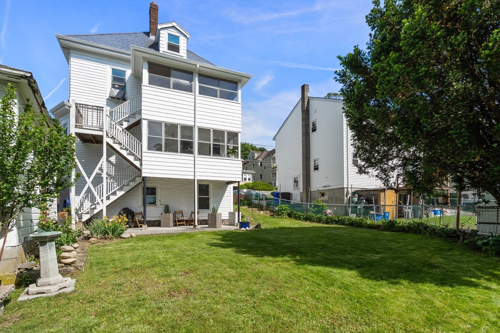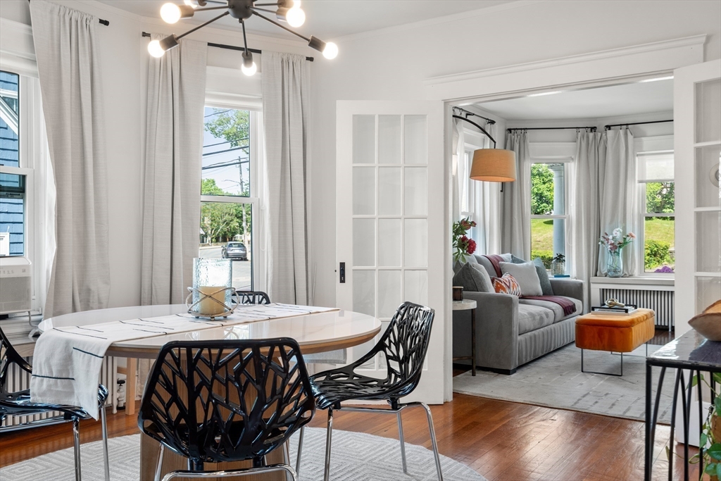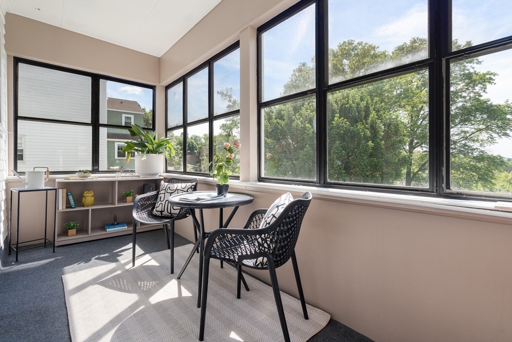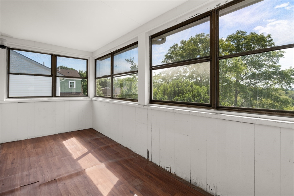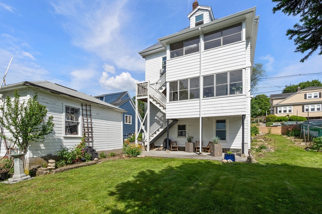 Desirable Oak Square neighborhood! A welcoming side entrance colonial with sunlit rooms, period charm and nestled on a large .26 acre lot with generous off street parking. Enter through a classic porch with haint blue beadboard ceiling, perfect for relaxing on. Living room and dining room are divided by beautiful French doors and accented with bay windows. Updated eat in kitchen features gas cooking, quartz countertops and access to a three season porch. A 3/4 bath completes the first floor. Three bedrooms, a lovely full bath and a front and back porch are found on the 2nd floor. Bonus space on the third floor includes two heated rooms with large closet. 1/2 bath and laundry room with a full window are found in the lower level. Stained glass windows, hardwood floors, high ceilings, period wood trim add to this home's character. One car garage, mature plantings and nice backyard to enjoy the outdoors. Easy commuter location close to Cambridge, Boston, Rte 90.