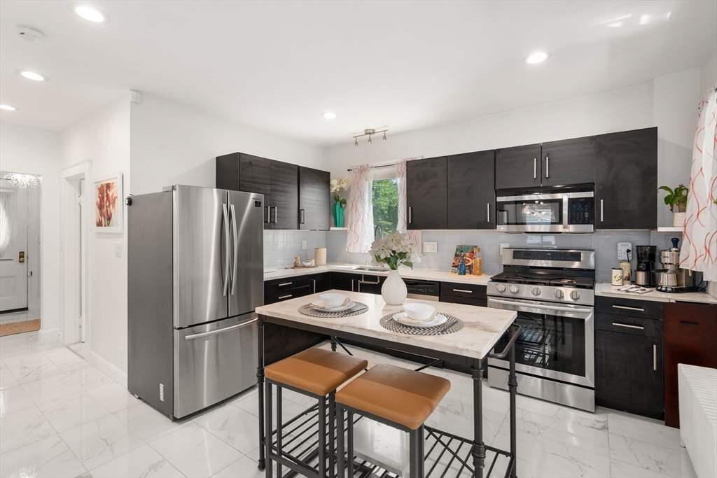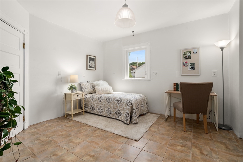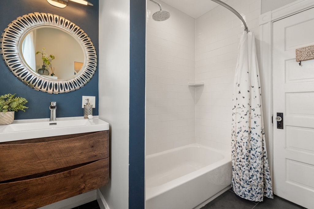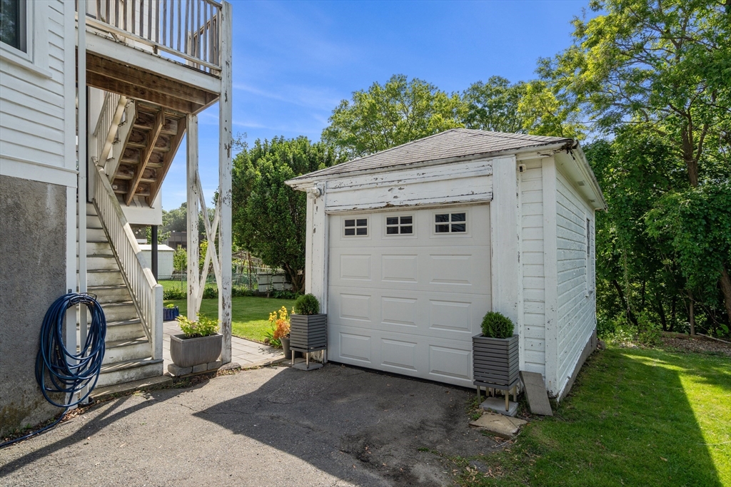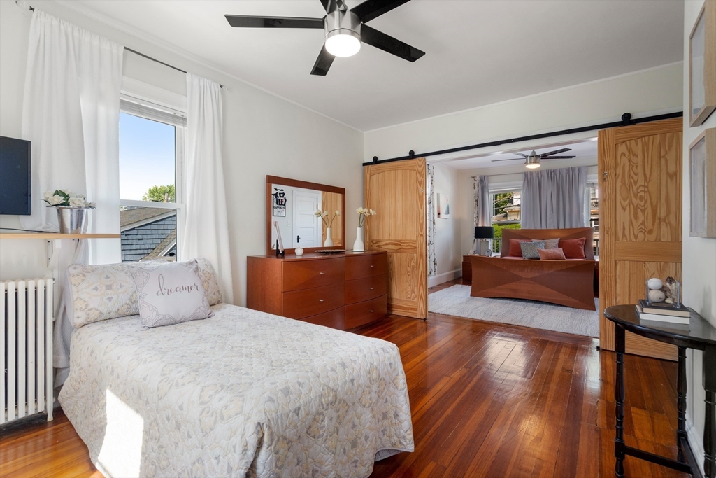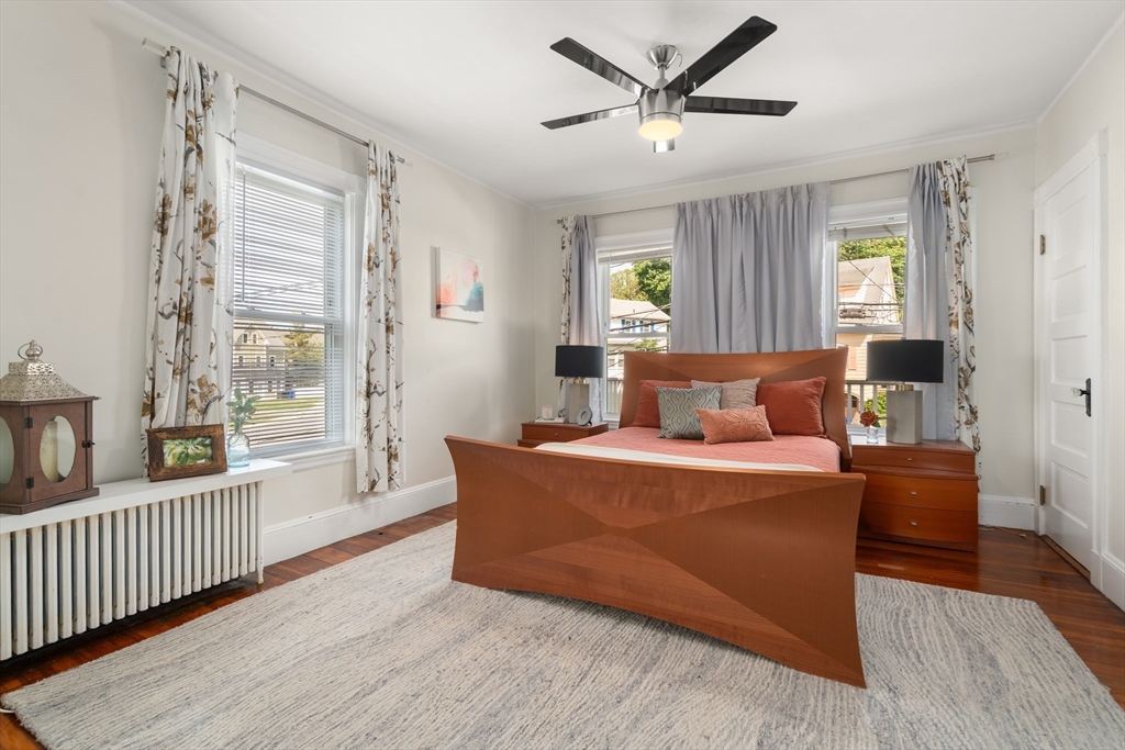 Desirable Oak Square neighborhood! A welcoming side entrance colonial with sunlit rooms, period charm and nestled on a large .26 acre lot with generous off street parking. Enter through a classic porch with haint blue beadboard ceiling, perfect for relaxing on. Living room and dining room are divided by beautiful French doors and accented with bay windows. Updated eat in kitchen features gas cooking, quartz countertops and access to a three season porch. A 3/4 bath completes the first floor. Three bedrooms, a lovely full bath and a front and back porch are found on the 2nd floor. Bonus space on the third floor includes two heated rooms with large closet. 1/2 bath and laundry room with a full window are found in the lower level. Stained glass windows, hardwood floors, high ceilings, period wood trim add to this home's character. One car garage, mature plantings and nice backyard to enjoy the outdoors. Easy commuter location close to Cambridge, Boston, Rte 90.