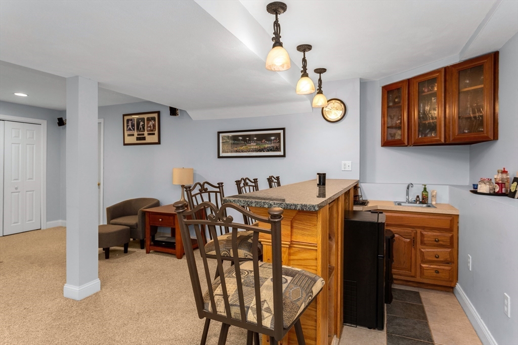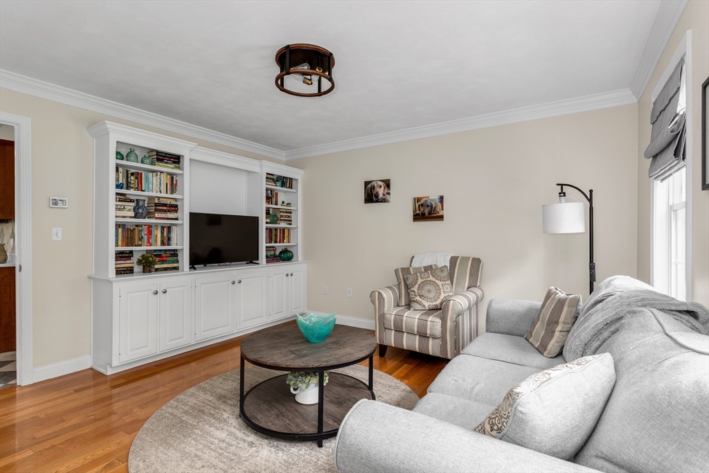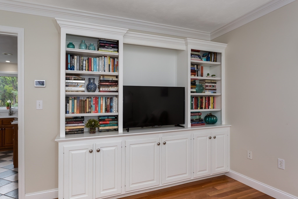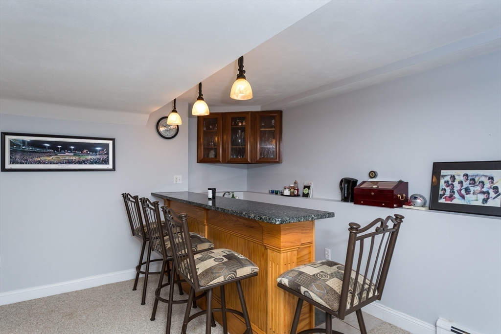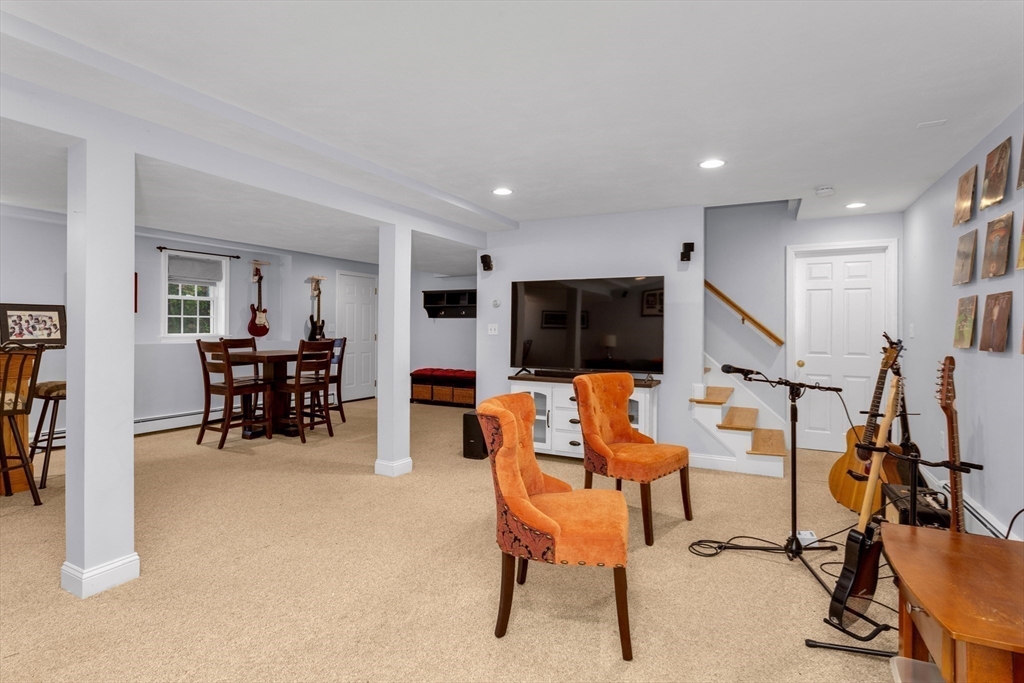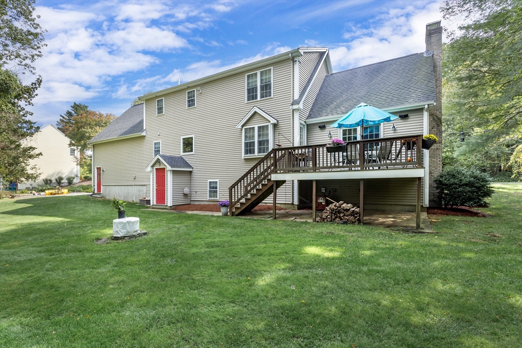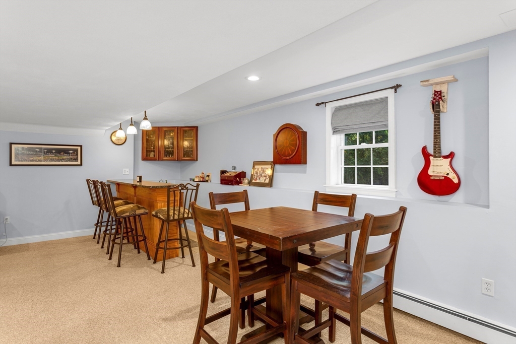 Looking for refined living in a desirable neighborhood? This 4 bedroom 3.5 bath Cape has an expansive eat-in kitchen with upgraded cherry cabinets, tiled floors, quartz counters and stainless steel appliances. It opens to a full sized dining room for maximum entertainment space and a mahogany deck for outdoor events. The open concept floor plan offers many possibilities for gatherings including a fireplaced living room to watch your favorite program or enjoy a cozy fire on a winter night. The family room, with built-in bookcases and cabinets, offers a quiet cozy area to talk quietly and relax in. Modern efficiencies with first floor laundry, new central a/c, energy efficient FHW Gas heating, Town water/sewer make for an easy to care for and comfortable home. The finished basement adds additional space for music, games, puzzles and projects. It includes a bedroom, full bathroom, a wet bar and walk-out to the backyard. Property abuts conservation land - privacy - quiet enjoyment.