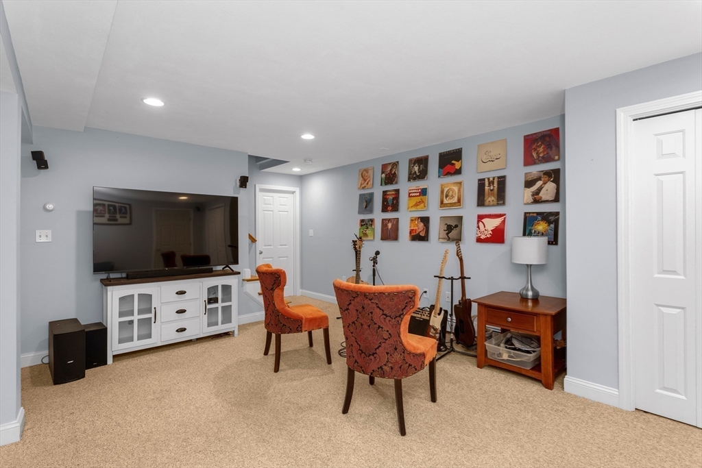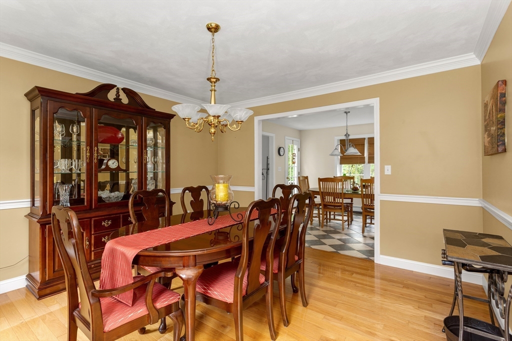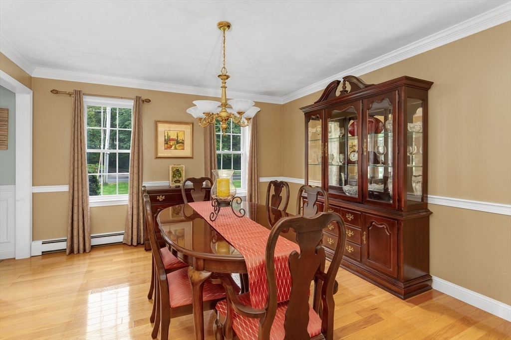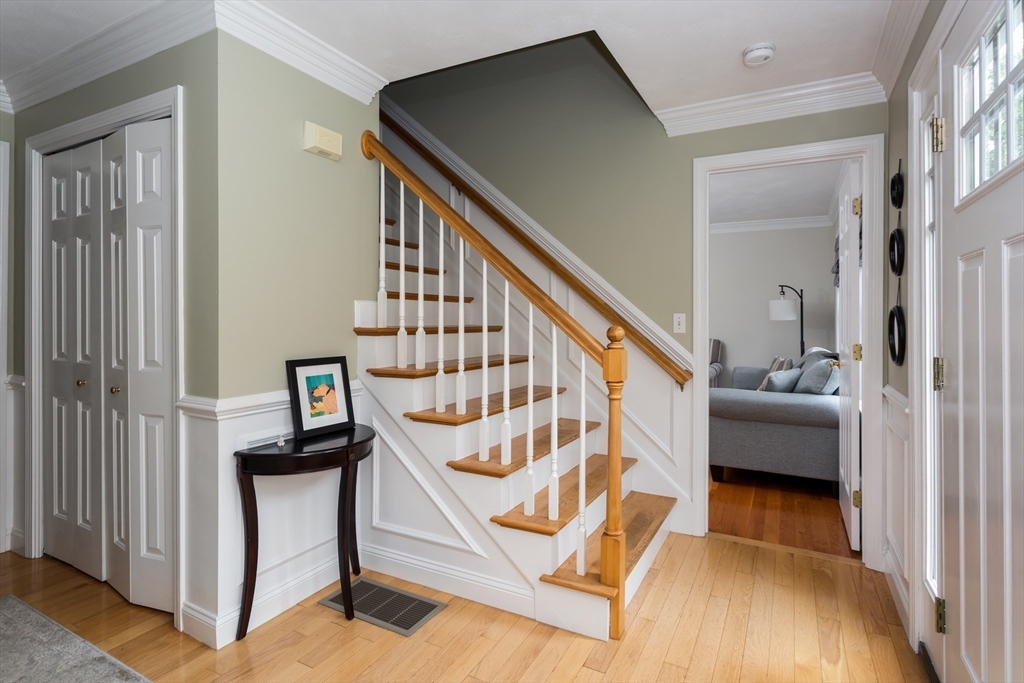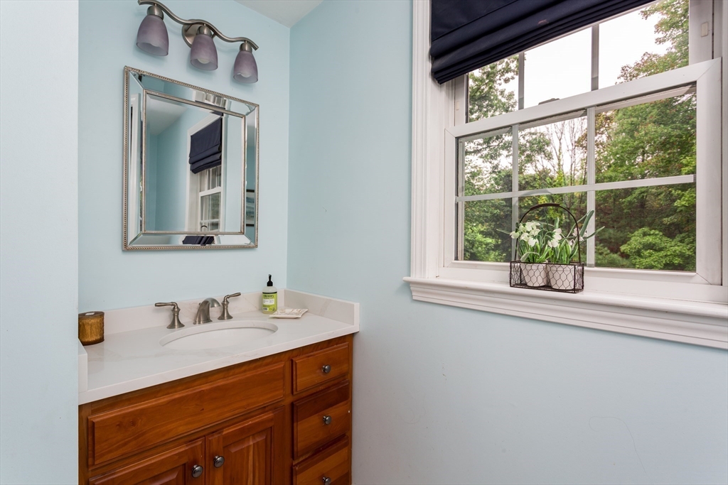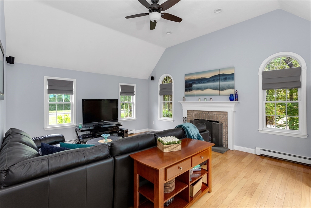 Looking for refined living in a desirable neighborhood? This 4 bedroom 3.5 bath Cape has an expansive eat-in kitchen with upgraded cherry cabinets, tiled floors, quartz counters and stainless steel appliances. It opens to a full sized dining room for maximum entertainment space and a mahogany deck for outdoor events. The open concept floor plan offers many possibilities for gatherings including a fireplaced living room to watch your favorite program or enjoy a cozy fire on a winter night. The family room, with built-in bookcases and cabinets, offers a quiet cozy area to talk quietly and relax in. Modern efficiencies with first floor laundry, new central a/c, energy efficient FHW Gas heating, Town water/sewer make for an easy to care for and comfortable home. The finished basement adds additional space for music, games, puzzles and projects. It includes a bedroom, full bathroom, a wet bar and walk-out to the backyard. Property abuts conservation land - privacy - quiet enjoyment.