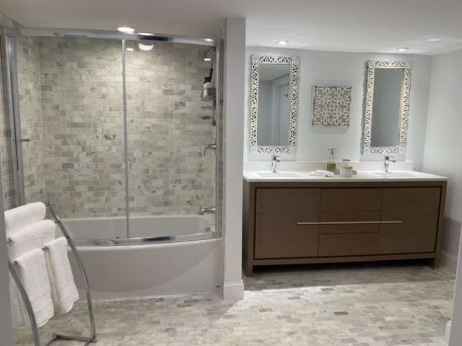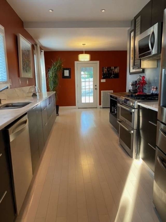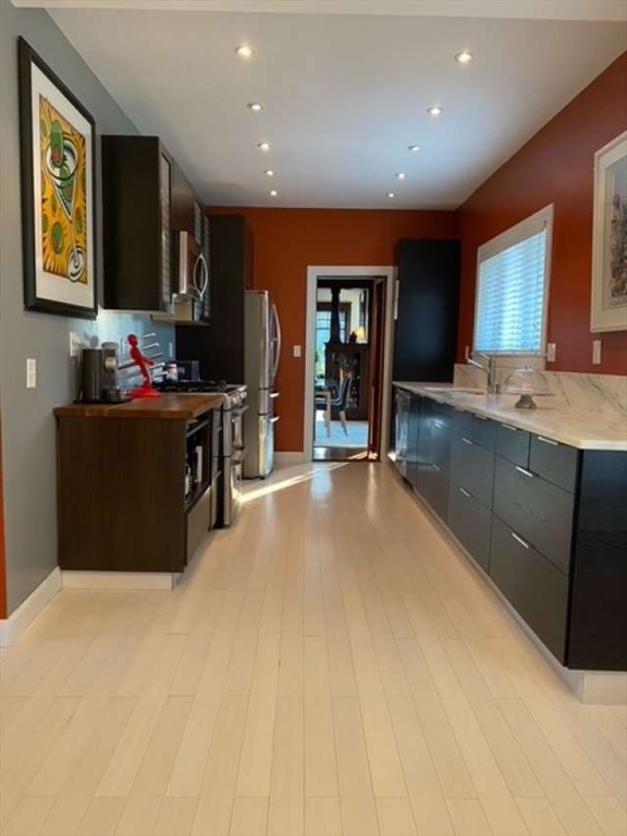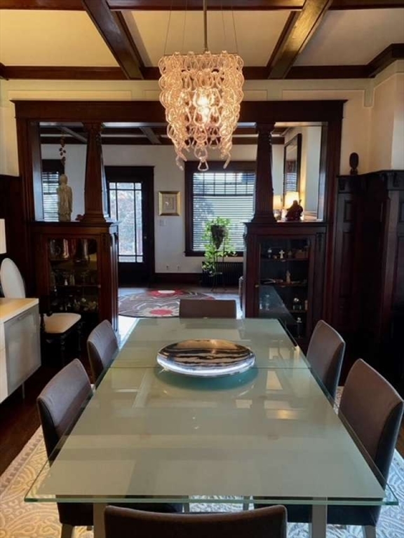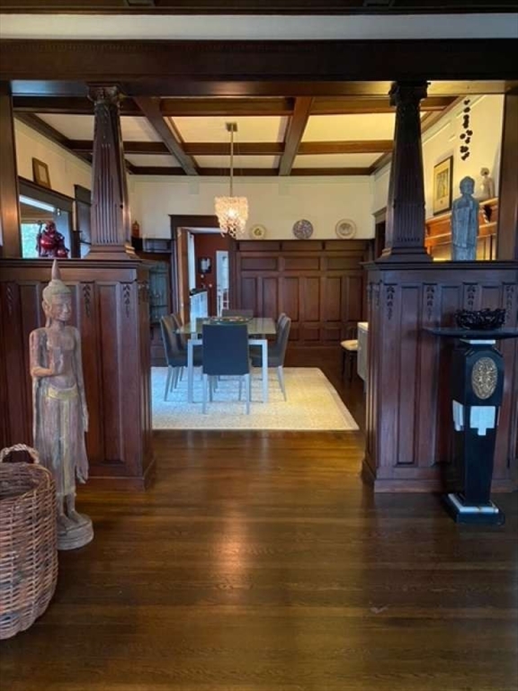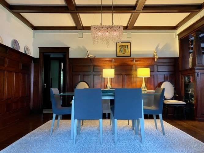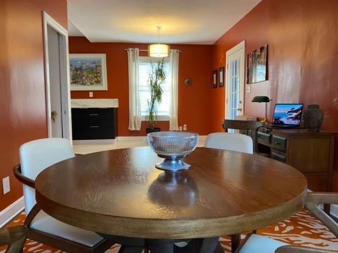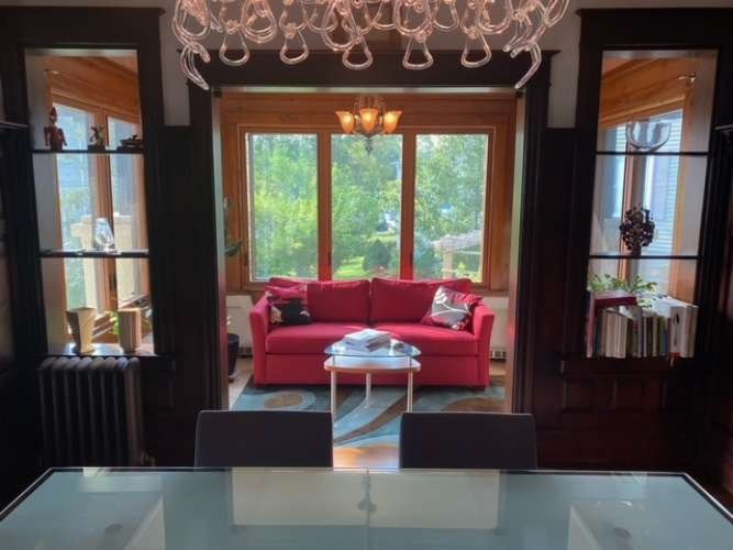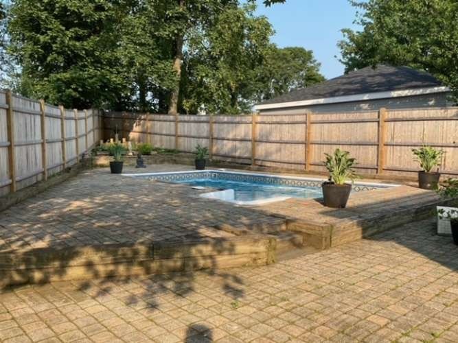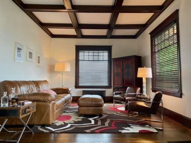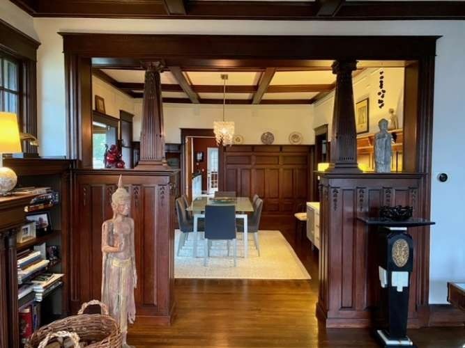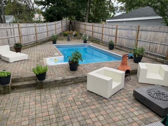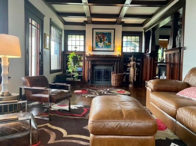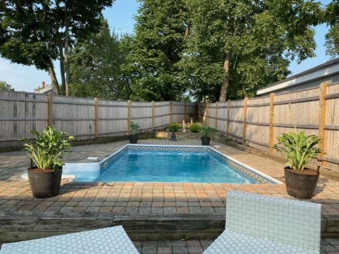 A bungalow with traditional Craftsman touches—wide overhanging eaves, tapered porch posts, pitched roof Inside, the home retains much of its original woodwork: rich oak with built-in cabinetry, window and door casings with decorative moulding, wainscoting and a fireplace mantel in living room. classic details are complemented by contemporary updates—recessed lighting, updated fixtures, clean painted trim, more open sight-lines between rooms, and modern finishes—so you get comfort without losing character. With 3 bedrooms and 2 bathrooms, the layout is cozy but smart: main floor with living room, dining room, and kitchen; 2 bedrooms upstairs 1 downstairs. The bathrooms are modernized—marble and subway tile,an inground pool set into a modestly sized but private yard—ideal for summer afternoons, There is also an attached one-car garage, which blends with the architecture so it doesn’t feel tacked on, but part of the whole home.
