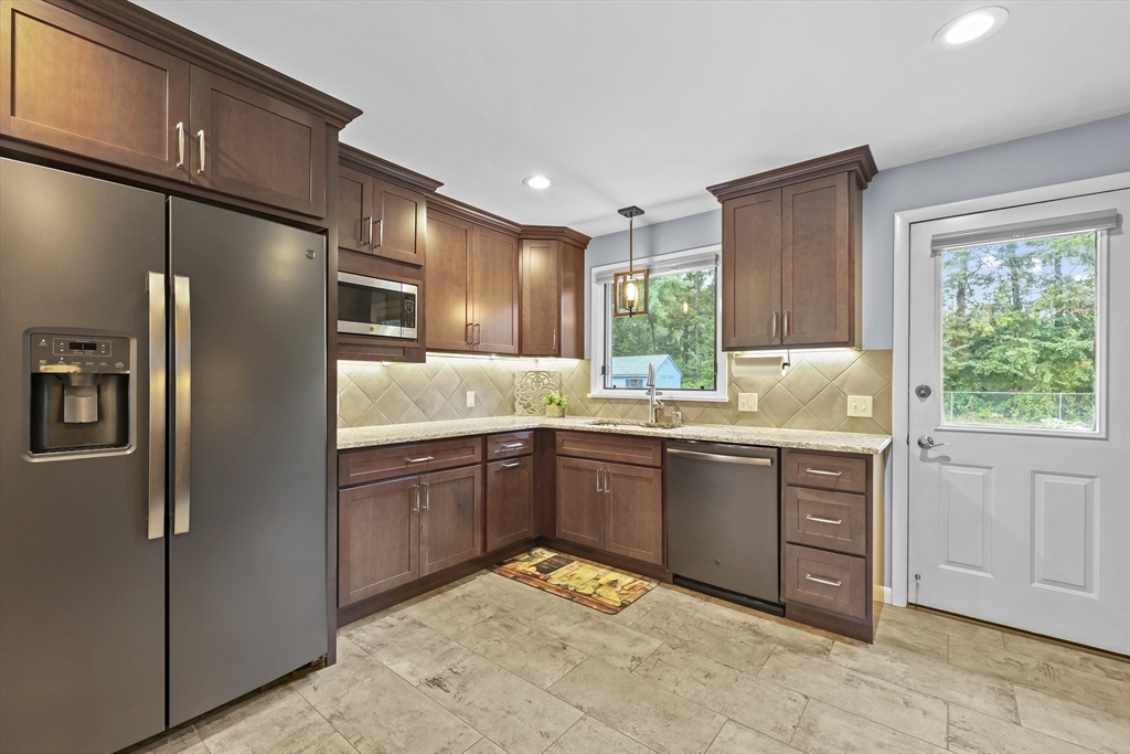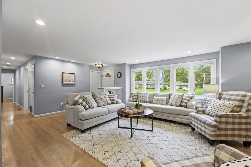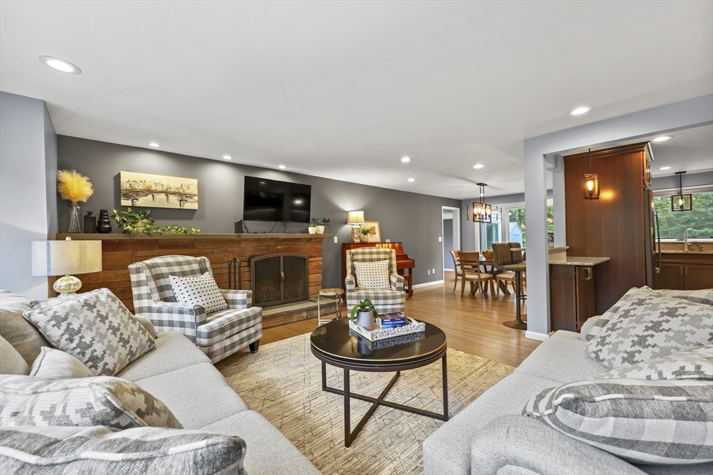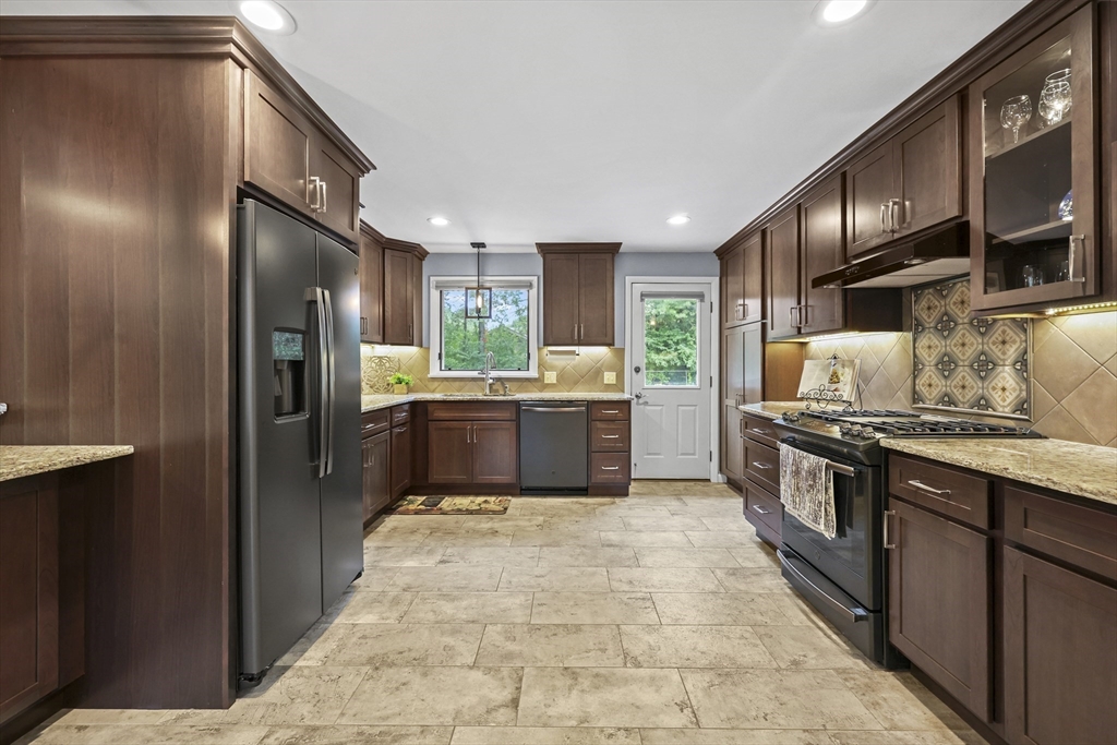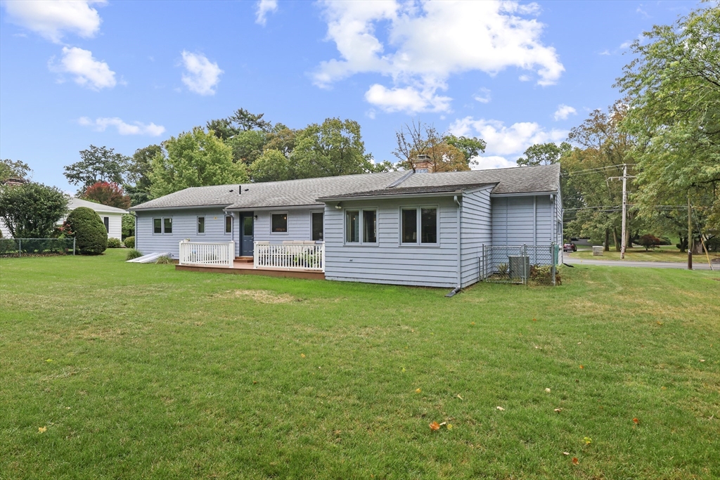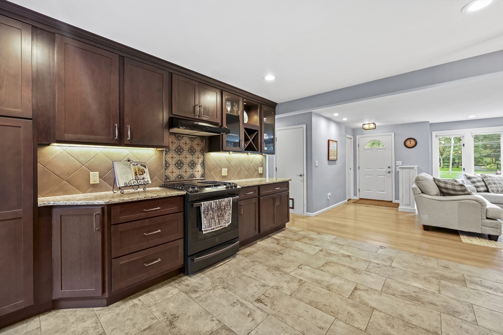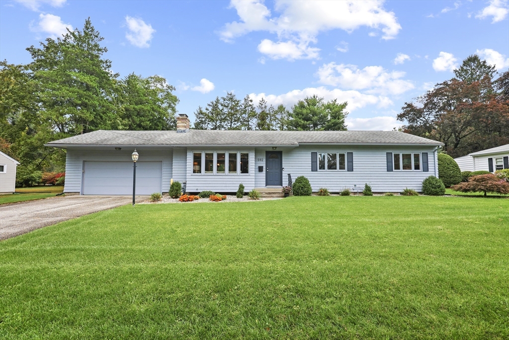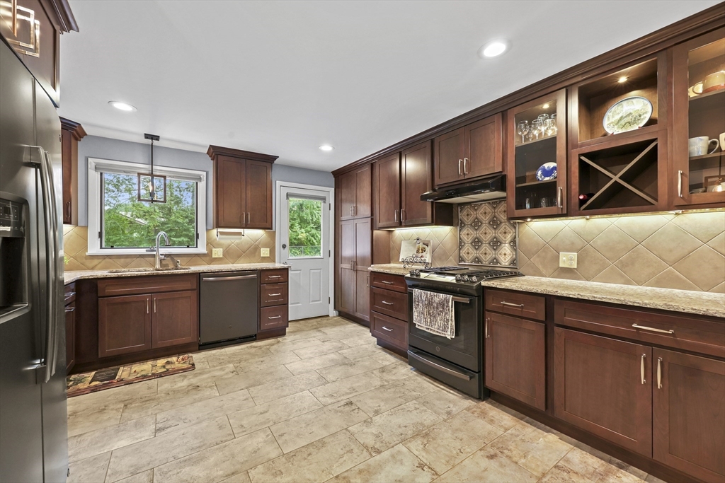 Renovated ranch, nestled in heart of town, offers perfect blend of modern luxury & timeless charm. Prime central location ensures convenience, while functional floorplan maximizes space & natural light. Refinished hardwood floors & generous, light-filled living spaces create warm & welcoming atmosphere. Living room showcases striking fireplace w/stacked stone surround, seamlessly flowing into dining room & renovated kitchen. Gourmet kitchen features Kraftmaid cabinetry, granite, tiled backsplash, black stainless-steel appliances, undercabinet lighting & charming breakfast bar. Family Room offers slider opening to composite deck & large, level backyard w/storage shed. Primary Suite includes double closet & luxurious bath w/corner shower featuring frameless glass door. Two additional bedrooms w/double closets are serviced by large full bath w/expansive vanity w/ linen tower. Lower level has finished room, ideal for recreation, plus unfinished area w/laundry hookups & ample storage.