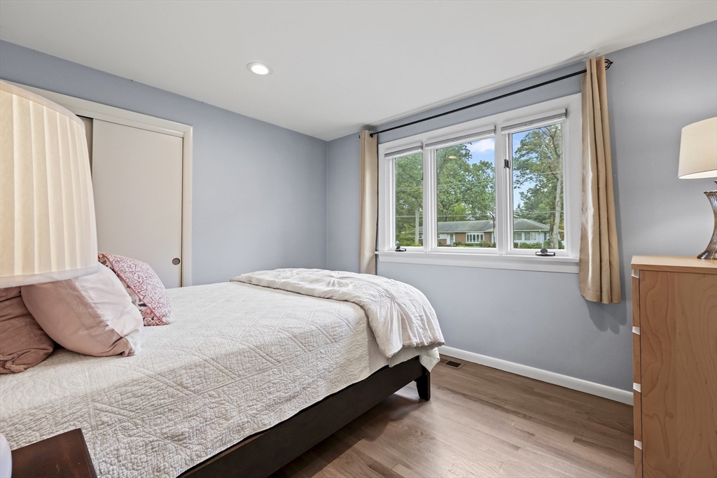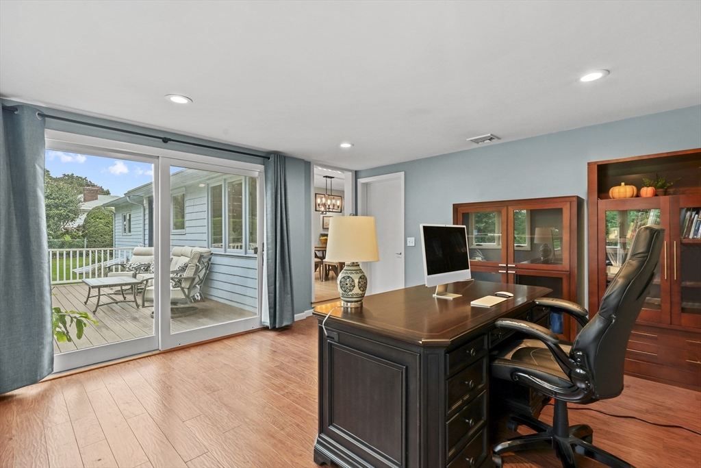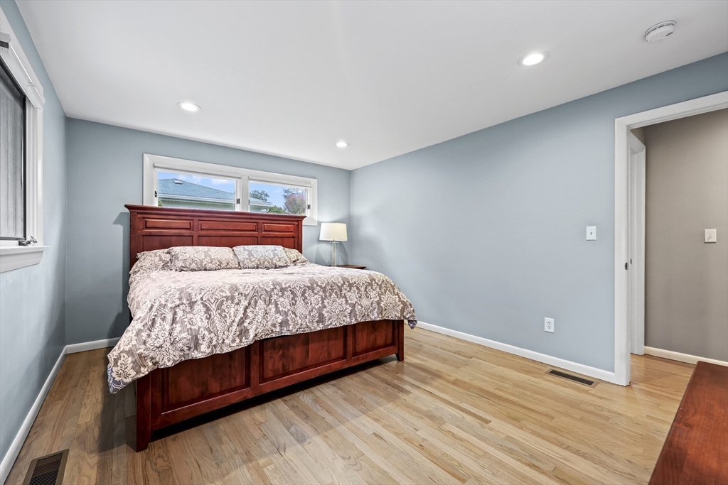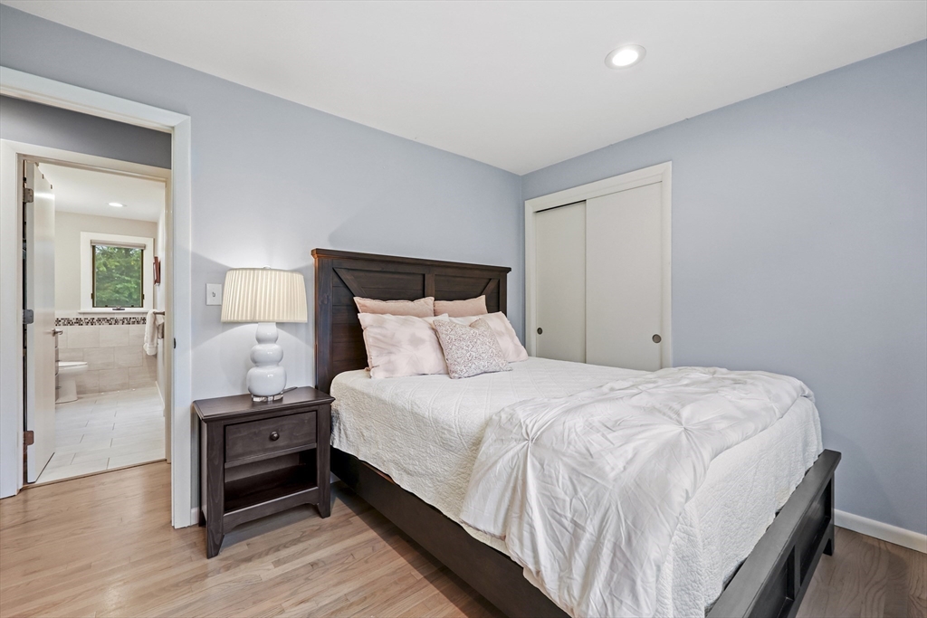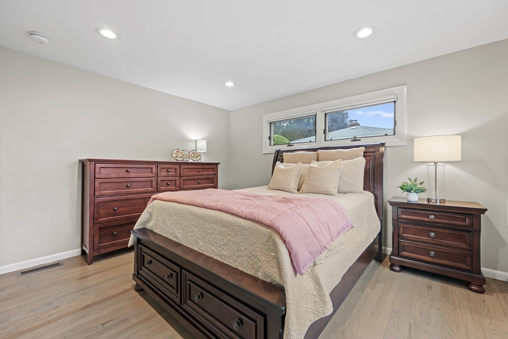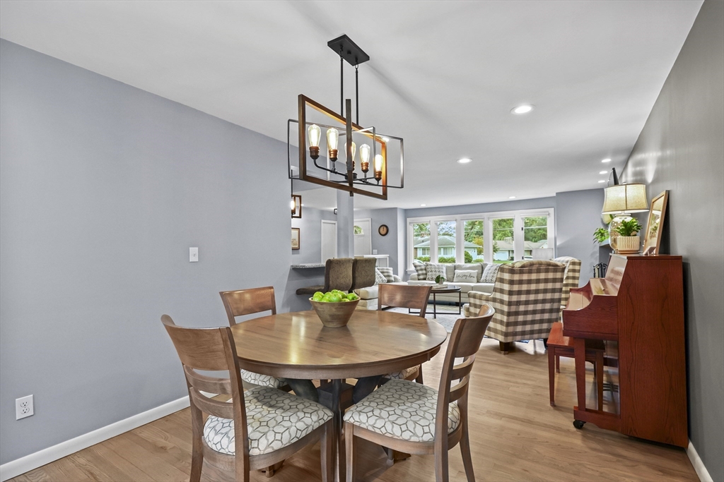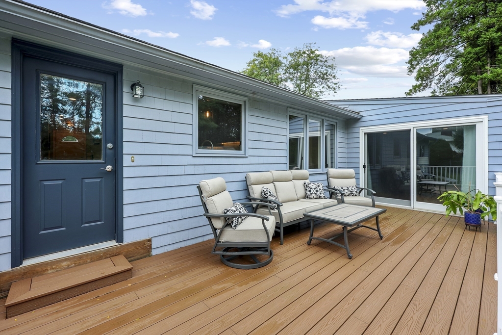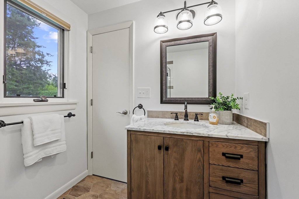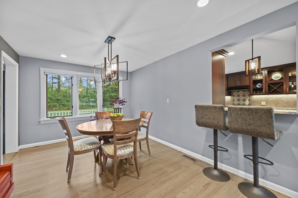 Renovated ranch, nestled in heart of town, offers perfect blend of modern luxury & timeless charm. Prime central location ensures convenience, while functional floorplan maximizes space & natural light. Refinished hardwood floors & generous, light-filled living spaces create warm & welcoming atmosphere. Living room showcases striking fireplace w/stacked stone surround, seamlessly flowing into dining room & renovated kitchen. Gourmet kitchen features Kraftmaid cabinetry, granite, tiled backsplash, black stainless-steel appliances, undercabinet lighting & charming breakfast bar. Family Room offers slider opening to composite deck & large, level backyard w/storage shed. Primary Suite includes double closet & luxurious bath w/corner shower featuring frameless glass door. Two additional bedrooms w/double closets are serviced by large full bath w/expansive vanity w/ linen tower. Lower level has finished room, ideal for recreation, plus unfinished area w/laundry hookups & ample storage.