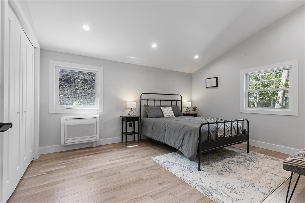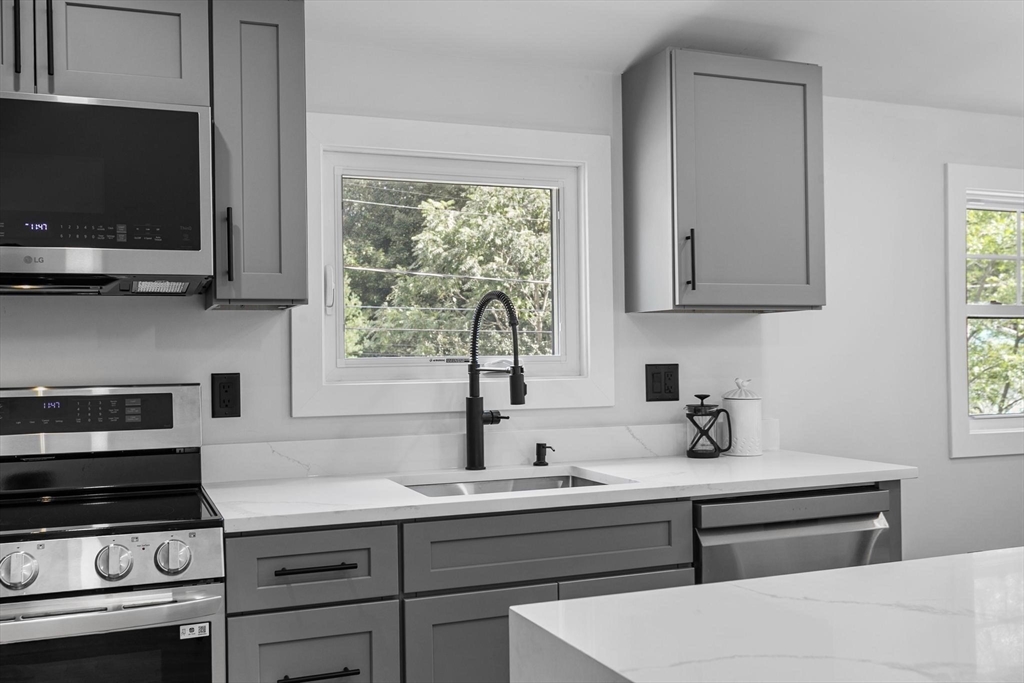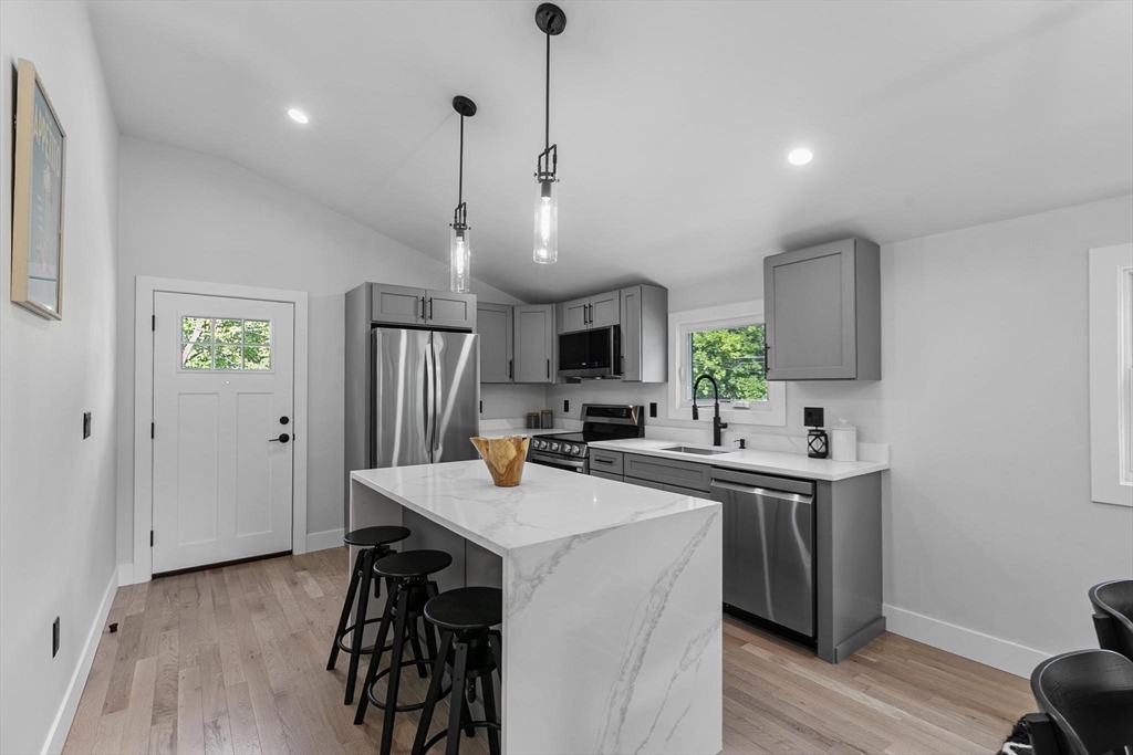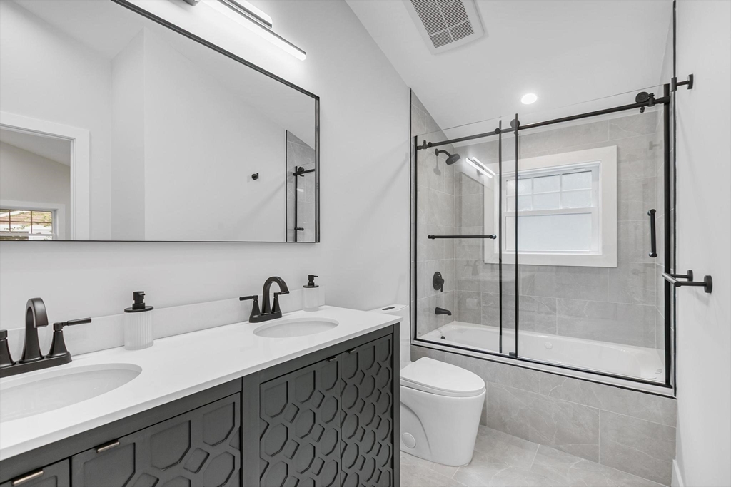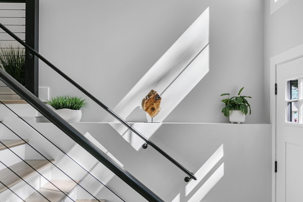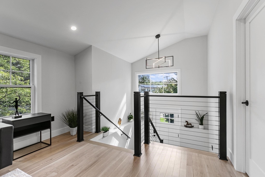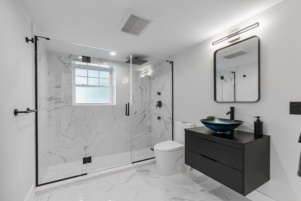 A one-of-a-kind, lofty home rebuilt from studs to finish, where modern architectural design, luxury and sophistication meet convenience, technology and thoughtful energy conservation. Walk in and be greeted by dramatic esthetics with soaring 16’ cathedral ceilings at foyer’s peak and a stunning open concept throughout the main level. Enjoy your culinary haven with custom cabinetry, LG appliances and island bar adorned with waterfall quartz countertop. Indulge in SPA-like baths with multi-jet and rainfall showers, whirlpool tub and top-tier designer vanities. Walk barefoot on posh maple hardwood beautifying both floors. Control your high-efficiency, multi-zone Fujitsu heating & cooling from your phone. A versatile den provides add’l. space for a guest room, office & home theater. Relax in your oasis graced by manicured outdoors, paver patio and 2-car driveway with EV charger. In the heart of Stony Brook reservation, near parks, trails, golf course, Legacy Place, commuter rail and i-93.