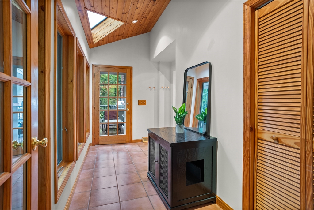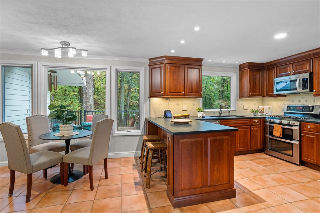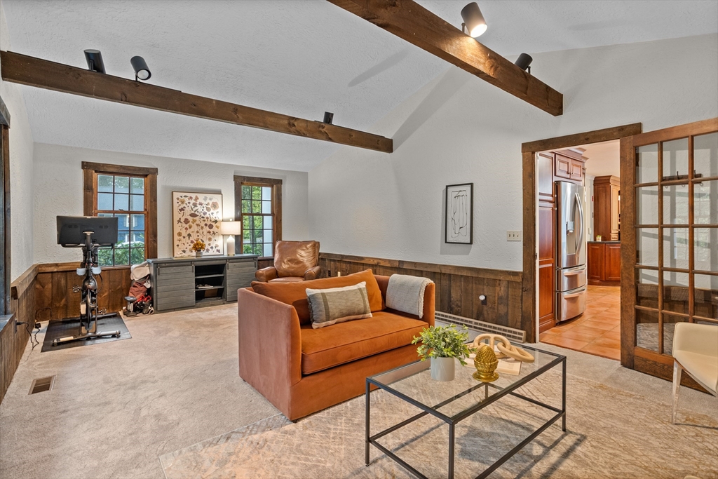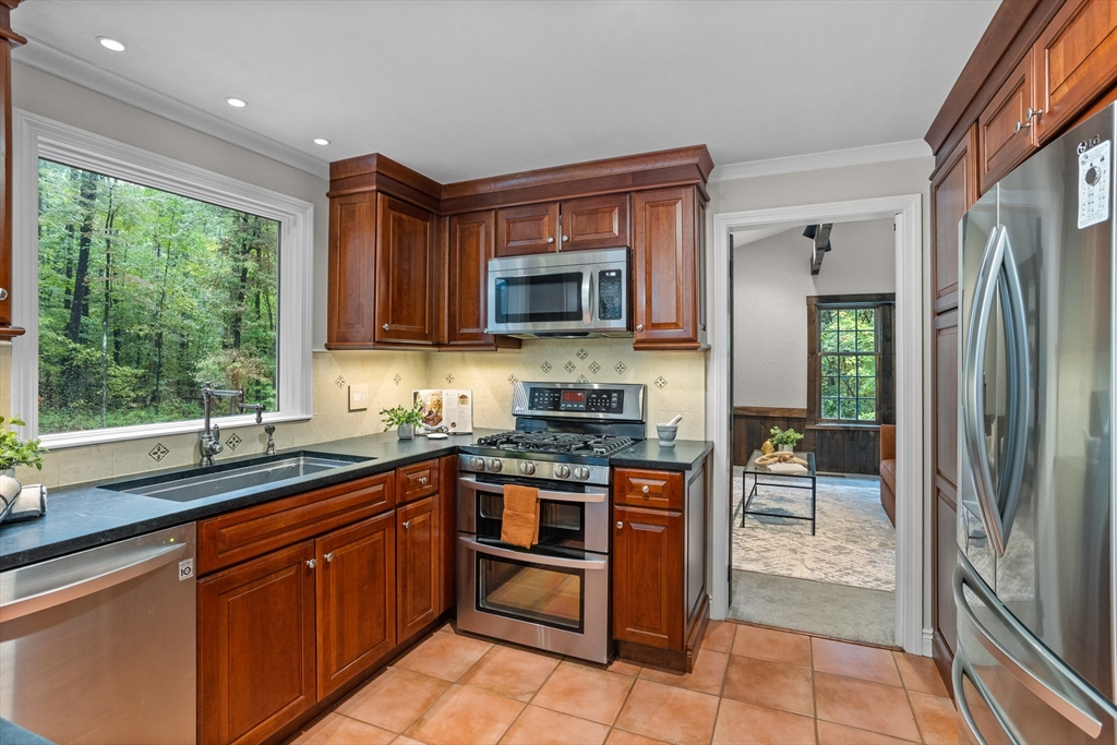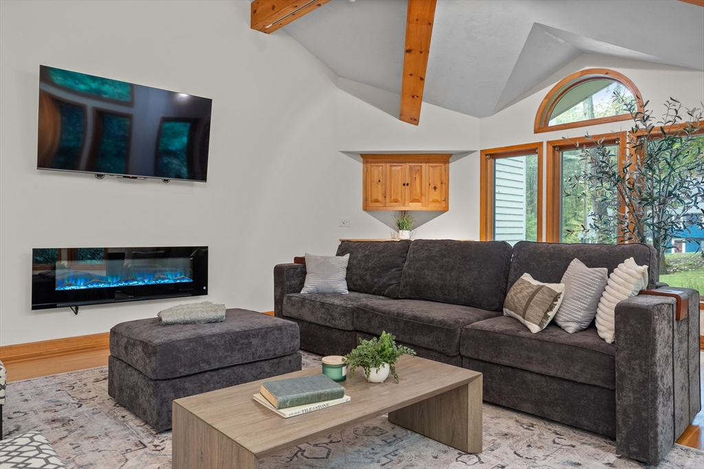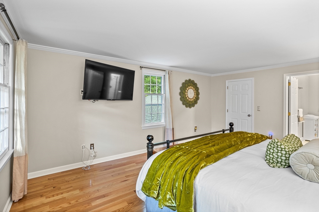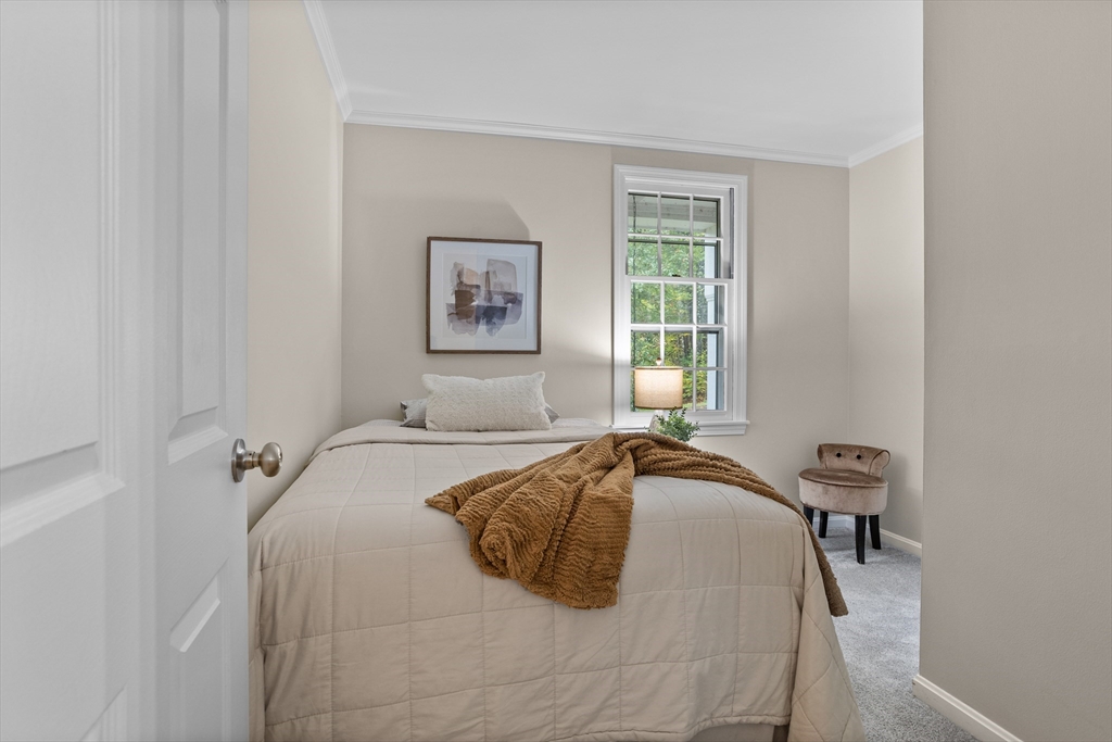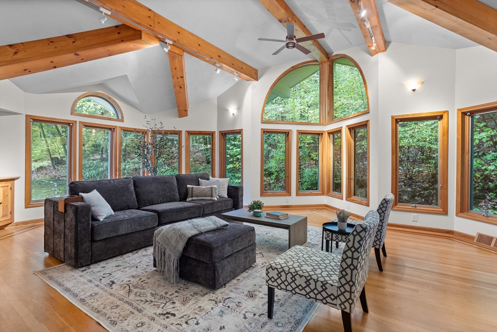 Welcome to this timeless 2800 square foot, 4 bedroom 2.5 bathroom residence with a stately brick face colonial accented by grand columns. Nestled on a serene cul-de-sac and surrounded by a natural wooded backdrop, this property offers ample privacy while still providing convenient access to local amenities, schools, and commuter routes. Located within 10 minutes of both 495 and the center of Groton. This home invites you to imagine life lived at its finest. Living room has wide pine floors. Soapstone counters accent the kitchen with cherry cabinetry, and built-in desk. The home also offers a spacious family room with beamed ceiling, built-ins, and gas fireplace opposite a unique ten-sided great room with abundant natural light and an additional electric fireplace. A large deck overlooks a private and wooded backyard. Mechanicals were updated in 2018 along with full house generator installed 2023. Septic was new as of 2021. 2 stall garage under new doors for convenient entry into home.