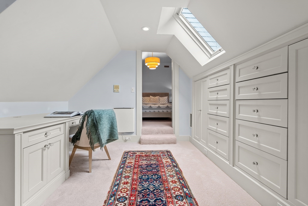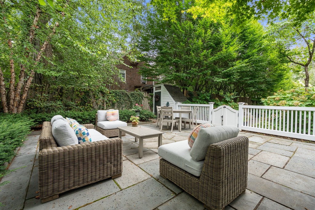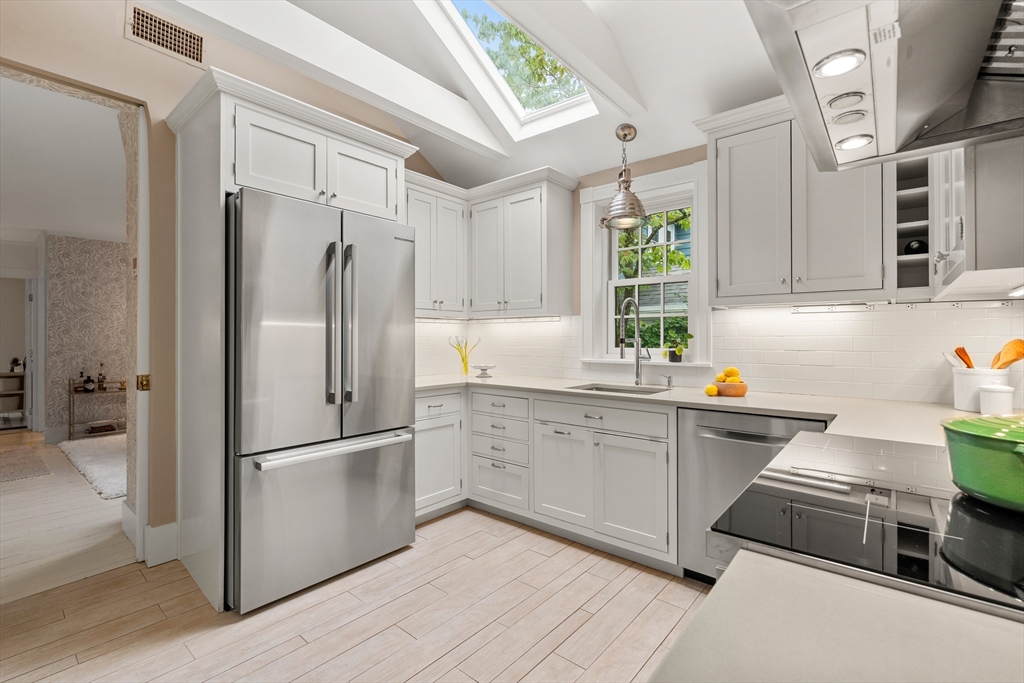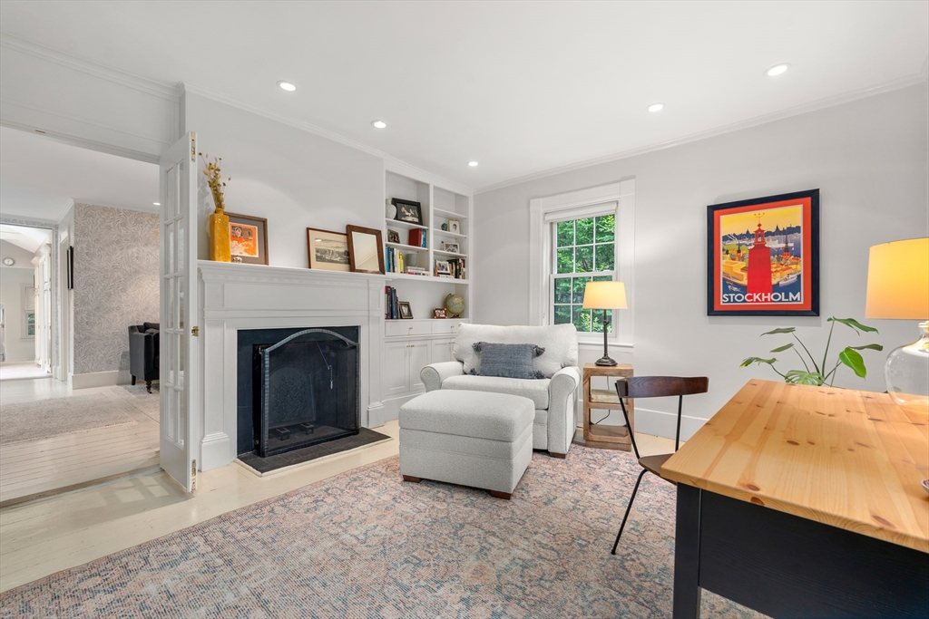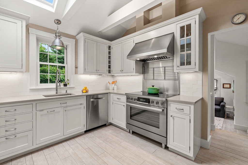 This meticulously renovated home offers fine features like custom millwork and skylights that enhance its period charm while adding contemporary style and comfort. The open-concept first floor showcases well-proportioned rooms laid out for easy indoor-outdoor entertaining. Off the foyer is a formal living room with a decorative fireplace and floor-to-ceiling built-ins. The dining room has two china closets and a striking floor-to-ceiling window. A gourmet kitchen features a beamed cathedral ceiling, tall cabinets, an induction stove, and access to the deck and enclosed stone patio. The 21' family room has a gas fireplace, and there’s an 18' sunken media room with a double-height vaulted ceiling. Upstairs, the serene primary wing offers an outfitted office/dressing room, walk-in closet, and en-suite bath. Another bed/bath suite is also on this floor. Sited between the Radcliffe Quadrangle and Raymond Park, the home is located less than a mile to both Harvard Yard and Fresh Pond.