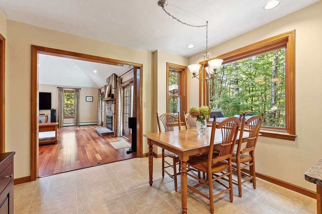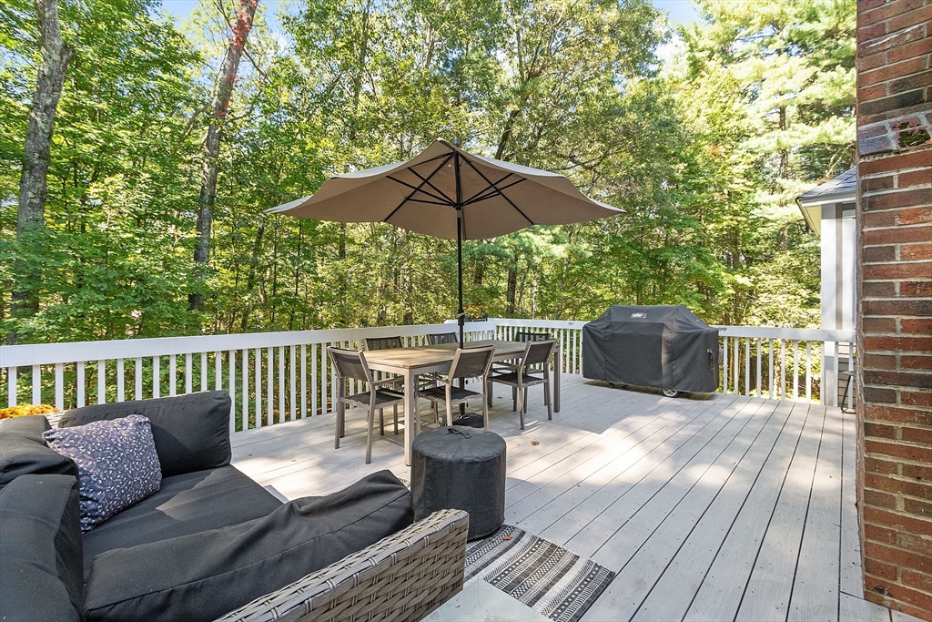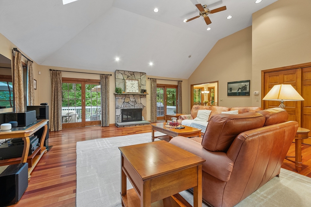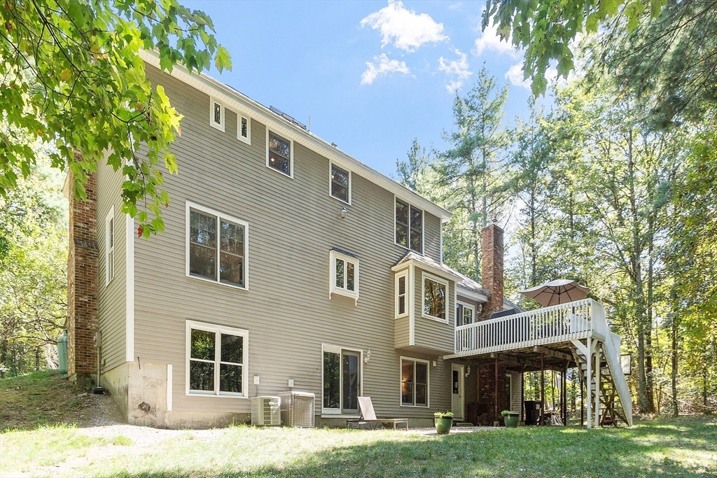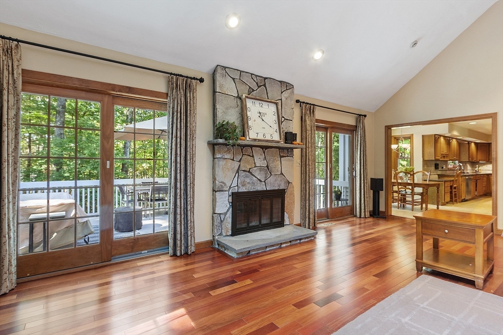 Welcome to this beautifully maintained home where comfort, thoughtful design, and location come together. The expansive family room features hardwood floors, a fieldstone wood-burning fireplace, and two sliders to an oversized deck—perfect for entertaining or quiet mornings. The efficient eat-in kitchen offers charm and convenience. The formal dining room with hardwood floors suits both casual meals and special occasions. A front-to-back living room includes French doors and a gas fireplace for added warmth. Upstairs, the cathedral-ceiling primary suite offers an updated ensuite bath and walk-in closet, plus three additional spacious bedrooms and a full bath. The partially finished walk-out lower level to a patio provides flexible space for an office, gym, or playroom. With proximity to the Harvard track and playground, this inviting home is ready to support your lifestyle inside and out.