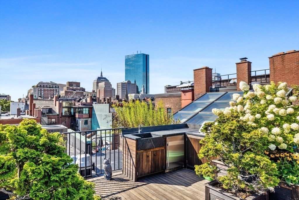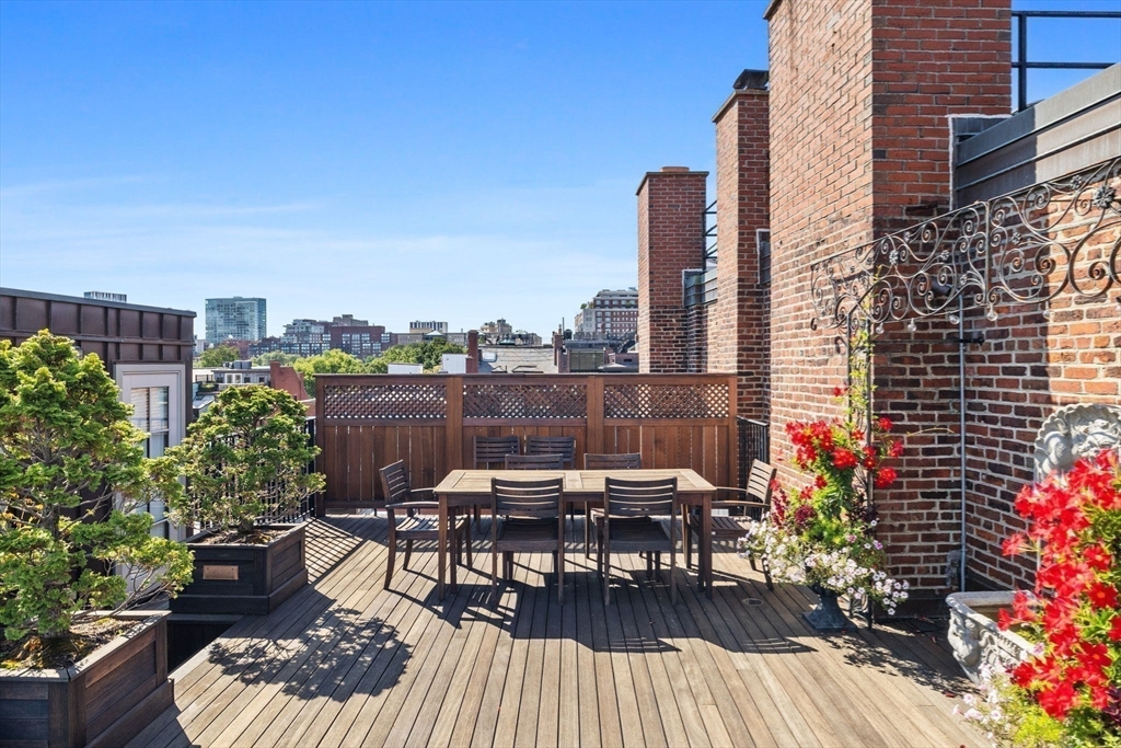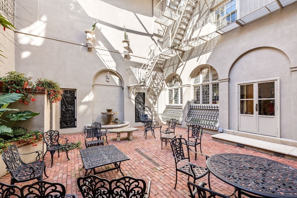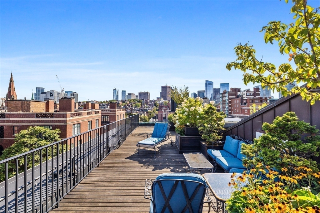Reminiscent of a classic Venetian palazzo, 142 Chestnut is the former Mansion of famed Boston architect Henry Forbes Bigelow and is located on one of the most desirable streets on the Flat of Beacon Hill. A stunning, Italian-Renaissance inspired brick courtyard graces the center of the building and is complete with a water fountain and lush, green plantings. The Penthouse Residence is a magnificent 4-bed, 3.5-bath home offering just under 3,000 square feet of living space all on one level with direct elevator access. Refined architectural design throughout the home reflects timeless European elegance with custom features such as coffered wood beam ceilings, oversized windows, expertly crafted oak built-ins, handsome hardwood flooring and ornate wrought-iron light fixtures. A spectacular roof deck offers panoramic views of the Charles River, Beacon Hill and Back Bay skyline. Steps from all Beacon Hill has to offer, this magnificent property includes 1 garage parking space.