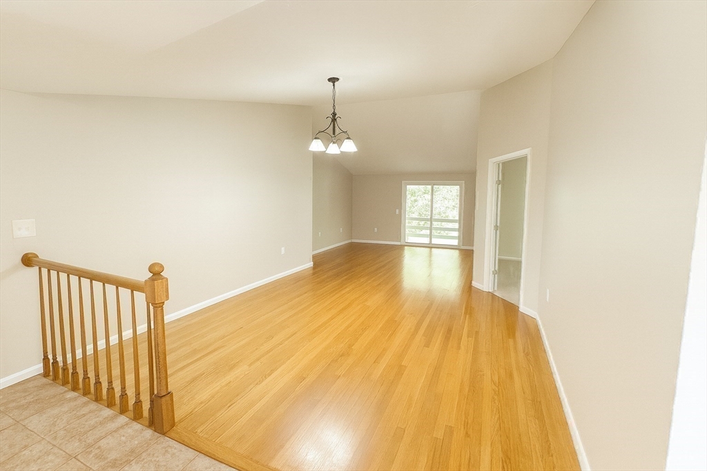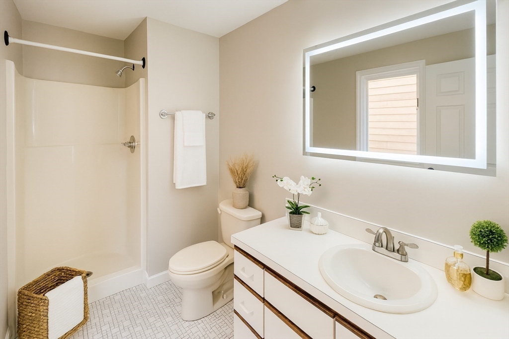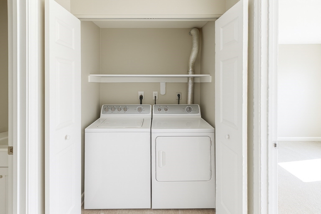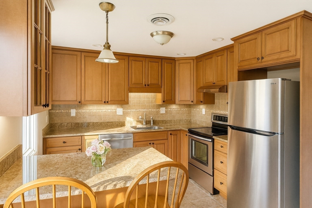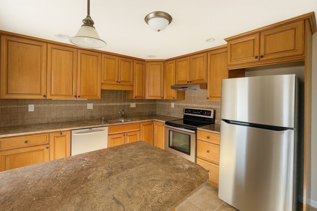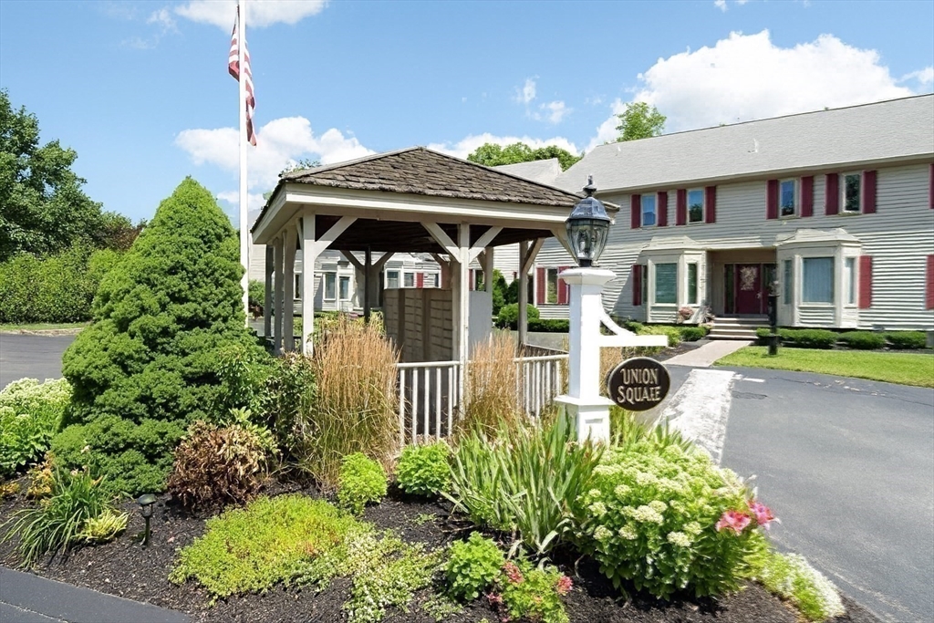 Welcome to 46 Union Square! This freshly painted 2-bedroom, 2-bath condo offers 1,056 sq. ft. of comfortable, move-in ready living. The open concept living and dining room features vaulted ceilings, hardwood floors, and sliders to a spacious 10x23 porch perfect for entertaining or relaxing. The updated kitchen is appointed with stainless steel appliances, granite countertops, recess lighting, bar-style under-cabinet lighting and a peninsula that serves as both a convenient eating area and added workspace. Brand-new carpet adds comfort to the bedrooms, including a generous primary suite with en-suite bath, ample closet space, and its own sliders opening to the porch. The second bedroom offers two closets, providing plenty of storage. Added conveniences include in-unit laundry, central A/C, extra basement storage 20x15 and assigned parking. Residents can also enjoy a community swimming pool. Ideally located just minutes from shopping, restaurants, commuter rail, and major highways.