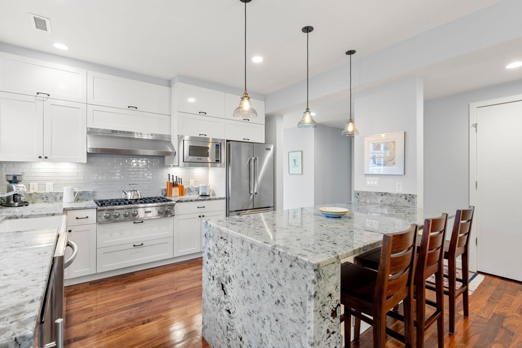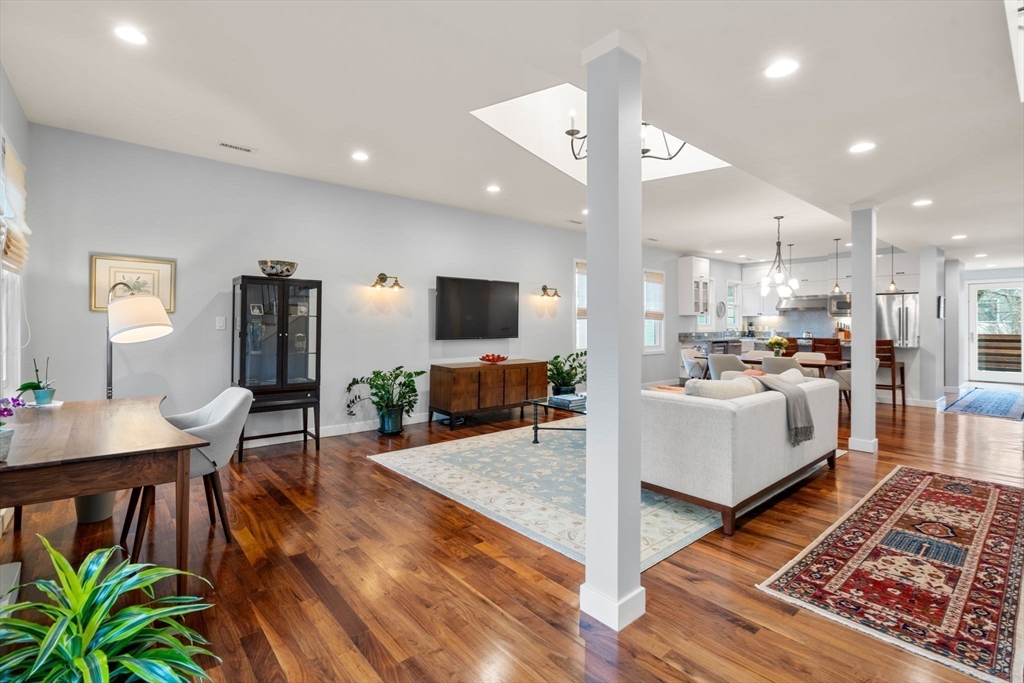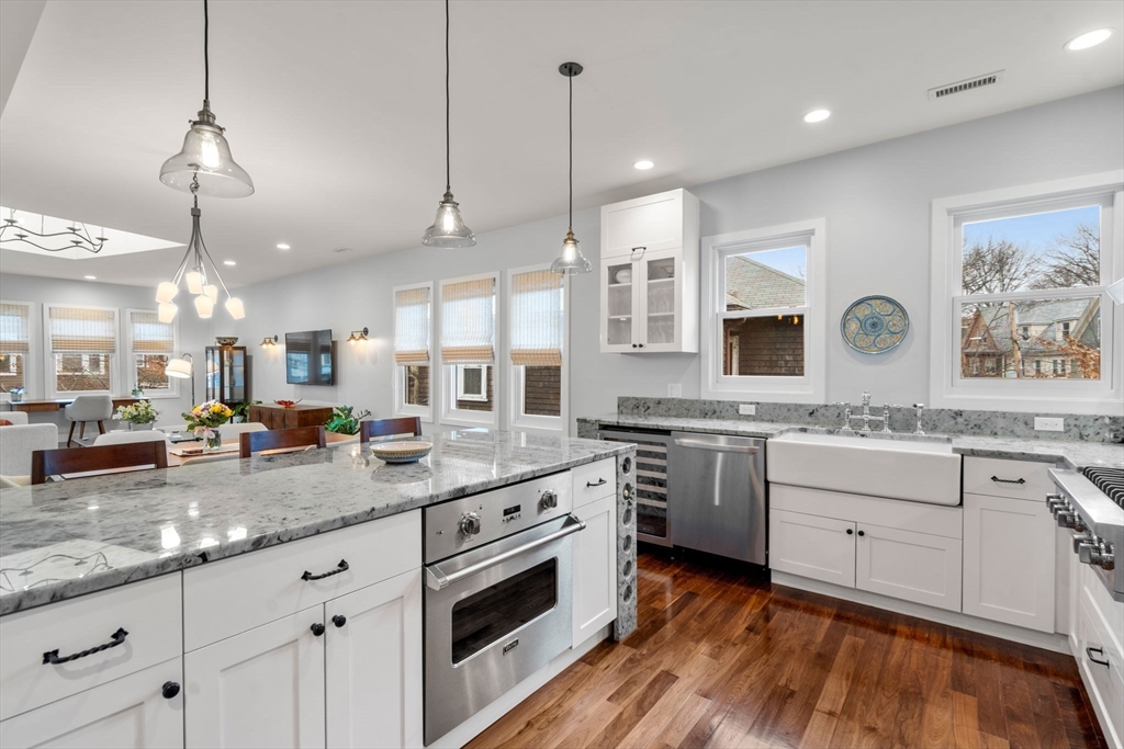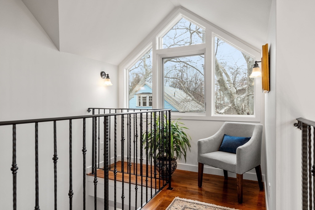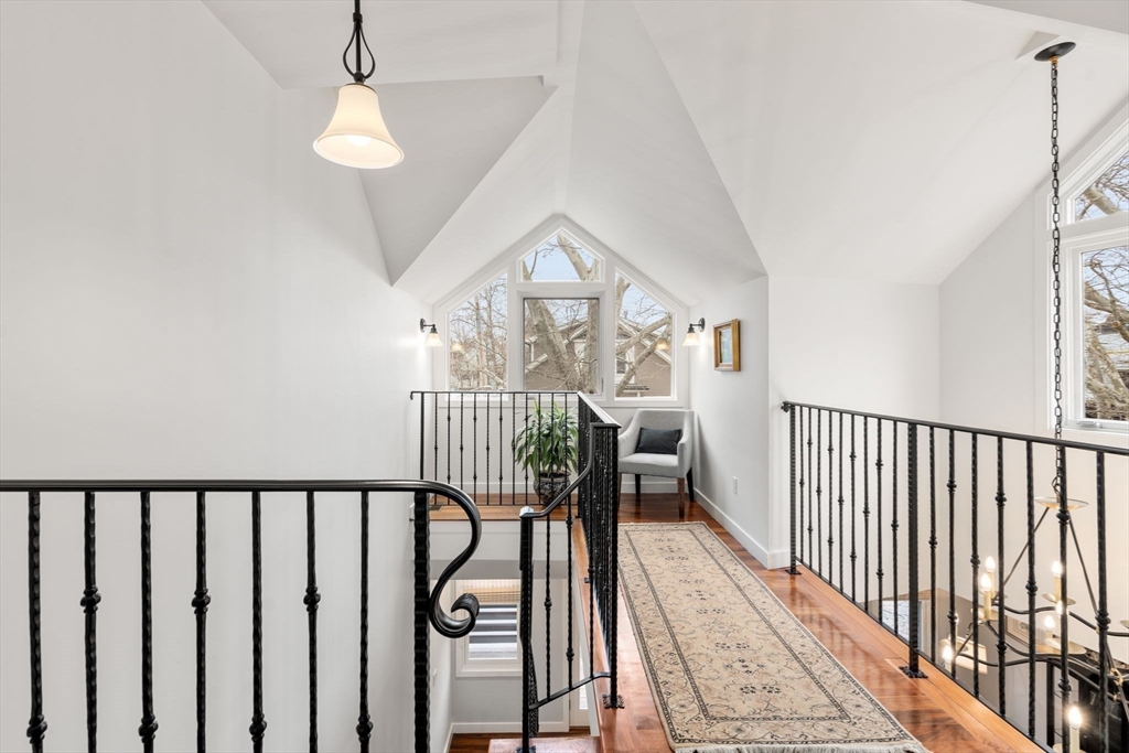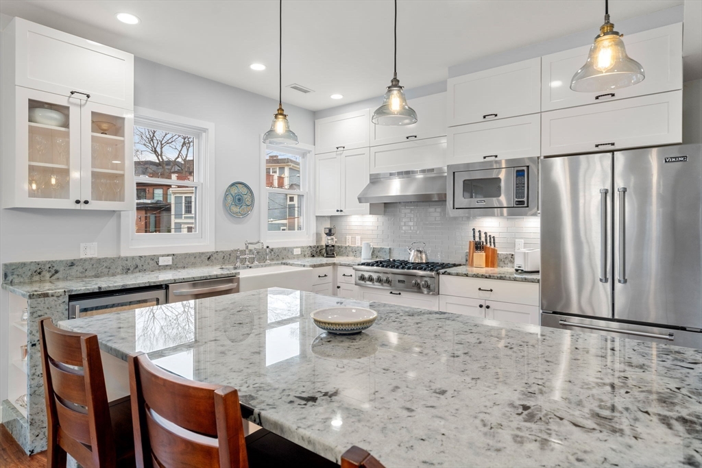 This beautiful top level condominium on historic Beals Street in Coolidge Corner is located in one of Brookline’s most coveted and convenient locations. The home is moments to shops, restaurants, the MFA, Fenway Park, Cambridge, Back Bay and the Charles River. This exquisitely renovated 5 bed/3 bath condo is drenched in natural light with soaring cathedral ceilings and fine craftsmanship throughout. The chef’s kitchen boasts Viking and LG appliances, an Italian granite island, and wine fridge, flowing seamlessly into expansive living and dining areas perfect for entertaining or relaxing with family and friends. The top-floor primary suite offers treetop views, spa bath with soaking tub, marble shower, heated floors, and custom walk-in closet. Three mahogany decks, 2 parking spaces, 2-zone central A/C, mudroom, and a finished lower level bonus room complete this rare offering with the space, style, comfort, convenience, and location buyers dream of.