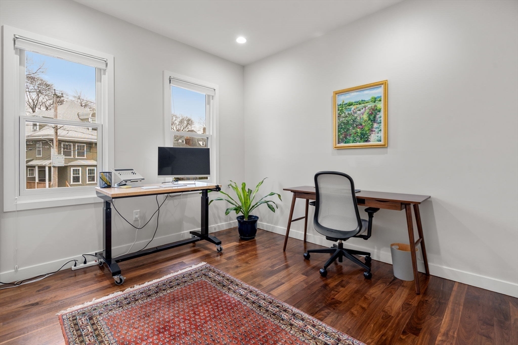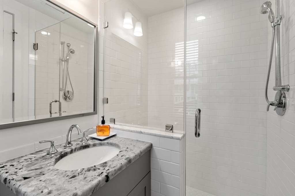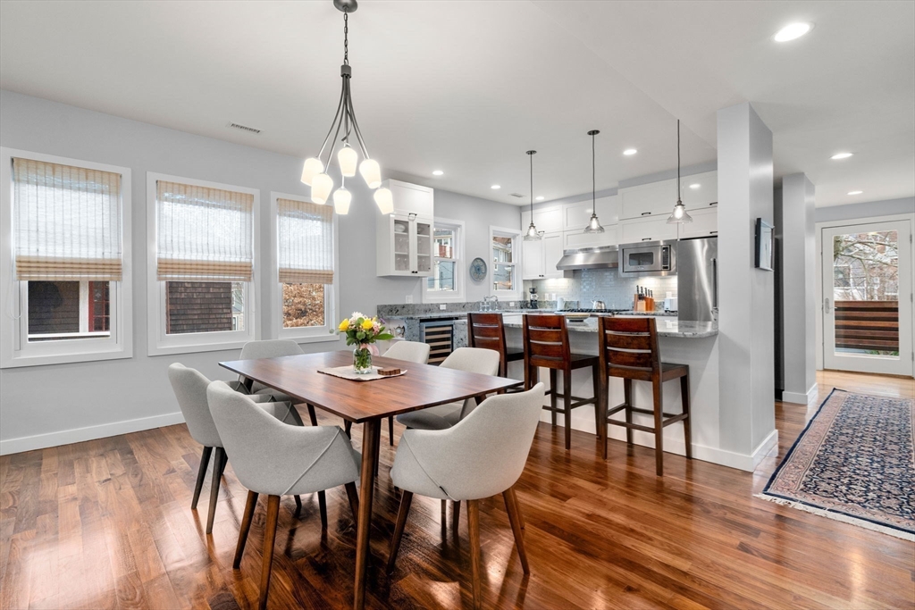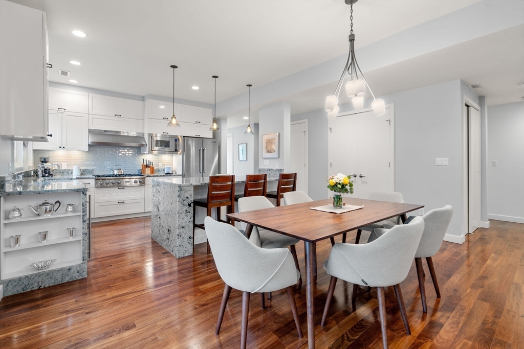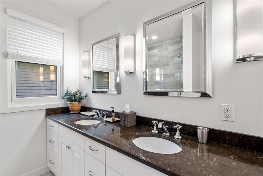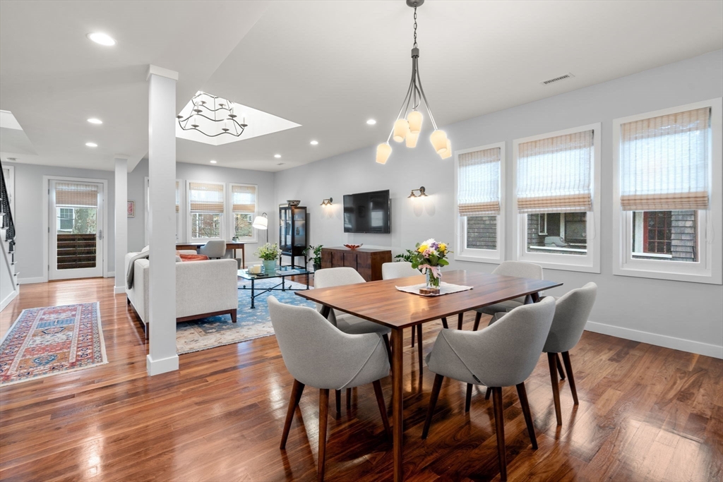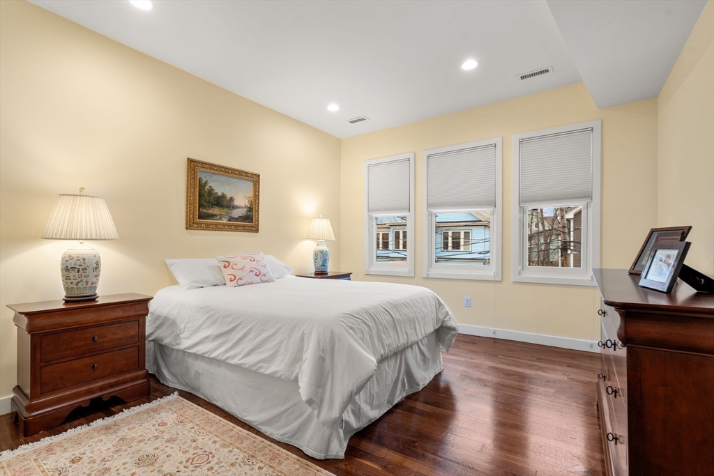 This beautiful top level condominium on historic Beals Street in Coolidge Corner is located in one of Brookline’s most coveted and convenient locations. The home is moments to shops, restaurants, the MFA, Fenway Park, Cambridge, Back Bay and the Charles River. This exquisitely renovated 5 bed/3 bath condo is drenched in natural light with soaring cathedral ceilings and fine craftsmanship throughout. The chef’s kitchen boasts Viking and LG appliances, an Italian granite island, and wine fridge, flowing seamlessly into expansive living and dining areas perfect for entertaining or relaxing with family and friends. The top-floor primary suite offers treetop views, spa bath with soaking tub, marble shower, heated floors, and custom walk-in closet. Three mahogany decks, 2 parking spaces, 2-zone central A/C, mudroom, and a finished lower level bonus room complete this rare offering with the space, style, comfort, convenience, and location buyers dream of.