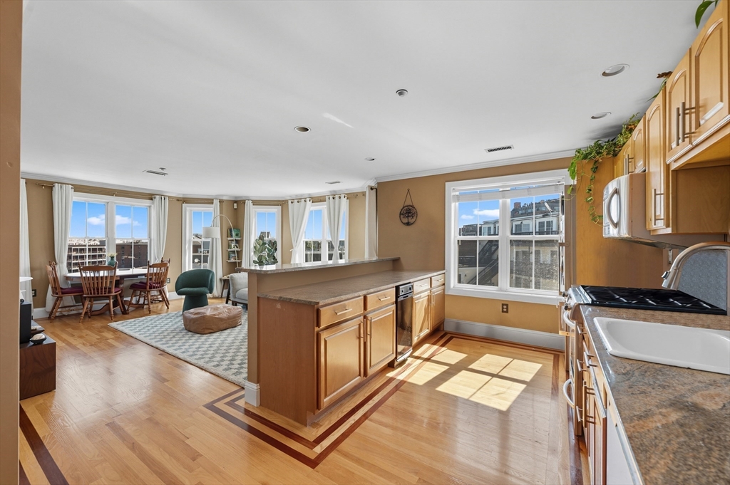 Enjoy sunlit living in this contemporary expanse with TWO garage parking spots in one of Boston's hottest neighborhoods. Tree top views with glimpses of skyline through many oversized windows + gorgeous wood floors w/cherry inlay. Open floor plan invites entertaining and relaxing with dining area and breakfast peninsula showcasing plenty of cabinetry with granite topped workspaces and a full complement of stainless appliances. Both bedrooms are generously sized and the primary offers a designer en-suite bath, great closet and adjacent laundry. Upstairs reveals a common roofdeck with panoramic views of the city. Enjoy living in the heart of all the dining, shopping, nightlife and events that fill your daily feeds! Easy access to one of the few urban public beaches, nearby marina and all the outdoor recreation Southie offers. Commuting options abound along bike paths, lots of public transport and highway access in and out of town, Logan Airport + So. Station.
