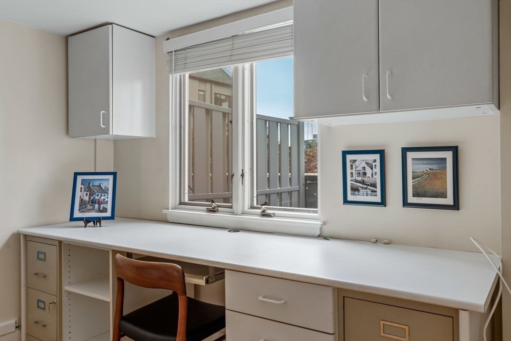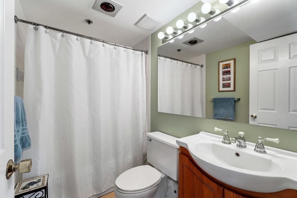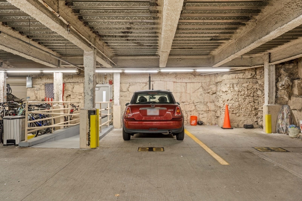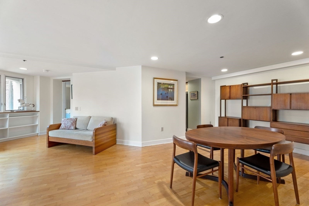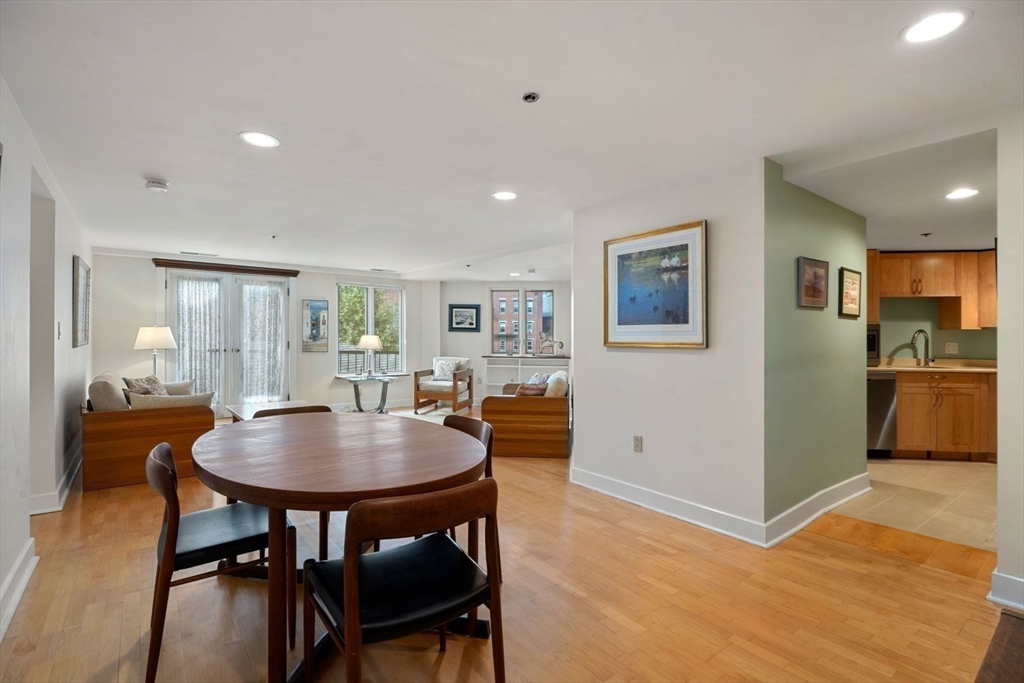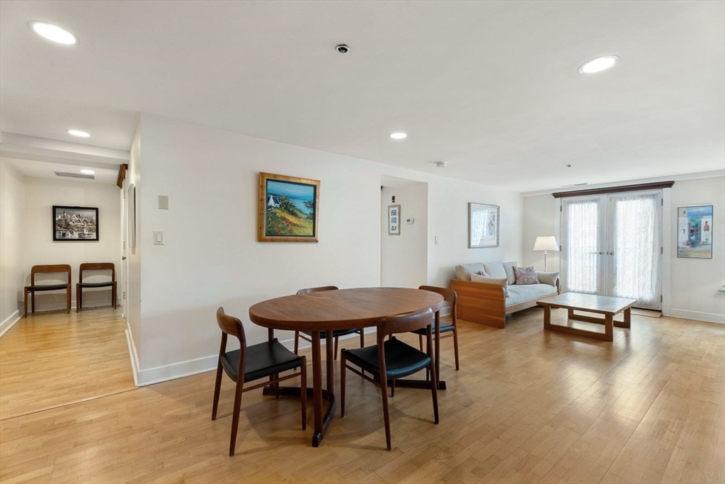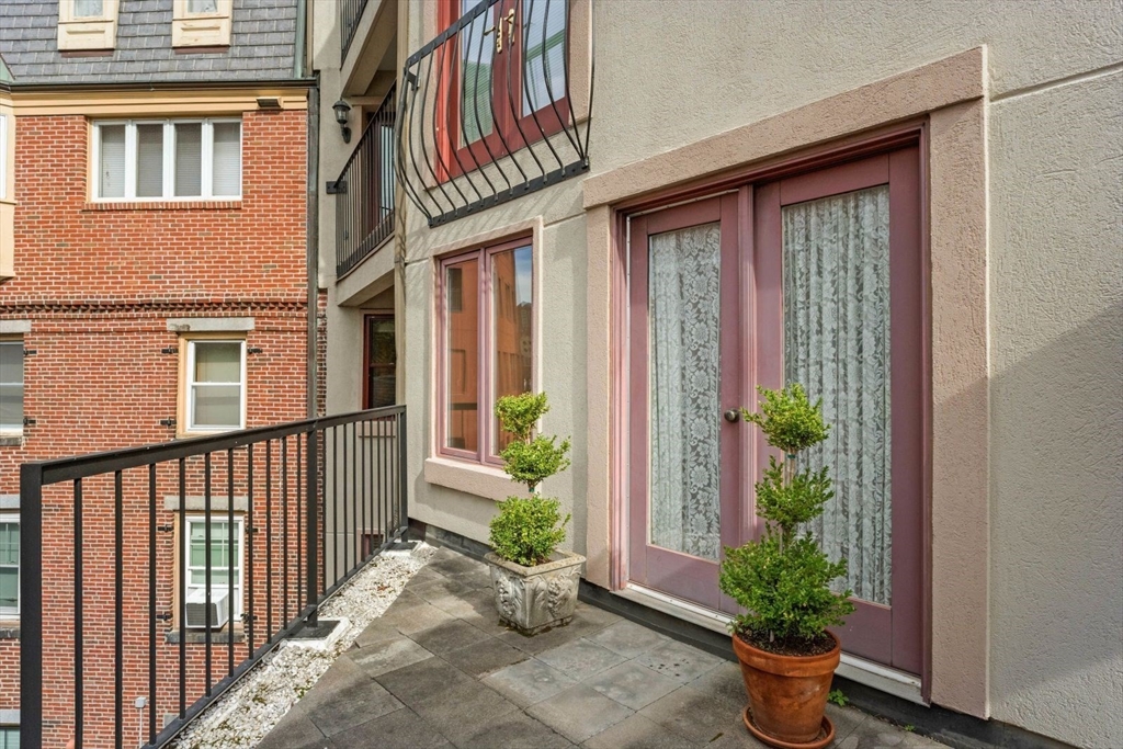 Ideally situated at 100 Fulton Street in the North End/Waterfront. This spacious two-bedroom, two-bath residence blends timeless architecture with modern comforts, creating a truly special home. The expansive living and dining area showcases hardwood floors and French doors, offering a versatile layout that complements any style. The kitchen, in excellent condition, provides abundant cabinetry and workspace, making it both functional and inviting. The primary suite features generous closet space and a private bath, while the second bedroom offers flexibility for guests, a home office, or additional living space. Step outside to your private patio, perfect for morning coffee, evening relaxation, or entertaining. Residents of Fulton Court enjoy concierge service, a fully equipped fitness center, and a stunning landscaped courtyard that feels like a hidden oasis in the heart of the city. Additional features include deeded garage parking, in-unit laundry, and central air.