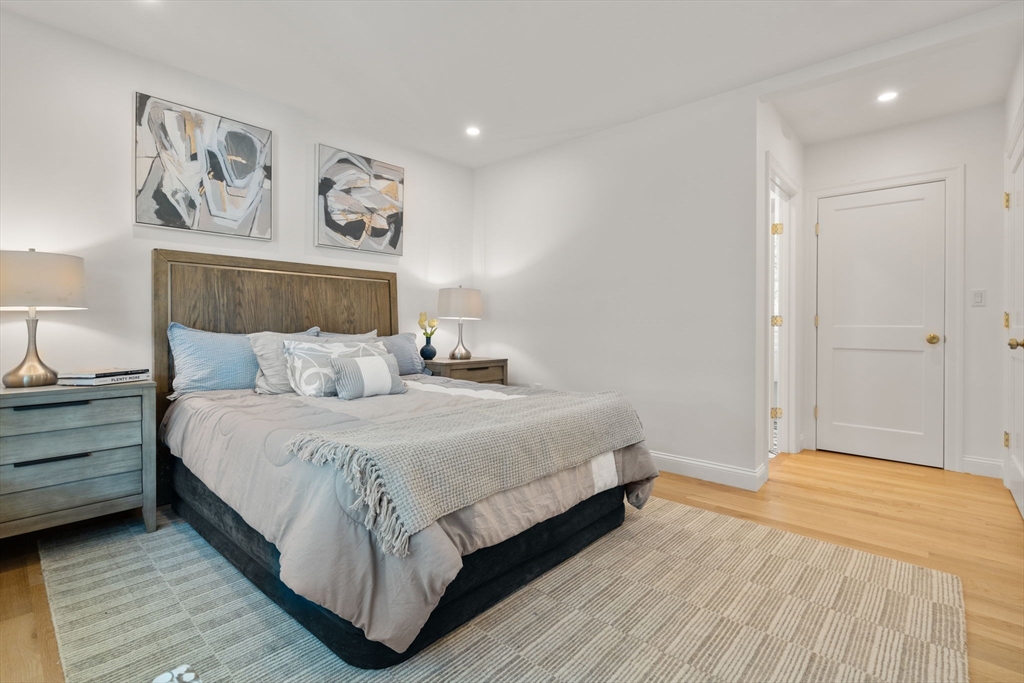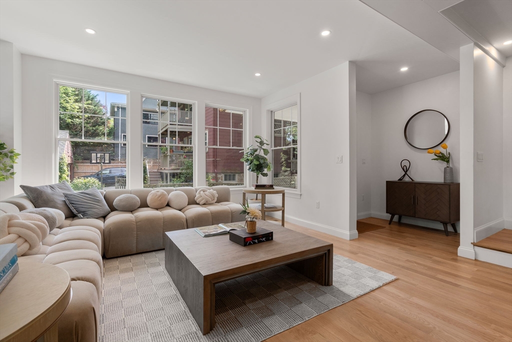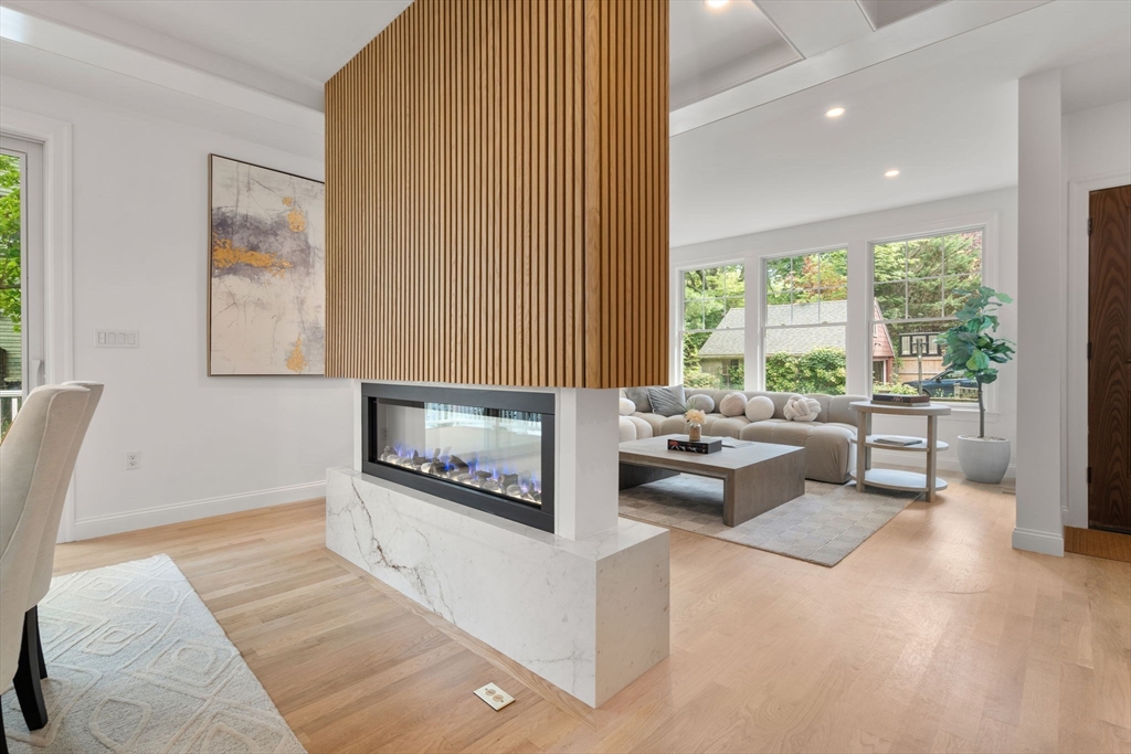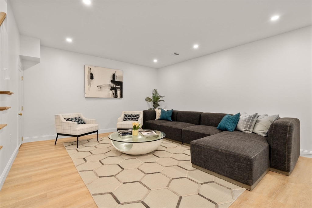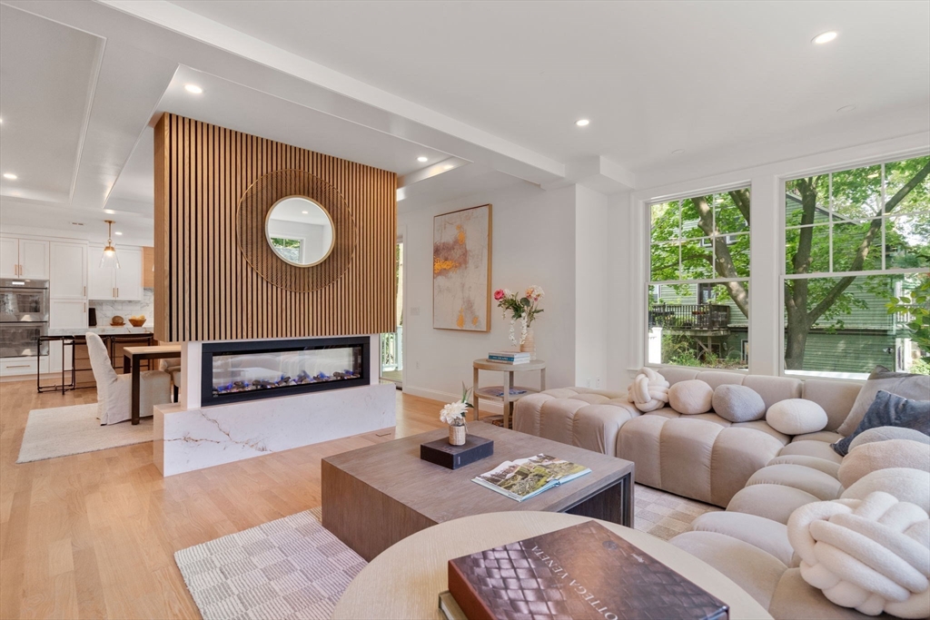 Tucked away on JFK Square’s coveted Naples Road, this new construction 4,300+ sqft Coolidge Corner attached townhome offers four levels of prime living with primary and two junior suites, office/gym spaces, attached heated garage with EV charger, walk-out finished lower level, and garden party-worthy deck and private yard. A grand dual fireplace connects the dining and living rooms, flowing into a custom kitchen with Thermador in-wall ovens and hooded cooktop, brass accents, and a 4” Neolith waterfall island with prep sink and seating. Nestled upstairs find custom tiled ensuite bathrooms and laundry accompany spacious bedrooms, while the primary suite features a walk-in closet, double vanity, heated floors, shower stall, and soaking tub. The finished lower level includes an entertainer’s bar, family room, full bath, and bedroom/office with storage. This North Brookline location offers easy access to the local village's cafes, restaurants, grocers, shops, pubs, and transit.