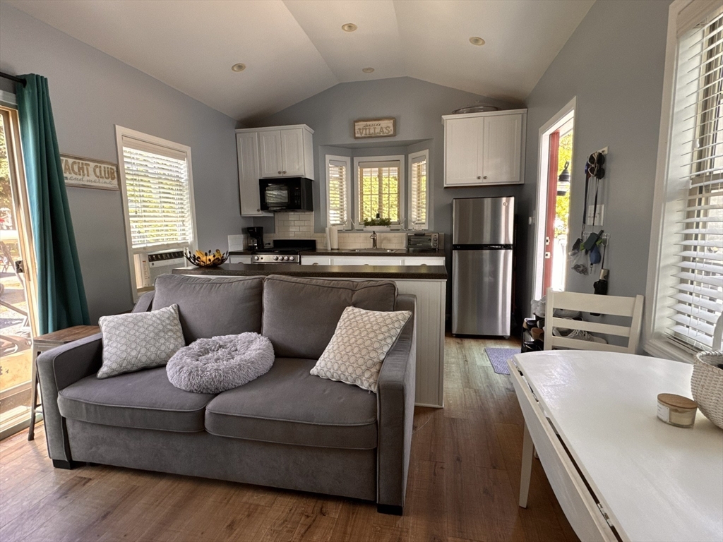 Rare opportunity to own one of the few waterfront cottages in the highly sought-after Sun Retreats Peters Pond-a premier gated, seasonal resort community open end of April, through end of October. This charming and fully furnished cottage offers the perfect Cape Cod getaway, located directly on the shores of beautiful, spring-fed Peters Pond. The cottage offers 1 bedroom, 1 full bathroom, a full kitchen, double-sided gas fireplace, and a fun loft area! Offered turn-key, this property comes fully furnished as seen here, as well as with four kayaks, a new gas grill, and a new porch set. A golf cart is negotiable. Enjoy your morning coffee with water views and spend your days exploring everything this vibrant community has to offer. Fees include: Taxes, cable, trash, water, and electric.