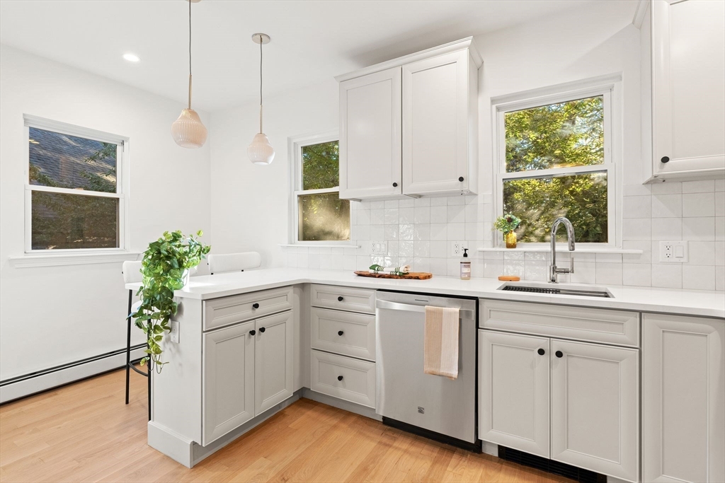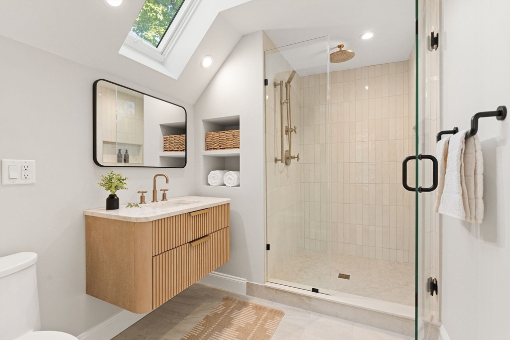 Uber stylish, bi-level condo with 2 beds + study, 2 baths, tucked away on a side street in JP. Located just mins to the Arboretum, Centre / South St. shops, Forest Hills station & Jamaica Pond! Mid-century modern vibes blend many cosmetic updates such as refinished oak flooring, high-end fixtures & lighting, + central air. The living area welcomes you w/ an open layout, bay windows, high ceilings & sleek gas fireplace. Gorgeous kitchen has Kenmore Elite appliances, tiled backsplash, and custom hood fan. The main level also includes one bedroom, convenient study, in-unit laundry room, & stunning tiled bath featuring a floating vanity. Relax in your luxurious top floor suite among skylights, a second gas fireplace, custom walk-in closet, and glass shower w/ Kohler Purist fixtures. Unit also has a mudroom, private patio, walkout basement + large prvt storage room. This was a 2015 full reno & 2025 refresh, and is a new condo conversion offering 2 units. Don’t miss this exceptional home