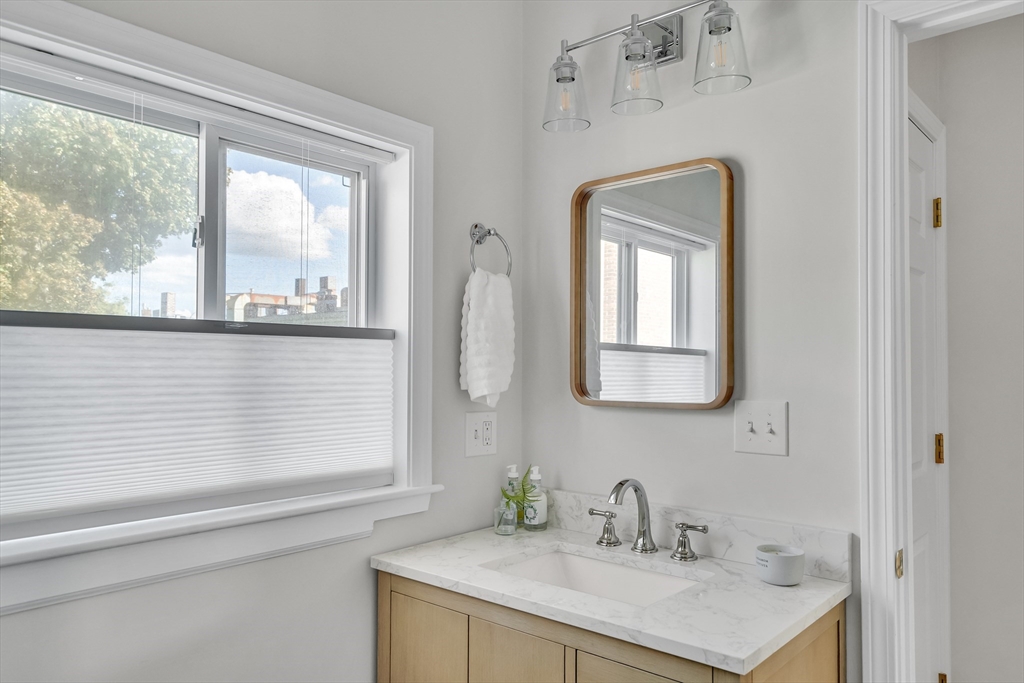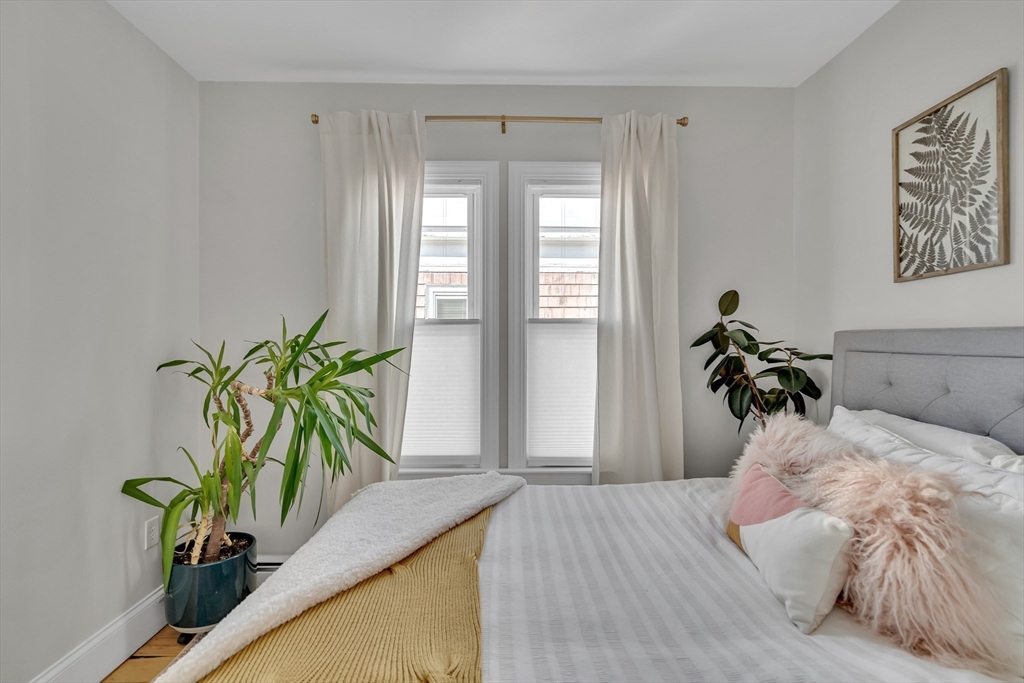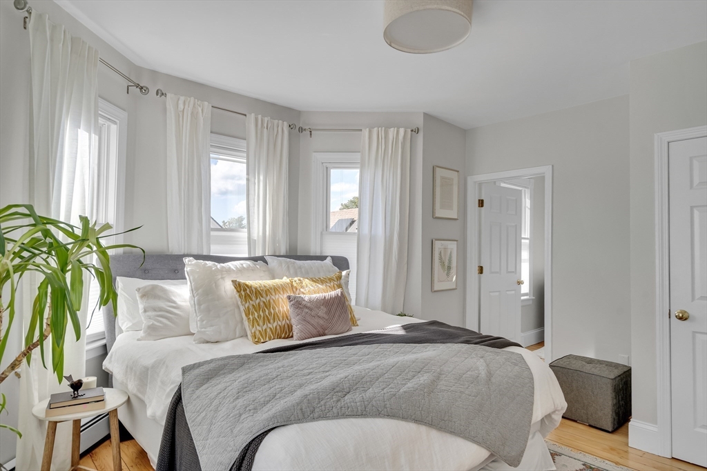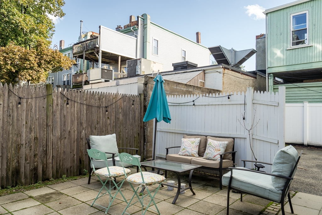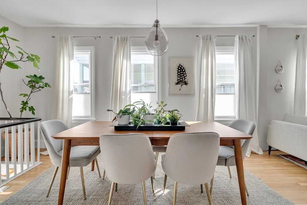Top-floor unit with off-street parking in the heart of Inman Square. Elegantly and tastefully updated, this well-laid out home offers a true urban oasis. Sunlight via south-facing windows fills the large, open-concept living/dining area. Quartz/stainless kitchen with plentiful storage; renovated full bathroom with tiling. Two bedrooms, including a large bay-windowed suite with a deep closet and half-bathroom. Hardwood floors throughout, including original wide-plank floors in the bedrooms. In-unit laundry. Additional basement storage. Large, shared back patio. Off-street parking. Steps to the heart of Inman Square, with many of Greater Boston's most celebrated eateries. Easy commute via the Green Line at Union Square or Red Line at Central Square.