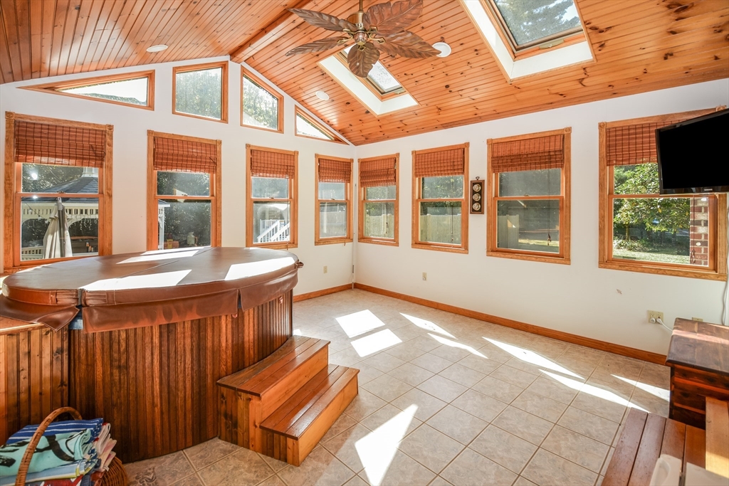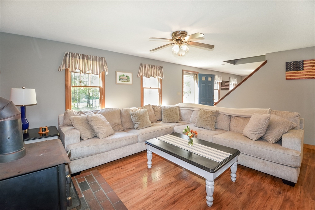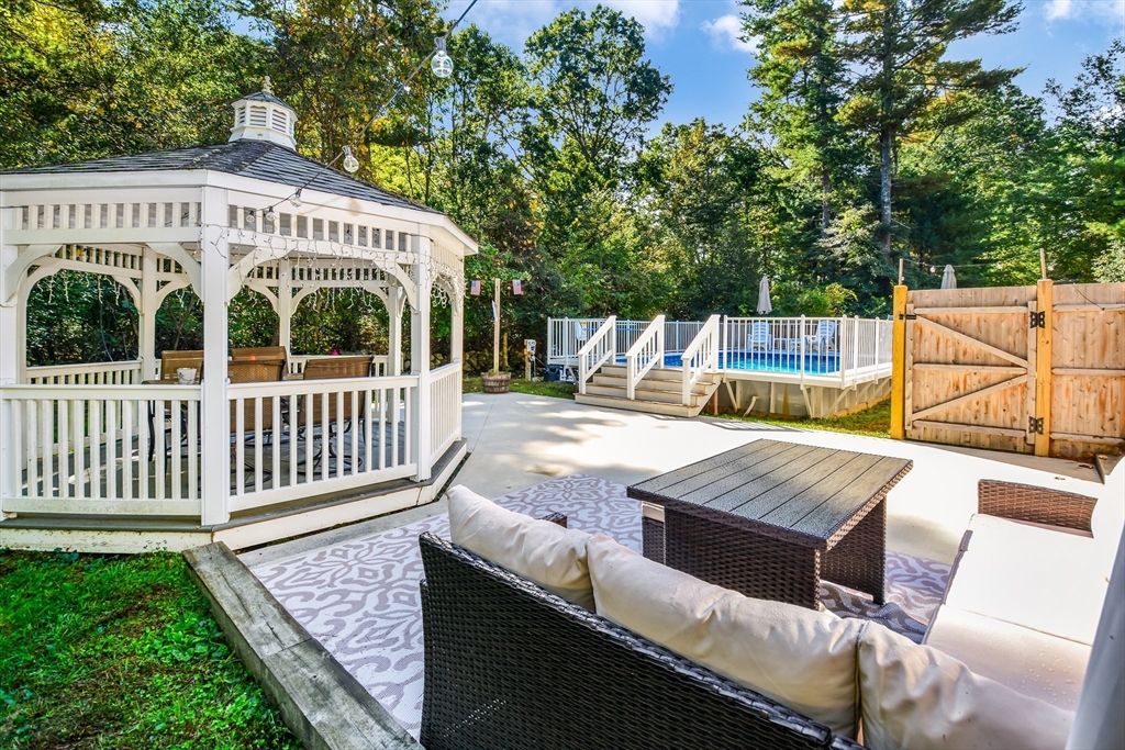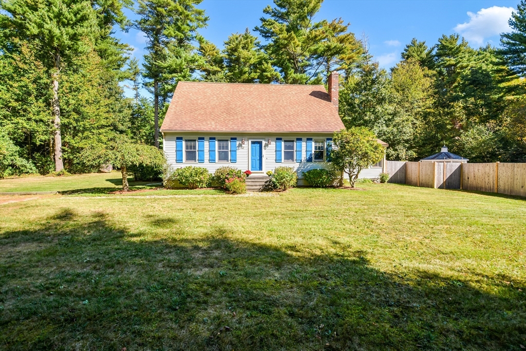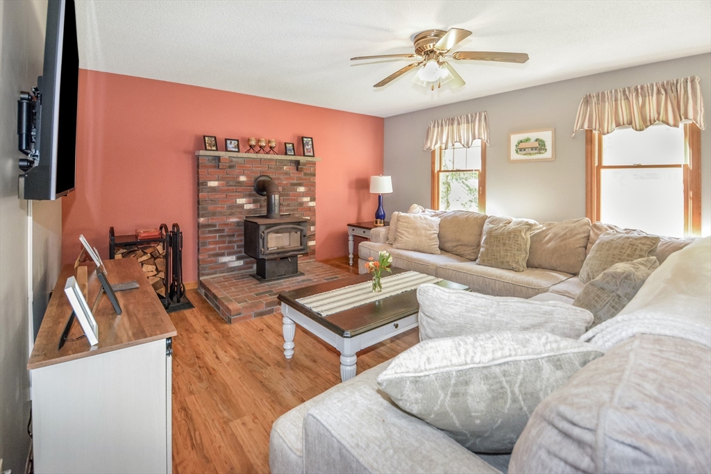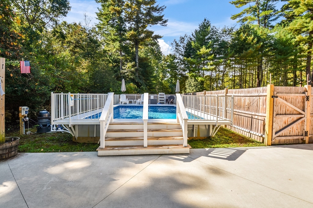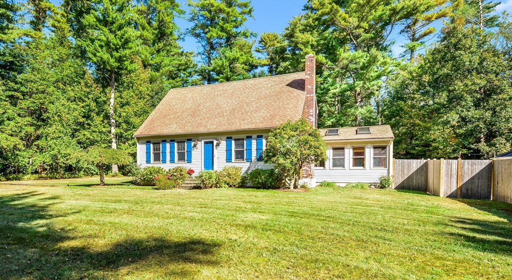 Welcome to this beautifully maintained 3-bedroom, 2-bath Cape nestled at the end of a cul-de-sac. Set on a spacious lot surrounded by nature, this home offers the perfect blend of classic New England charm and modern updates. The inviting living room features a woodstove with a cozy feel, an updated kitchen with plenty of cabinet space. A flexible floor plan provides a first-floor home office, playroom, or guest room, while 3 additional bedrooms upstairs offer comfort and privacy. The bonus feature of this home is the sunroom that offers tons of natural light, hot tub and entertaining space. Step outside to enjoy a large private yard with above ground pool gazebo and access to neighborhood trails. This home is a rare find!