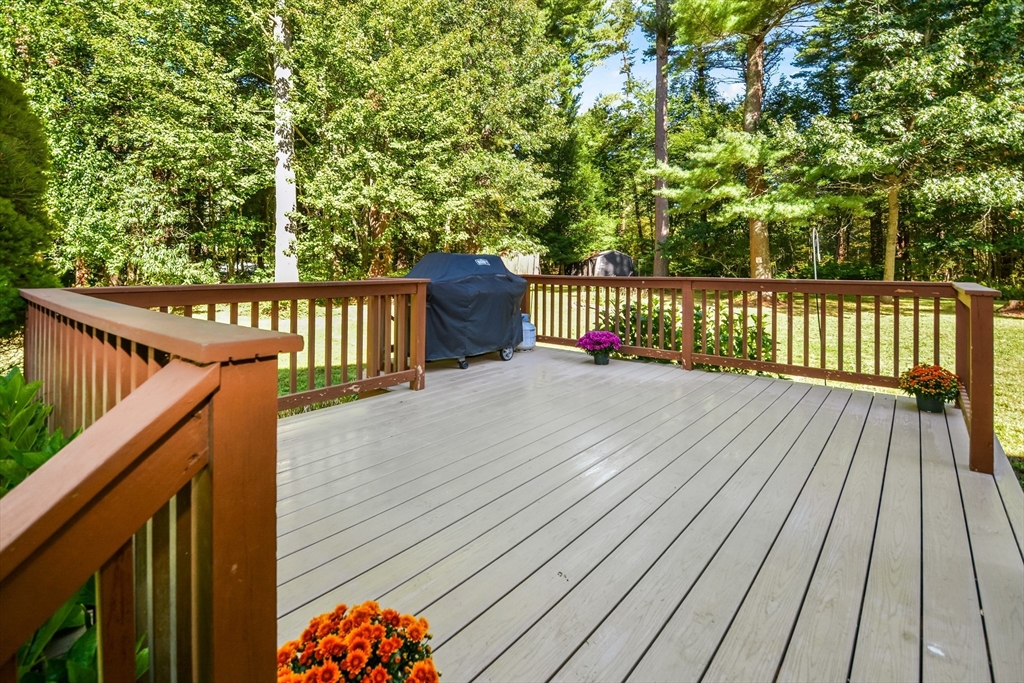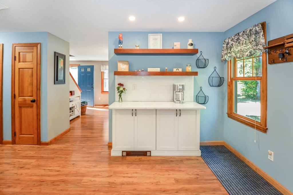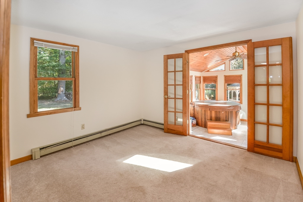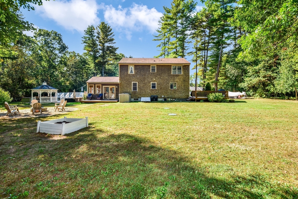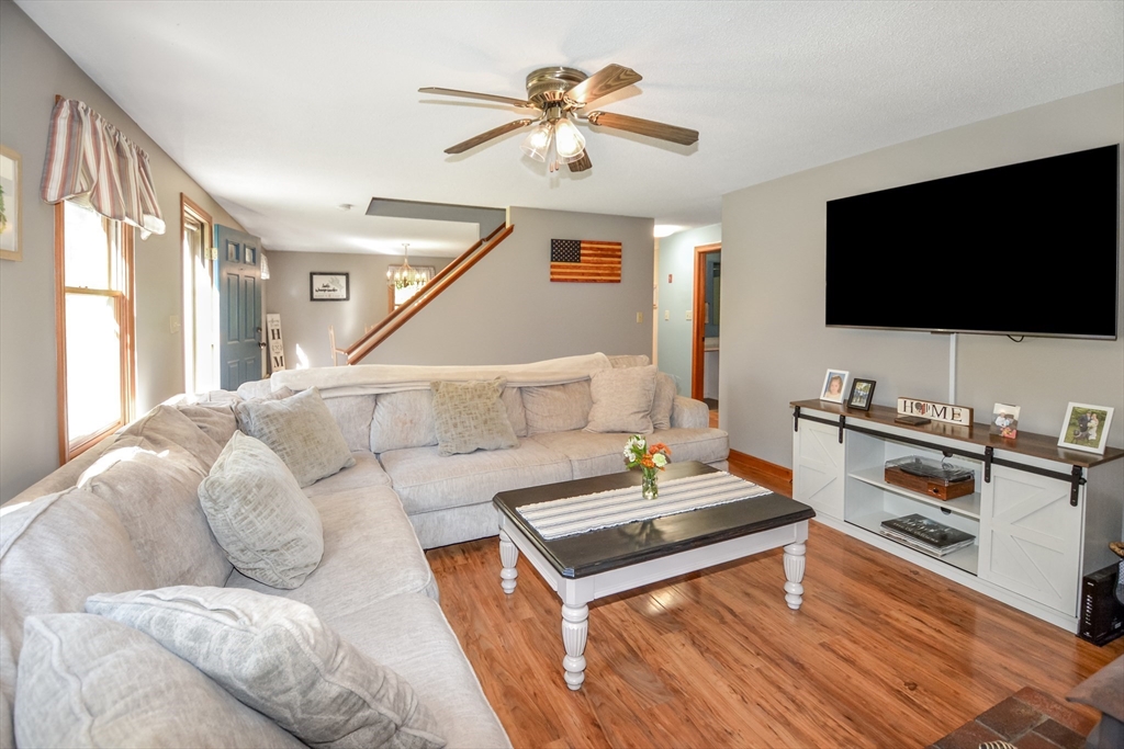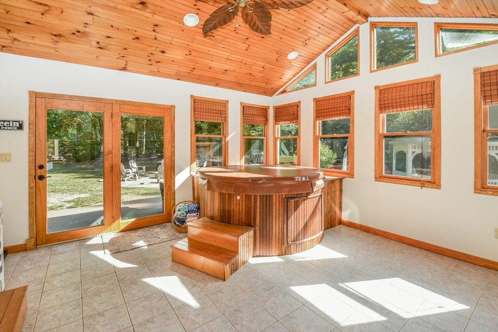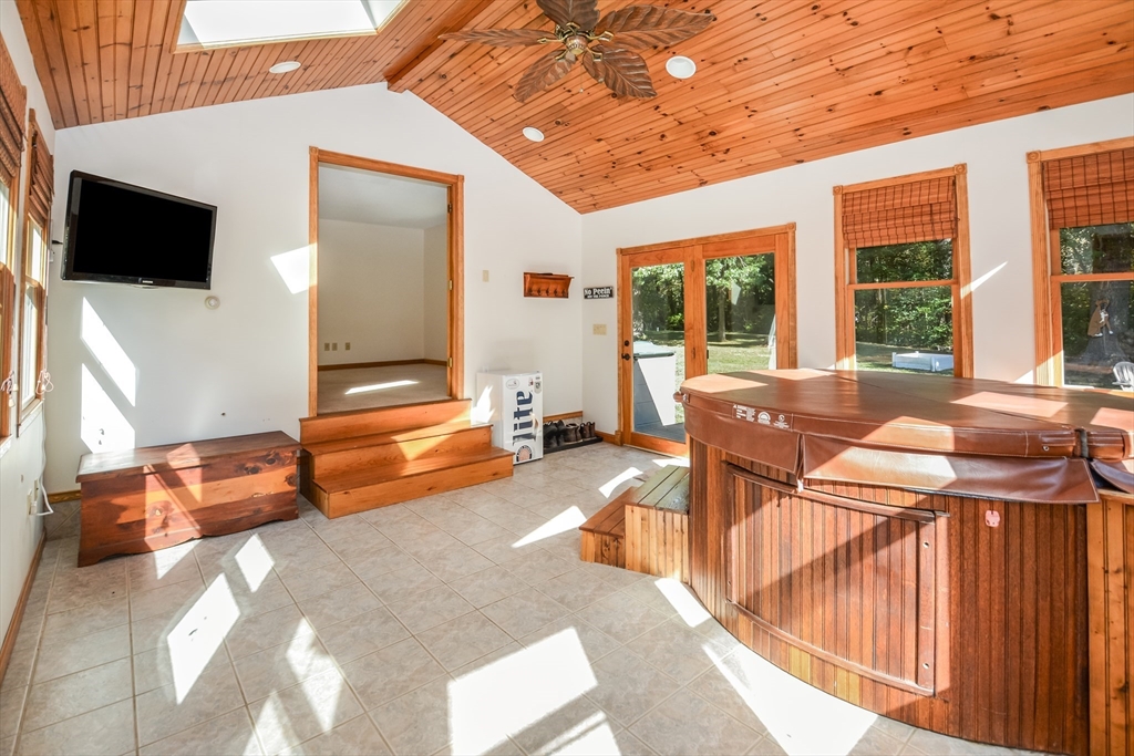 Welcome to this beautifully maintained 3-bedroom, 2-bath Cape nestled at the end of a cul-de-sac. Set on a spacious lot surrounded by nature, this home offers the perfect blend of classic New England charm and modern updates. The inviting living room features a woodstove with a cozy feel, an updated kitchen with plenty of cabinet space. A flexible floor plan provides a first-floor home office, playroom, or guest room, while 3 additional bedrooms upstairs offer comfort and privacy. The bonus feature of this home is the sunroom that offers tons of natural light, hot tub and entertaining space. Step outside to enjoy a large private yard with above ground pool gazebo and access to neighborhood trails. This home is a rare find!