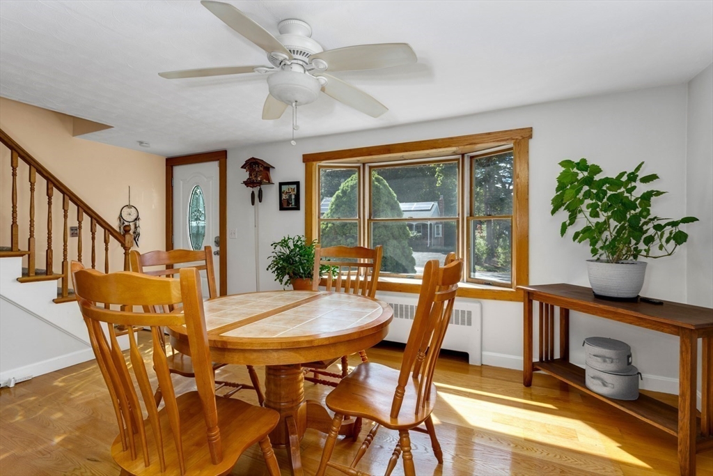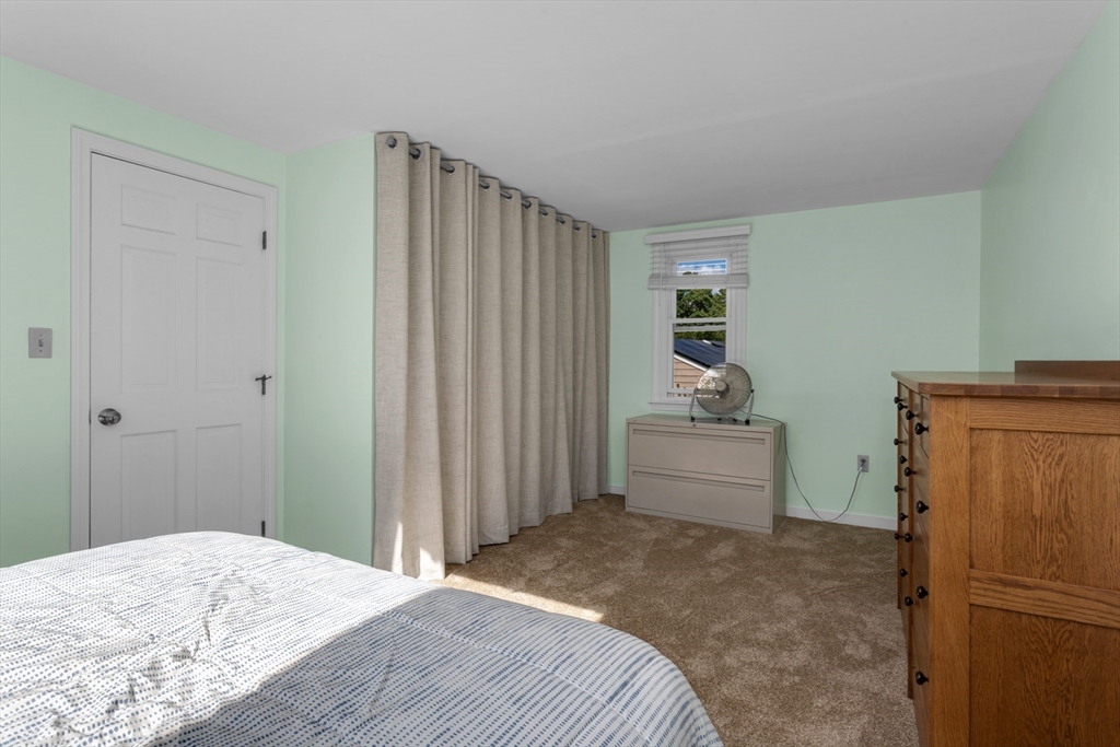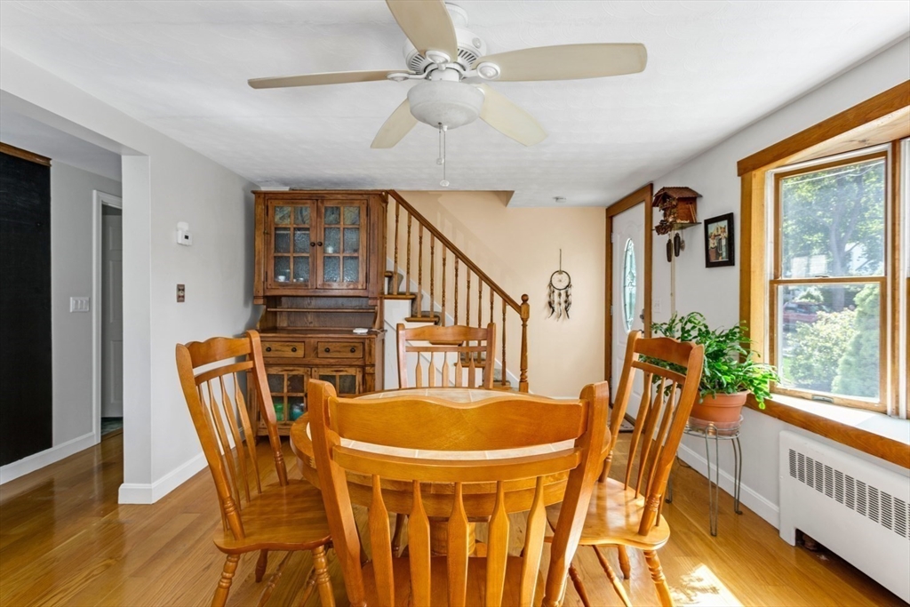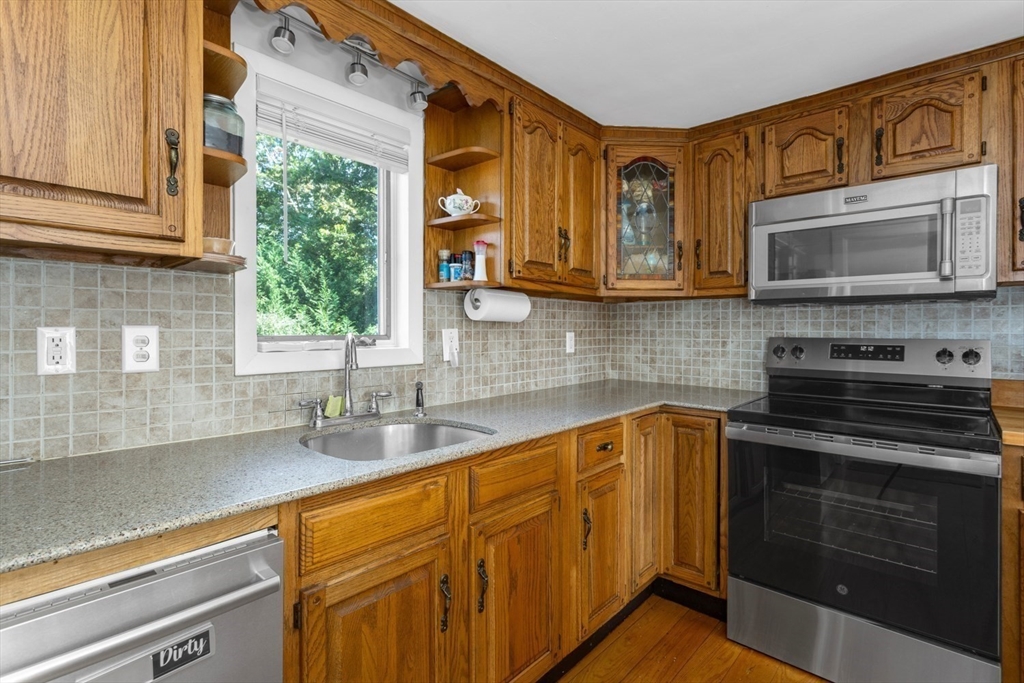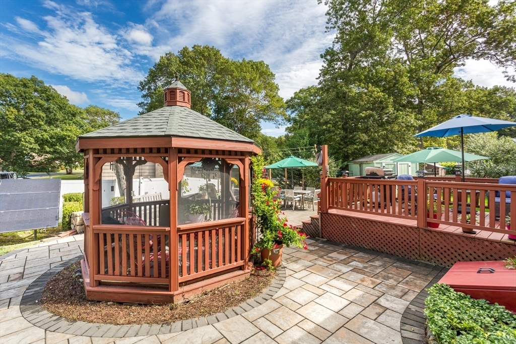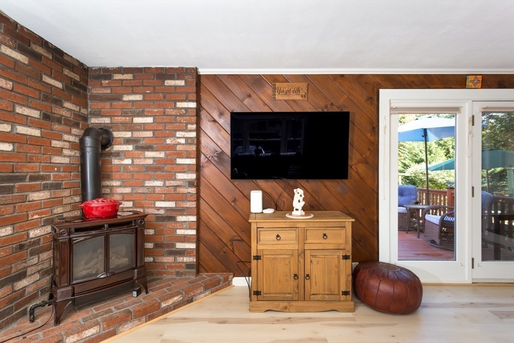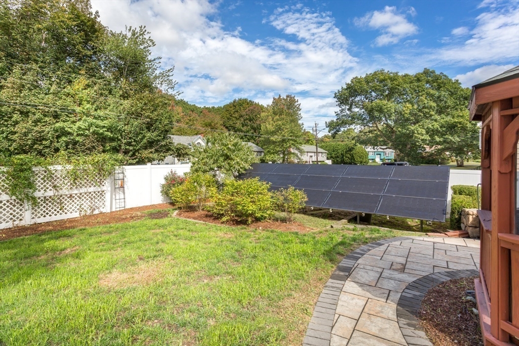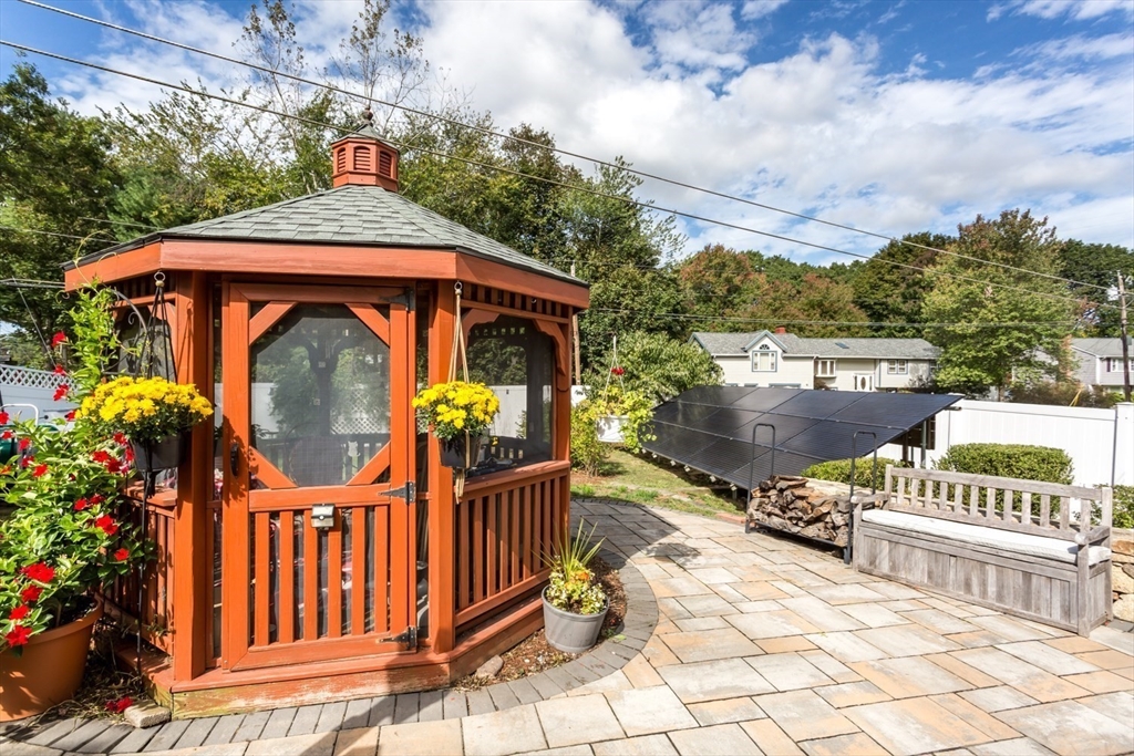 Looking for an inviting home in a desirable neighborhood? This 4 bedroom 2 bath Cape combines classic charm with modern updates. The bright open concept floor plan offers many possibilities for gatherings. The propane gas fireplaced family room offers a cozy place to watch your favorite program or enjoy a fire on a winter night. It has an efficient kitchen with upgraded solid oak cabinets, granite counters, wood floors, built-in pantry cabinets and stainless steel appliances. It opens to a bright full sized dining room. Two bedrooms on the 1st floor give a main suite option, if desired. The family room leads out to a beautiful deck with a distictive natural stone (250SF) patio, fire pit, screened gazebo and fenced yard surrounded by vegetable gardens, fruit trees and perennials. This home includes an efficient 2018-heat pump with two heads for both cooling and heating. Two Solar Panel Arrays-2015 are owned, 2010-Propane Stove and Boiler, 2015-Roof. Easy accesss to MBTA Boston, Rte 95.