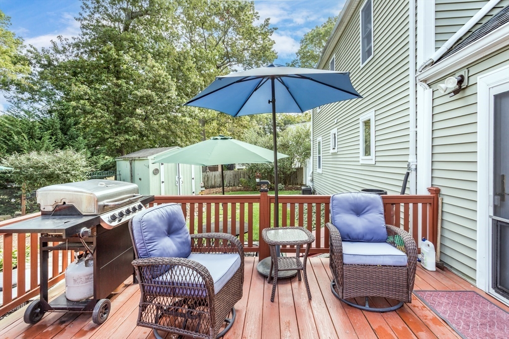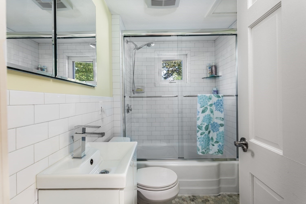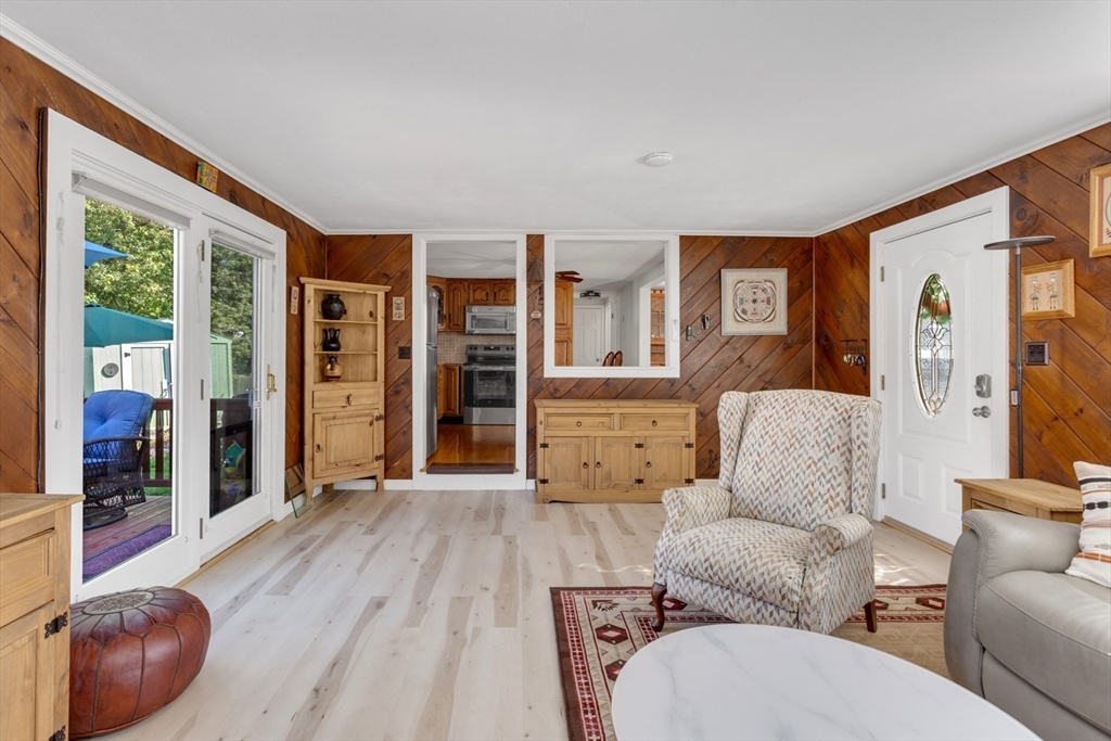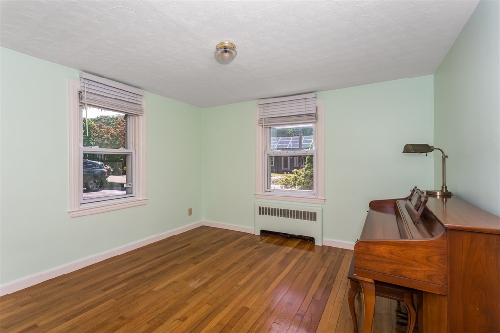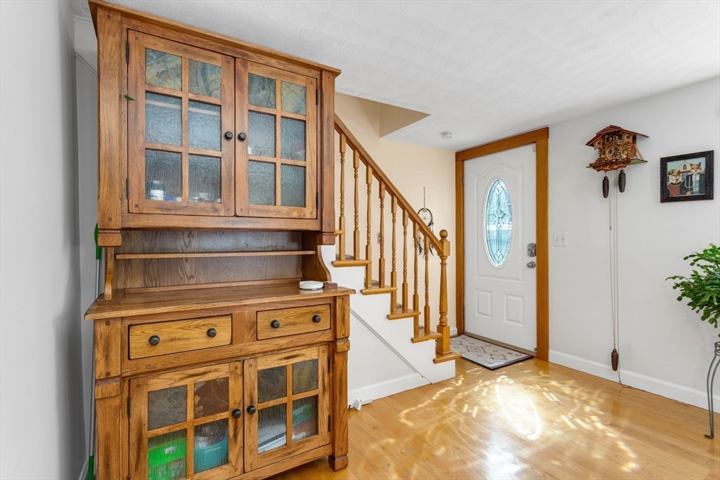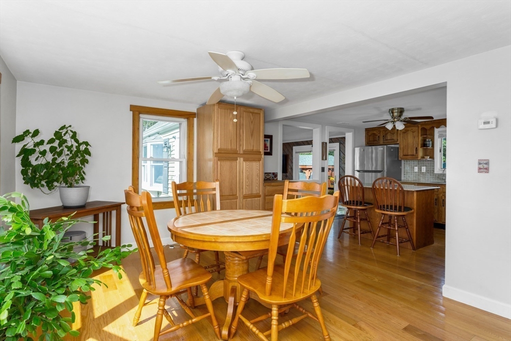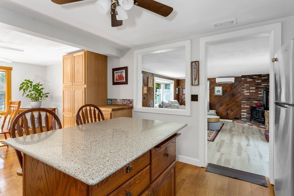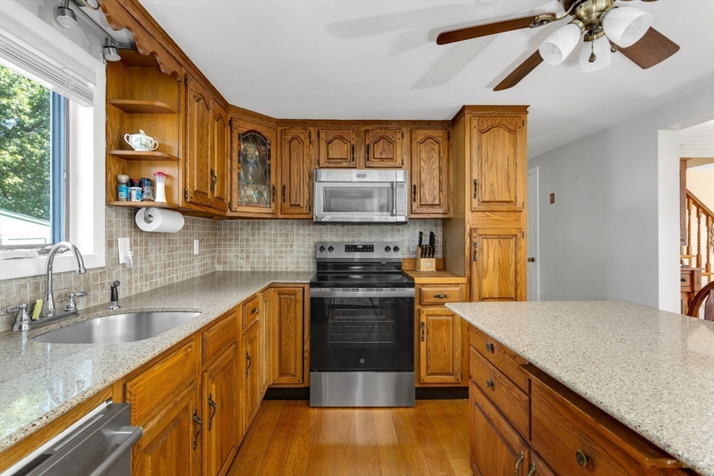 Looking for an inviting home in a desirable neighborhood? This 4 bedroom 2 bath Cape combines classic charm with modern updates. The bright open concept floor plan offers many possibilities for gatherings. The propane gas fireplaced family room offers a cozy place to watch your favorite program or enjoy a fire on a winter night. It has an efficient kitchen with upgraded solid oak cabinets, granite counters, wood floors, built-in pantry cabinets and stainless steel appliances. It opens to a bright full sized dining room. Two bedrooms on the 1st floor give a main suite option, if desired. The family room leads out to a beautiful deck with a distictive natural stone (250SF) patio, fire pit, screened gazebo and fenced yard surrounded by vegetable gardens, fruit trees and perennials. This home includes an efficient 2018-heat pump with two heads for both cooling and heating. Two Solar Panel Arrays-2015 are owned, 2010-Propane Stove and Boiler, 2015-Roof. Easy accesss to MBTA Boston, Rte 95.