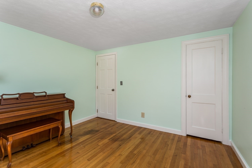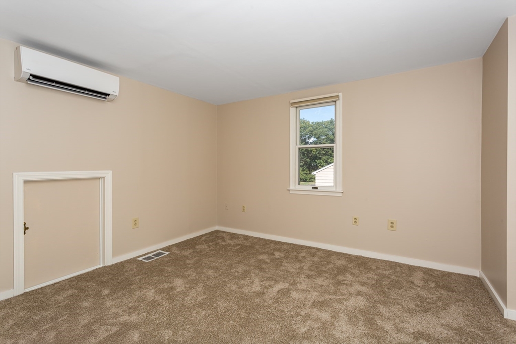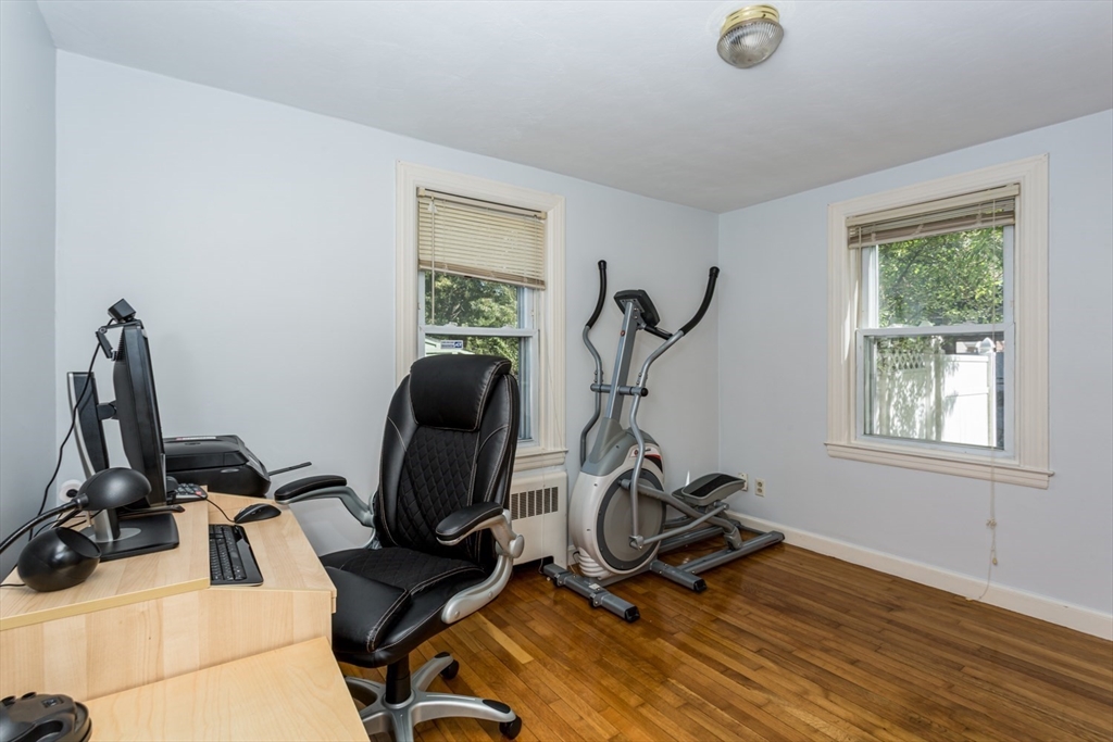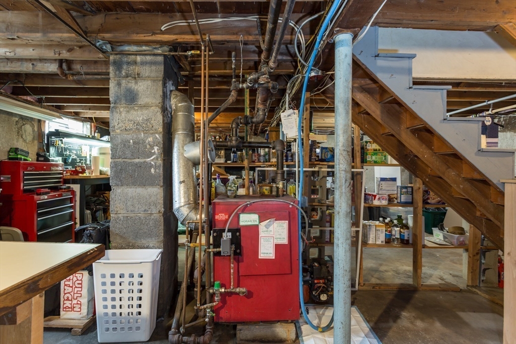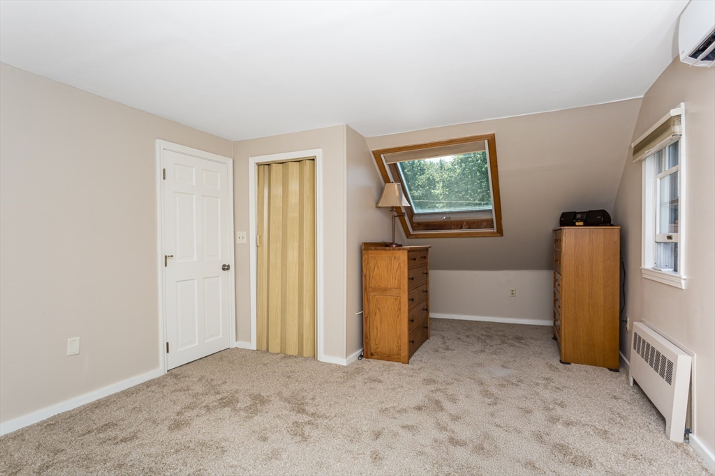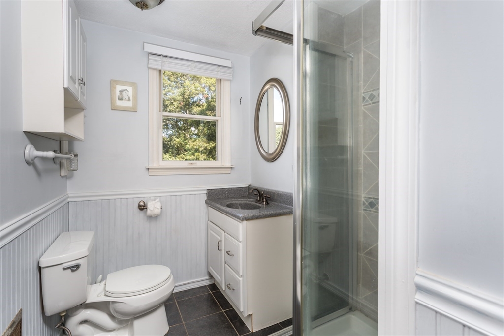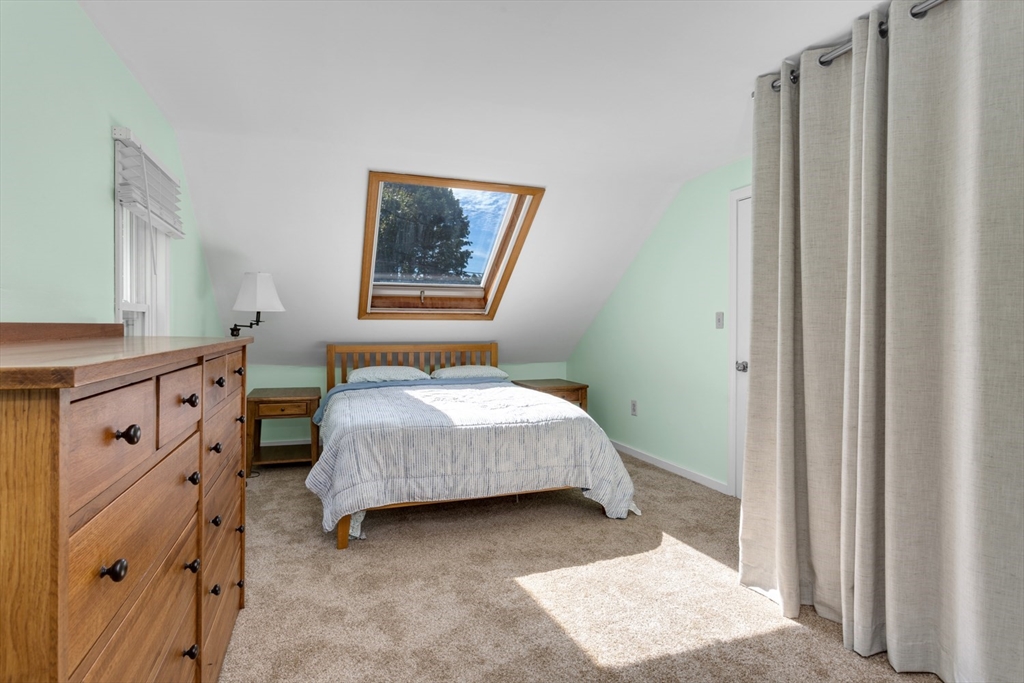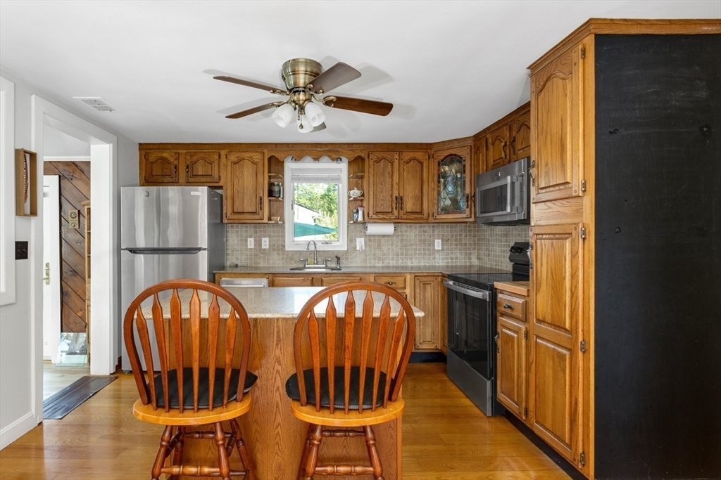Looking for an inviting home in a desirable neighborhood? This 4 bedroom 2 bath Cape combines classic charm with modern updates. The bright open concept floor plan offers many possibilities for gatherings. The propane gas fireplaced family room offers a cozy place to watch your favorite program or enjoy a fire on a winter night. It has an efficient kitchen with upgraded solid oak cabinets, granite counters, wood floors, built-in pantry cabinets and stainless steel appliances. It opens to a bright full sized dining room. Two bedrooms on the 1st floor give a main suite option, if desired. The family room leads out to a beautiful deck with a distictive natural stone (250SF) patio, fire pit, screened gazebo and fenced yard surrounded by vegetable gardens, fruit trees and perennials. This home includes an efficient 2018-heat pump with two heads for both cooling and heating. Two Solar Panel Arrays-2015 are owned, 2010-Propane Stove and Boiler, 2015-Roof. Easy accesss to MBTA Boston, Rte 95.