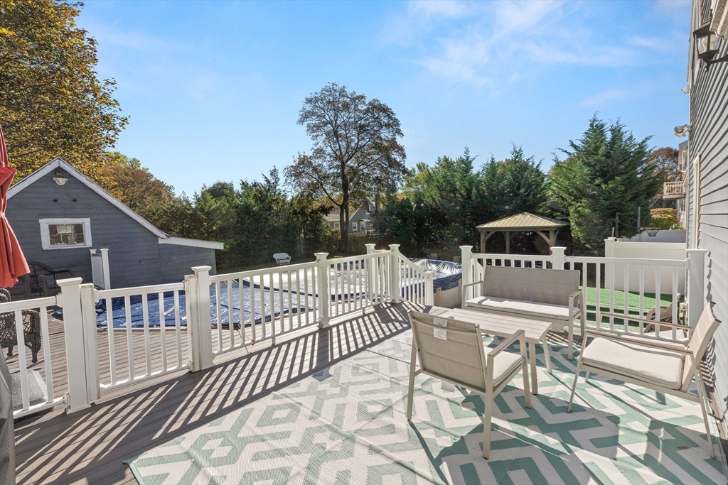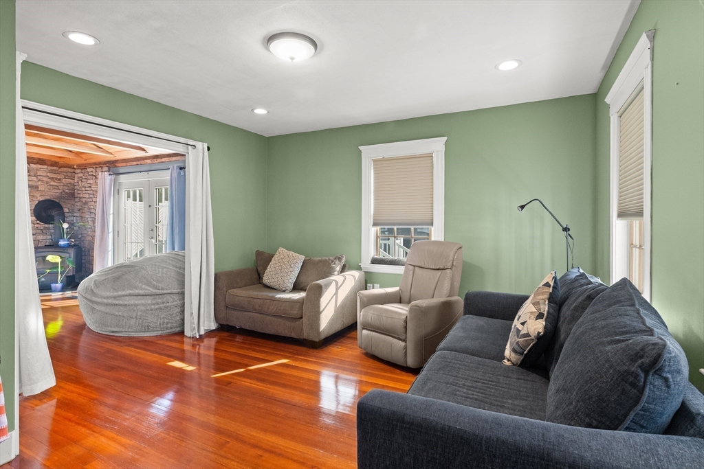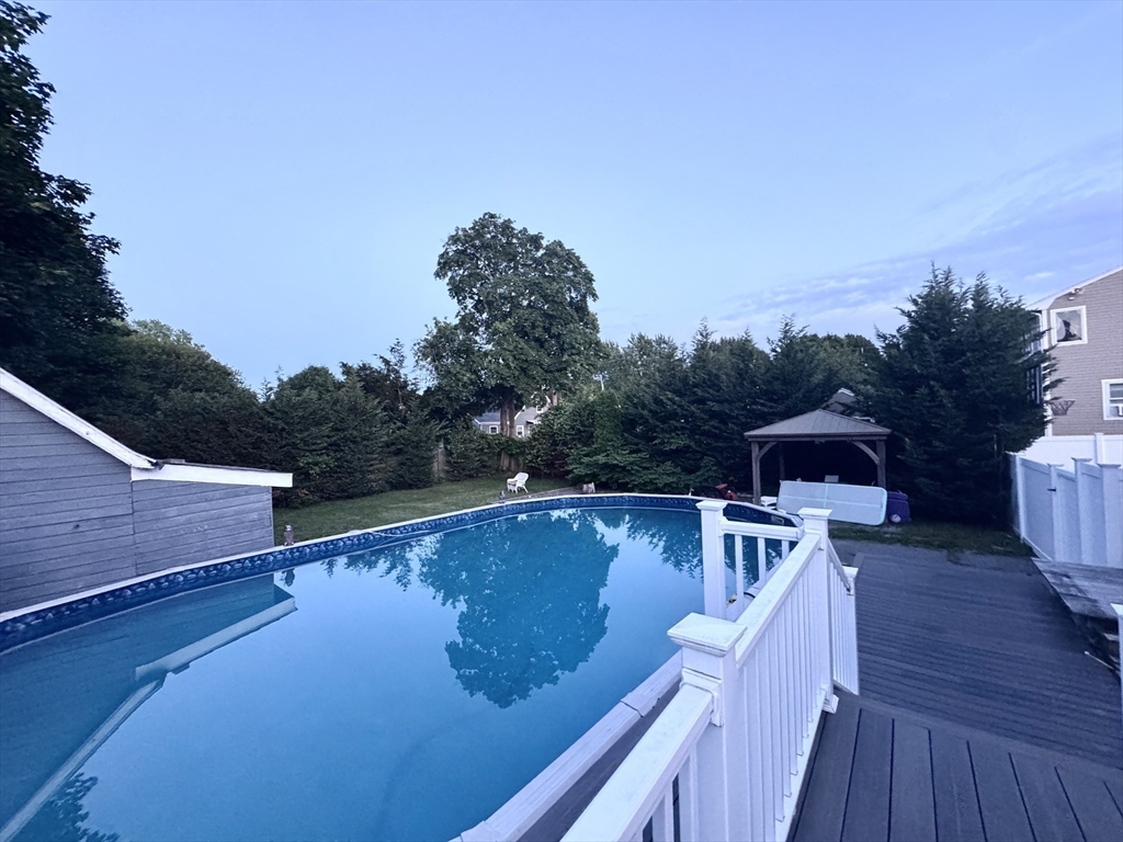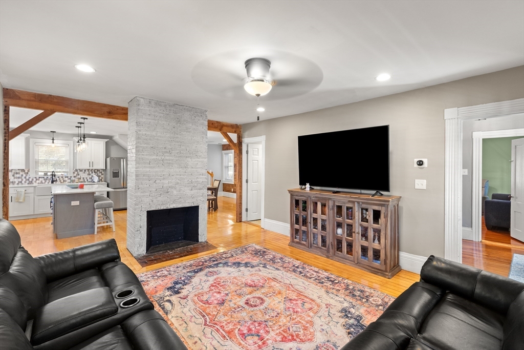 Nothing to do but unpack and enjoy! Blending timeless charm with thoughtful modern updates, this nearly 2,000 sq. ft. home in sought-after South Peabody is just .3 miles to Brown School and .2 miles to Spring Pond Nature Trail. Full of character, it features period details, a newer heating system (2021), and siding (2020). The fenced backyard is perfect for entertaining with a stunning above-ground pool, composite decking (2022), and covered patio. Inside, a cozy family room is anchored by a floor-to-ceiling antique fireplace, while the open kitchen/dining area offers quartz countertops, a large island, gas stove, and stainless steel appliances. A vaulted family room with exposed beams, wood ceilings, and wood stove (2016) flows to the back deck. The spacious primary suite includes a tiled en-suite bath and large closet. With 3 bedrooms upstairs, a flexible first-floor room for office or bedroom, and a full basement, this home adapts to your needs. Come see this South Peabody gem today