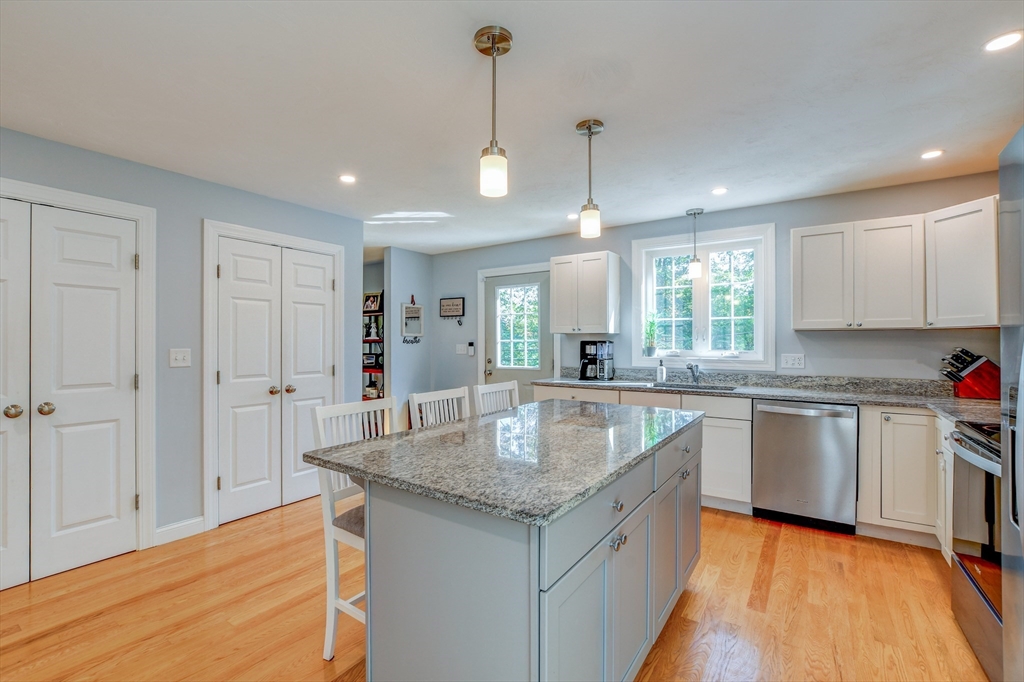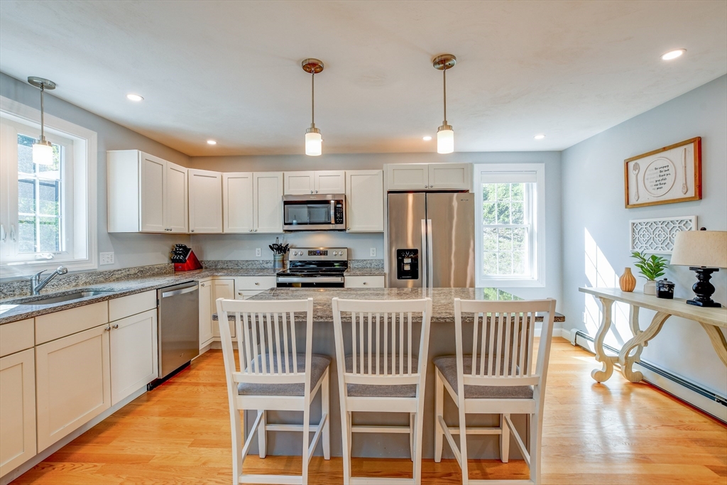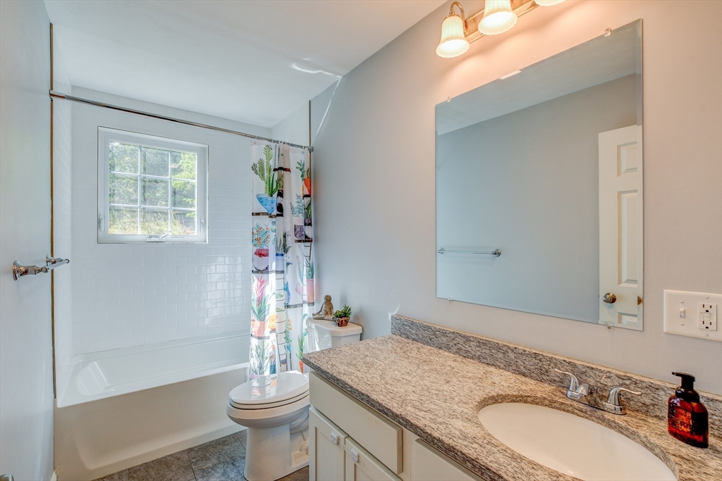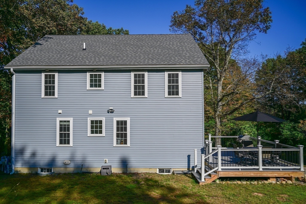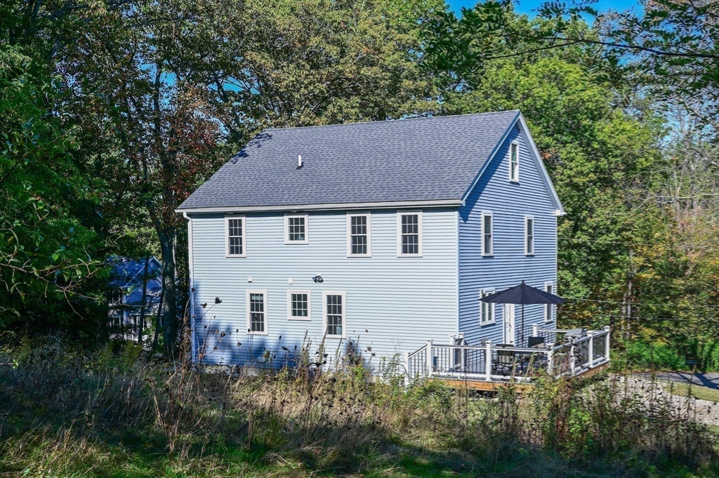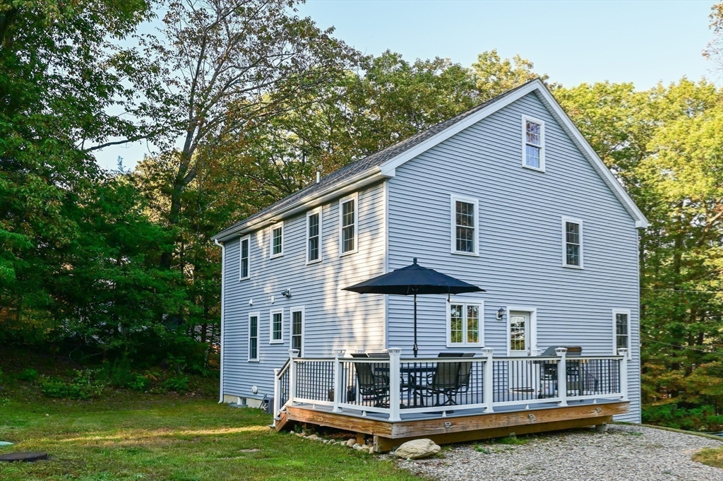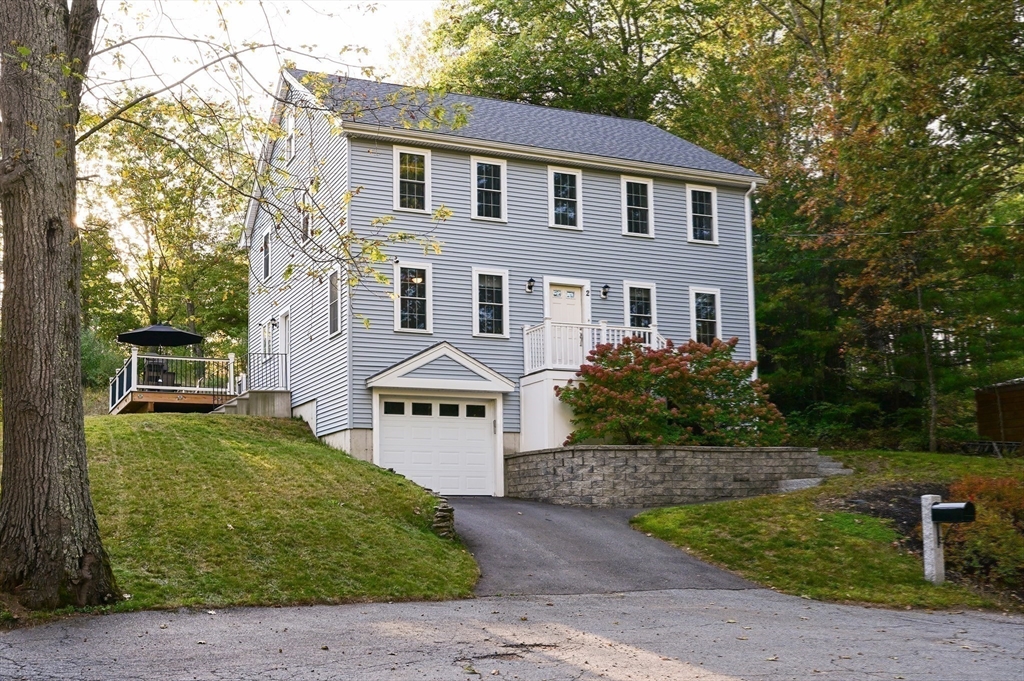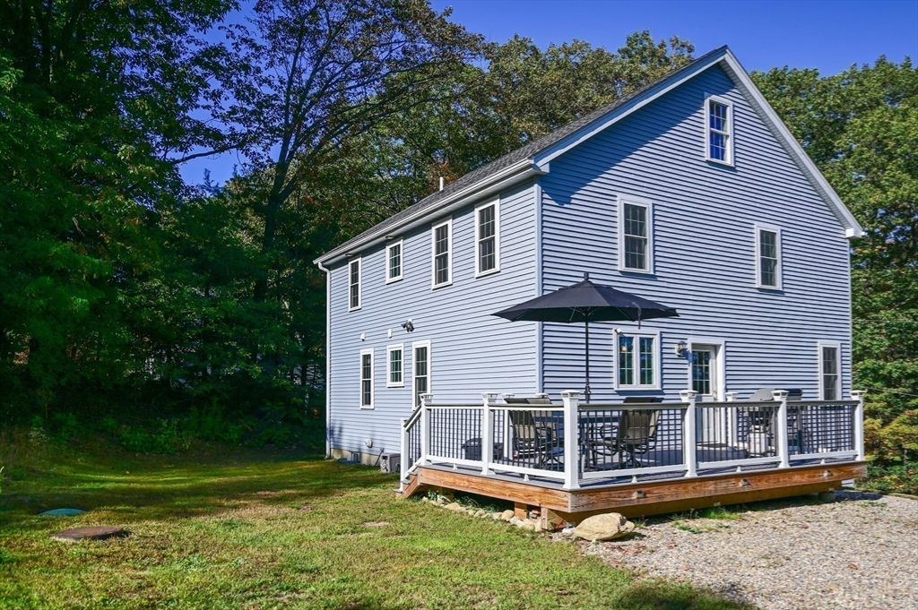 Impressive 6-Year-Old Colonial on 2.87 Acres located at the end of Dead-End Road! Offering over 2,000 sq. ft. of living space, this home blends comfort, style, and convenience. The main level features hardwood floors, oak stair treads, and a spacious kitchen with granite counters, center island, and pantry closet, open to dining and living rooms. A home office/bonus room adds flexibility. Three full baths include tile surrounds, two with double sinks, and one with a separate vanity area. Upstairs, the main suite offers a tiled shower, double sinks, walk-in closet, and extra storage. Two generous sized additional bedrooms and second-floor laundry complete the level. Oversized garage under with workbench space and a high-ceiling basement allow for storage or future expansion. A new composite deck off the kitchen is perfect for entertaining and enjoying the winter months view of Round Meadow Pond and sunrises. Convenient to major routes, MBTA stop, and Wachusett Mountain recreation