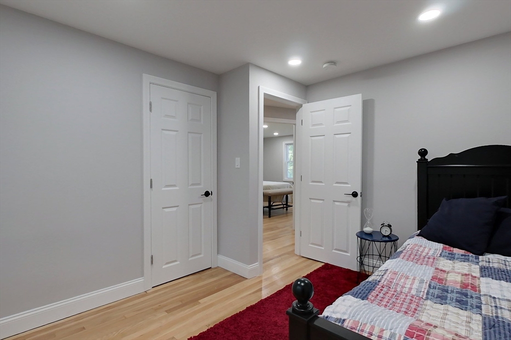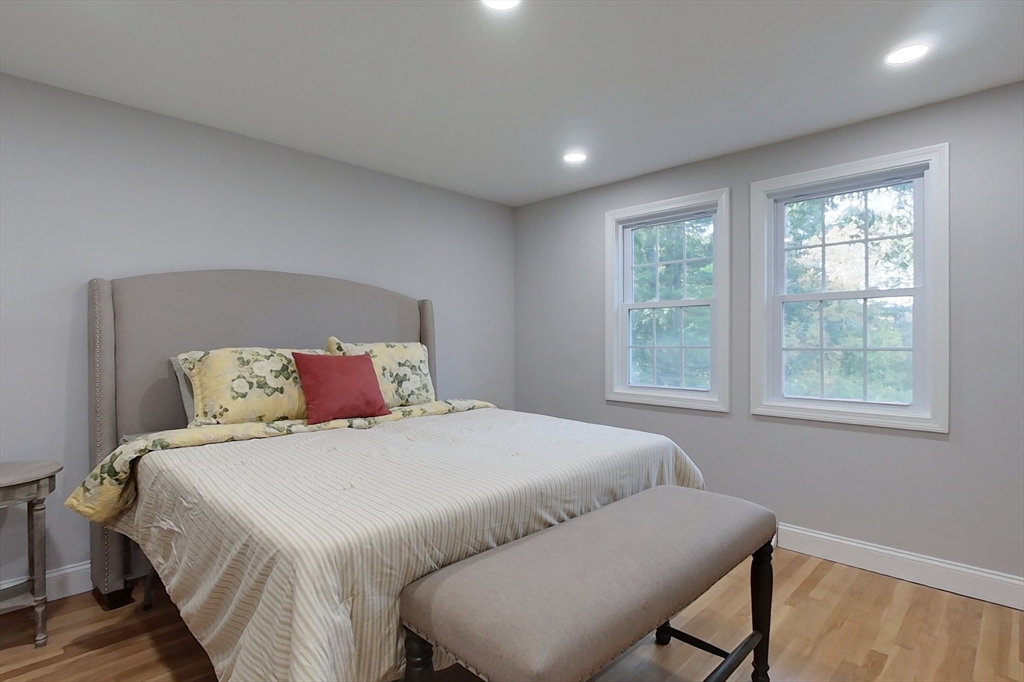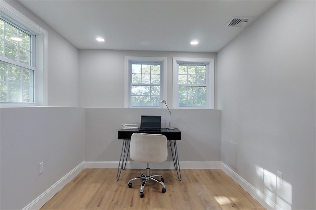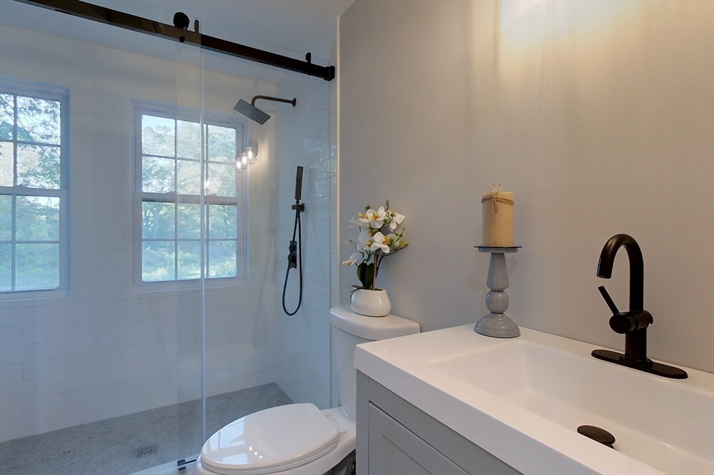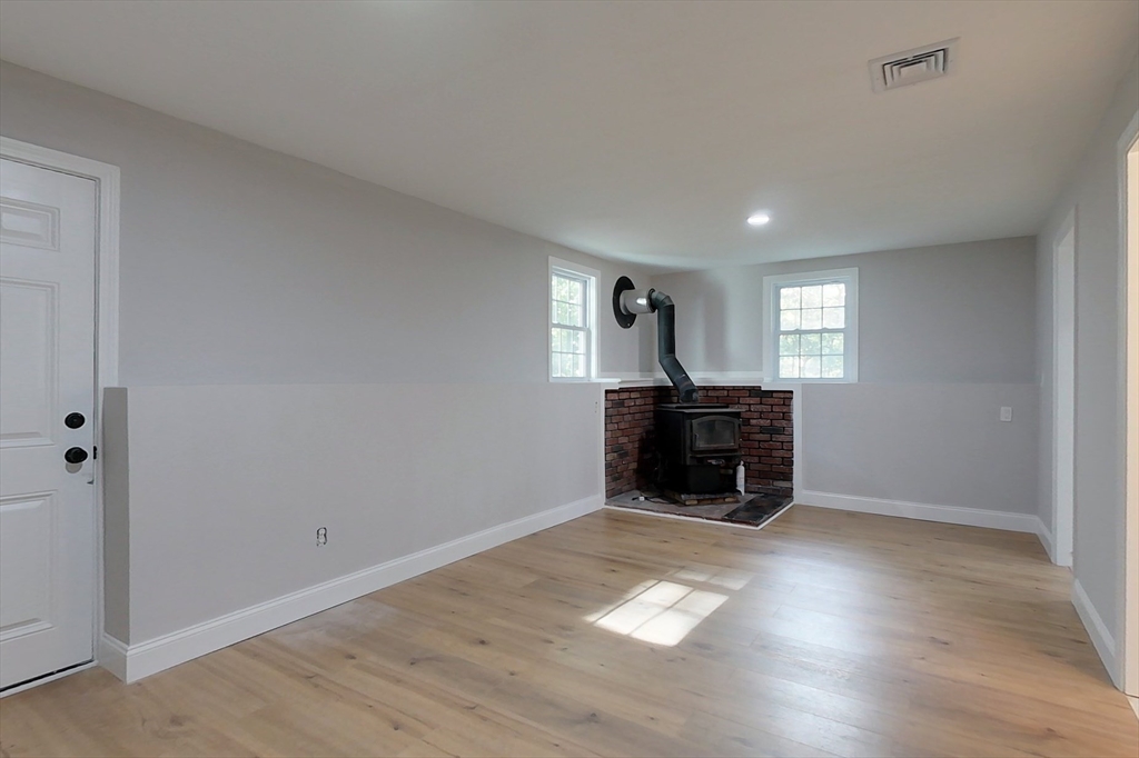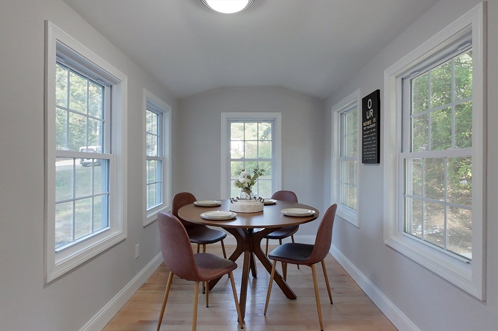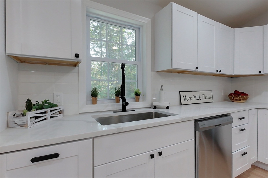 Enter into this renovated raised ranch, beautifully set on just under a 1/2 acre w/ the perfect balance of privacy & location. Light flooring leads into the open concept living room featuring cathedral ceilings, recessed lighting & plenty of windows flooding the space w/ natural light. The kitchen showcases white shaker cabinets, new appliances, a quaint island & opens to a dining area/enclosed porch wrapped in windows. Up a few steps, find 3 DRMS & a stunning full BA w/ a custom-tiled walk-in shower, glass surround & built-in seating. The finished lower level adds 400+ sq. ft. of living space, including a bonus room w/ a woodstove on a brick hearth, an office/flex room, full BA & a utility room. Additional highlights include central AC, a new roof & a low-level deck for outdoor enjoyment. All tucked back from the bustle of town, yet close to shops, schools, dining, & just minutes to Route 3. Showings begin at an Open House Sat 10/4 from 11-1pm w/ & Sun 10/5 from 2-4pm.