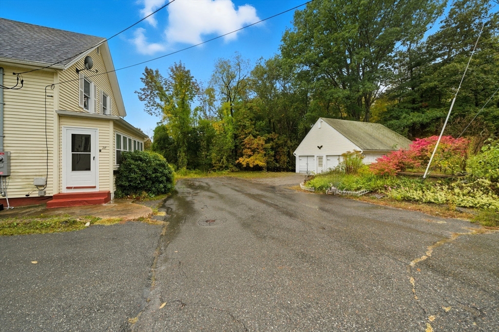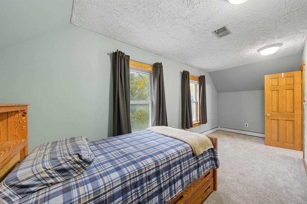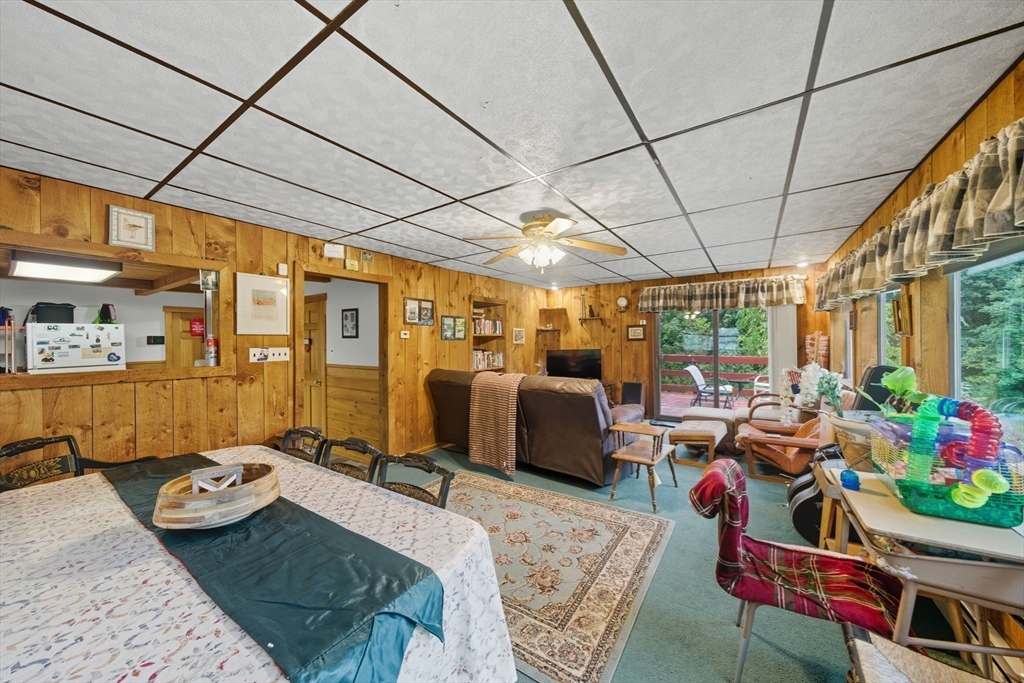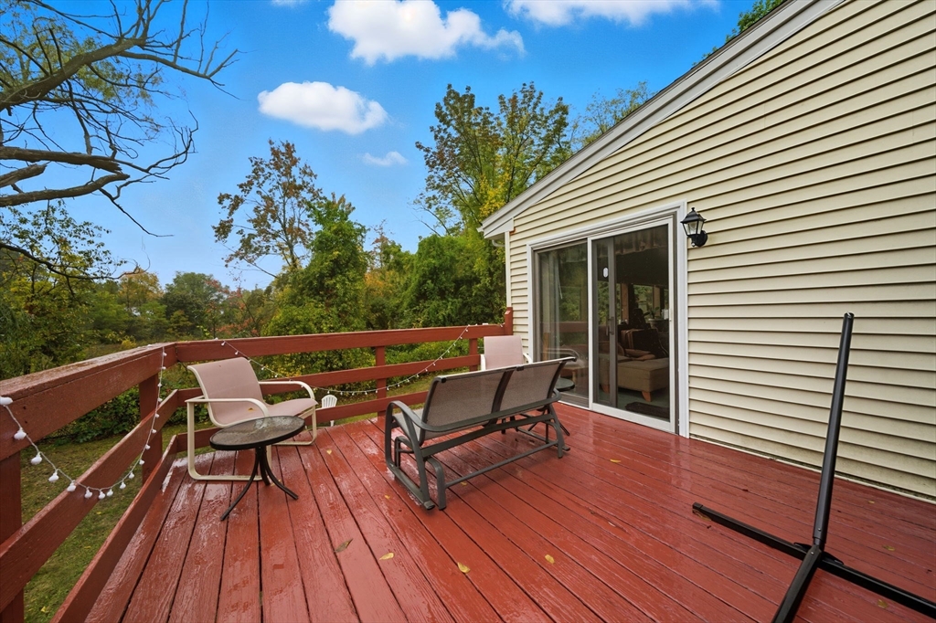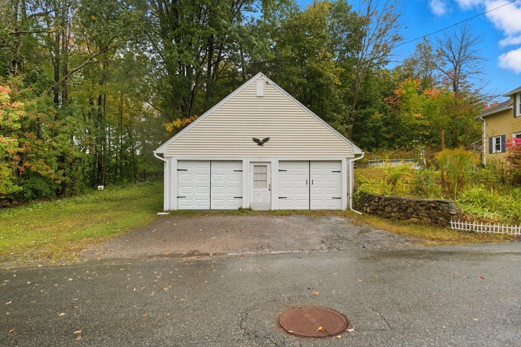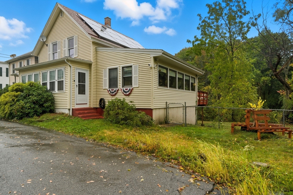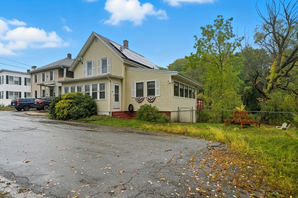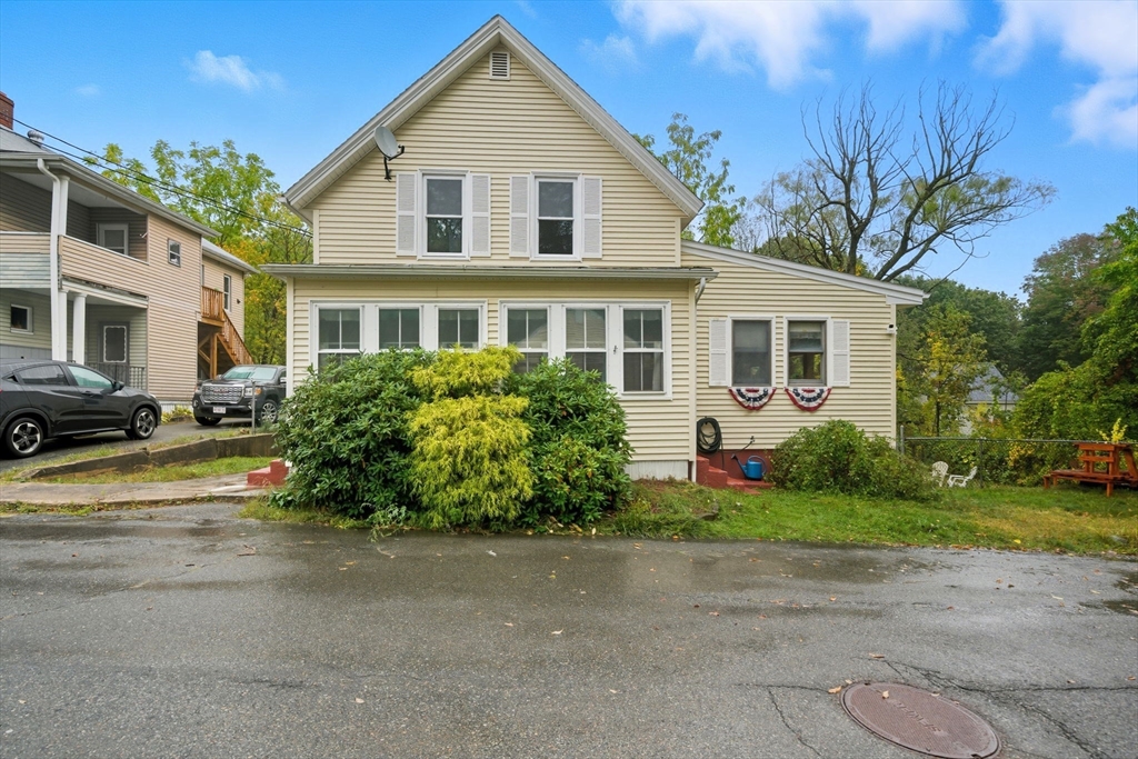 Tucked away on a quiet dead-end street, this Colonial offers privacy and a functional layout with 3 bedrooms and 1.5 baths. Start on the enclosed front porch, then step inside to the main level with a kitchen featuring ceiling beams, an open dining and living room with sliders to the back deck, a first-floor bedroom, and a half bath. Upstairs are two additional bedrooms, each with direct access to a shared full bath. The partially finished lower level provides bonus space with a recreation room, custom bar, laundry area, and utility space. Outside, enjoy the fenced yard from the back deck and a 2-car detached garage with a large loft space above for storage. Recent updates include solar panels ready for future mini-split installation, freshly painted bedrooms, and replaced stair carpeting. All appliances remain and all furniture is negotiable, making move-in easy. Gardner offers access to shopping, restaurants, parks, trails, and major commuter routes.
