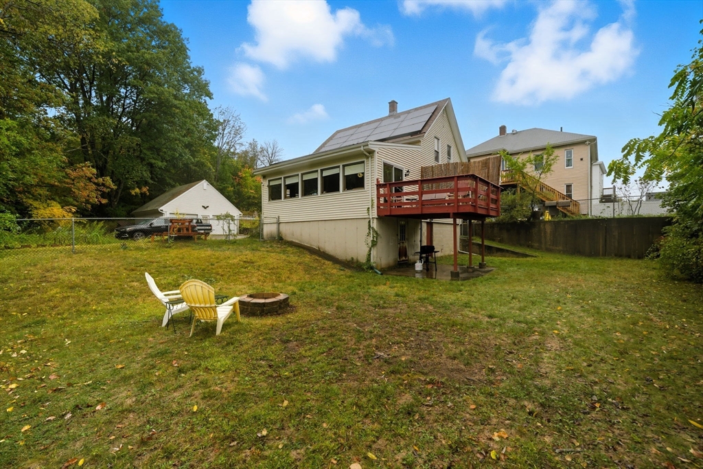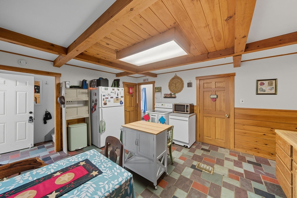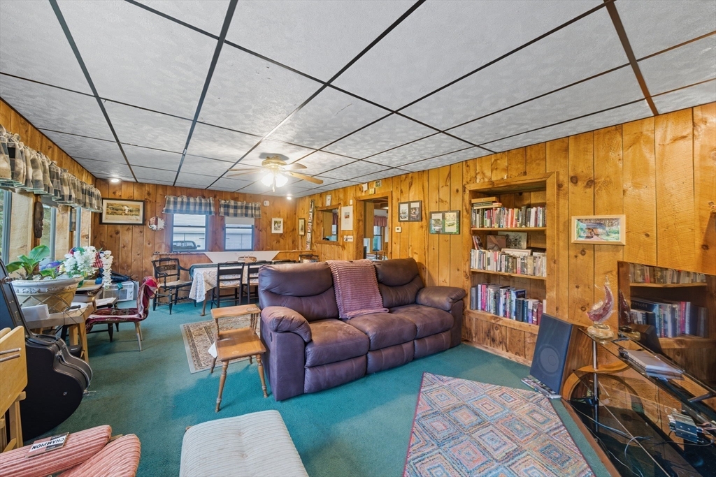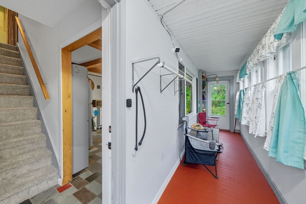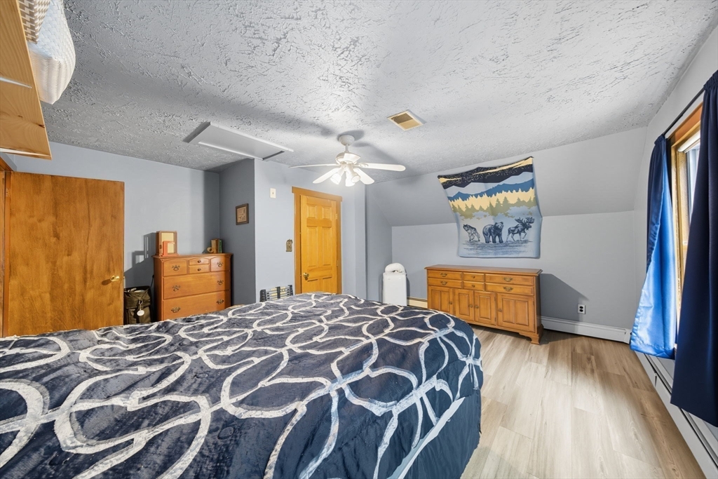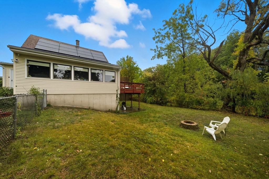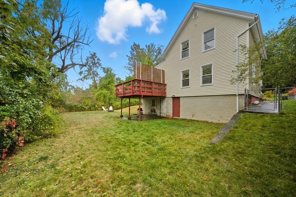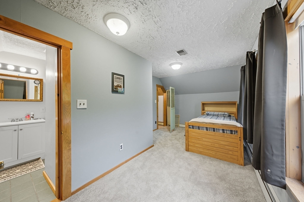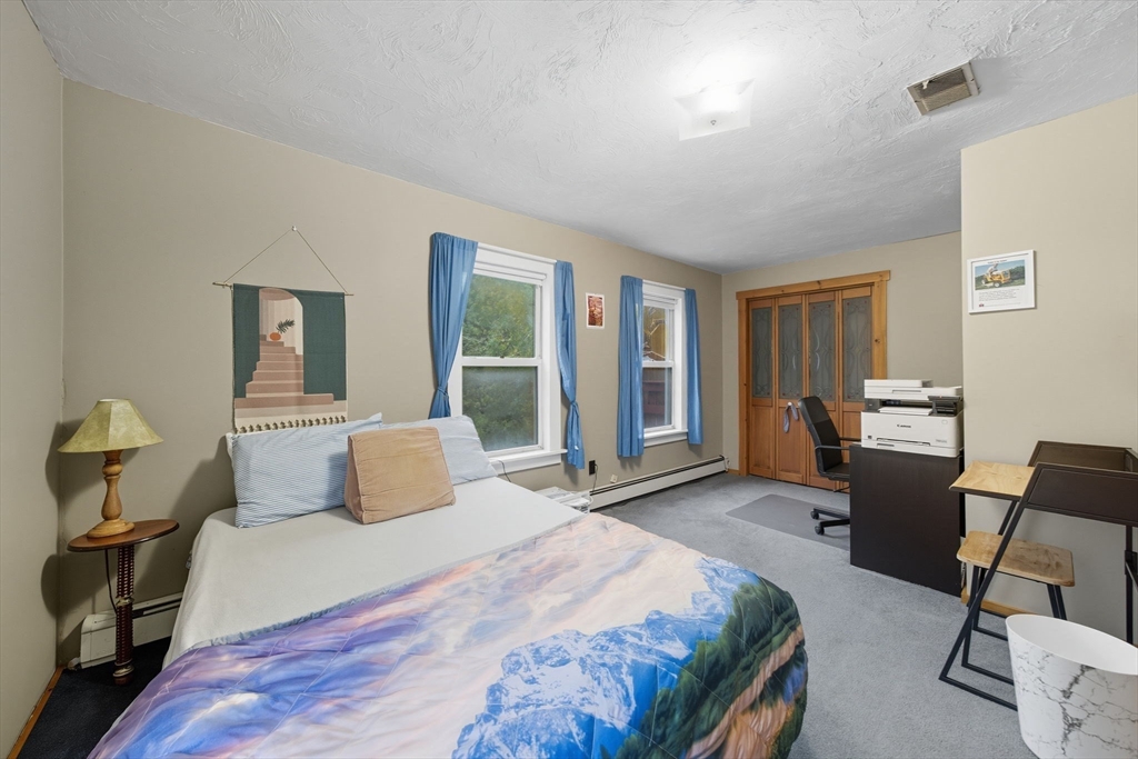 Tucked away on a quiet dead-end street, this Colonial offers privacy and a functional layout with 3 bedrooms and 1.5 baths. Start on the enclosed front porch, then step inside to the main level with a kitchen featuring ceiling beams, an open dining and living room with sliders to the back deck, a first-floor bedroom, and a half bath. Upstairs are two additional bedrooms, each with direct access to a shared full bath. The partially finished lower level provides bonus space with a recreation room, custom bar, laundry area, and utility space. Outside, enjoy the fenced yard from the back deck and a 2-car detached garage with a large loft space above for storage. Recent updates include solar panels ready for future mini-split installation, freshly painted bedrooms, and replaced stair carpeting. All appliances remain and all furniture is negotiable, making move-in easy. Gardner offers access to shopping, restaurants, parks, trails, and major commuter routes.