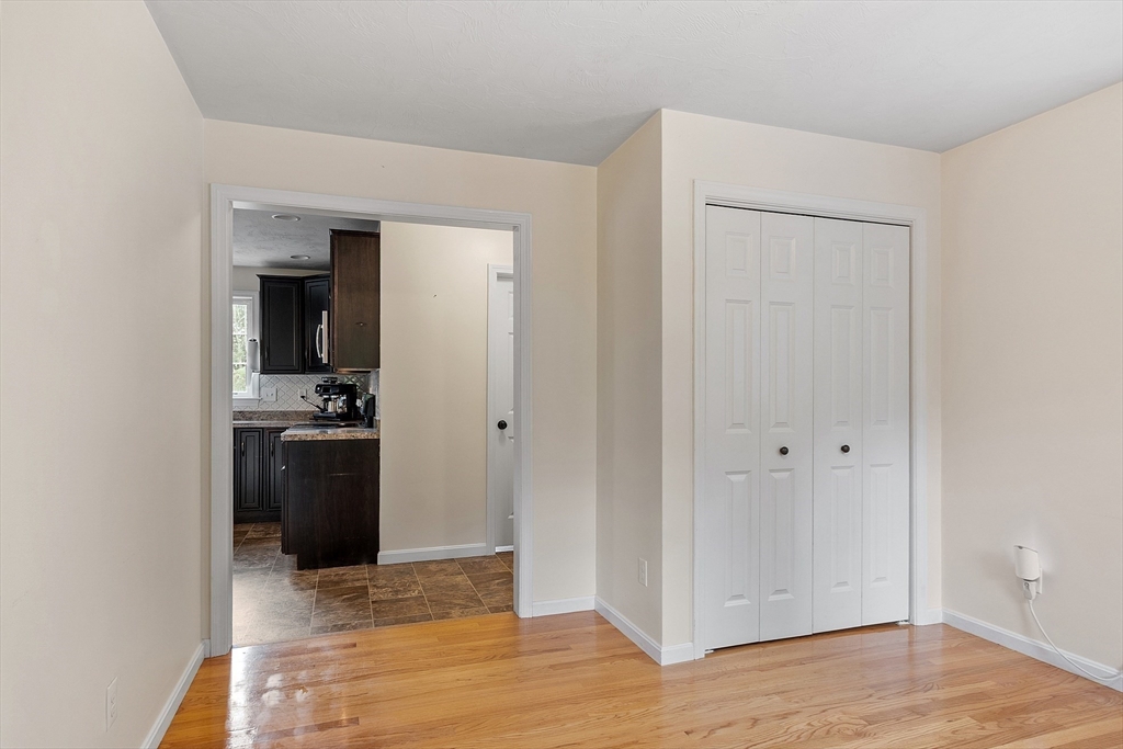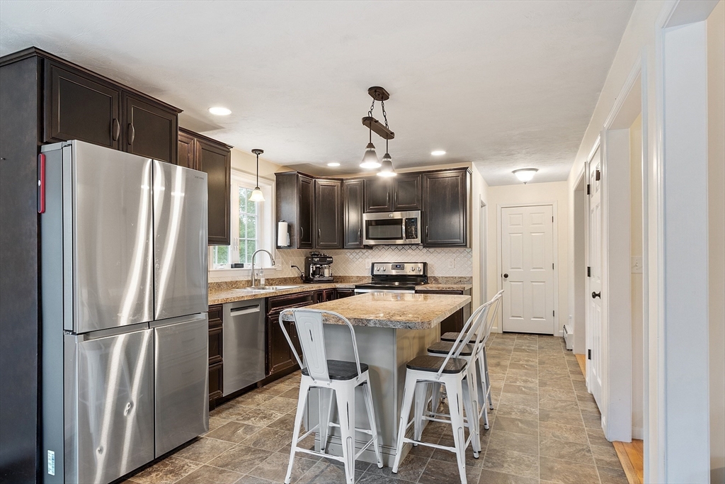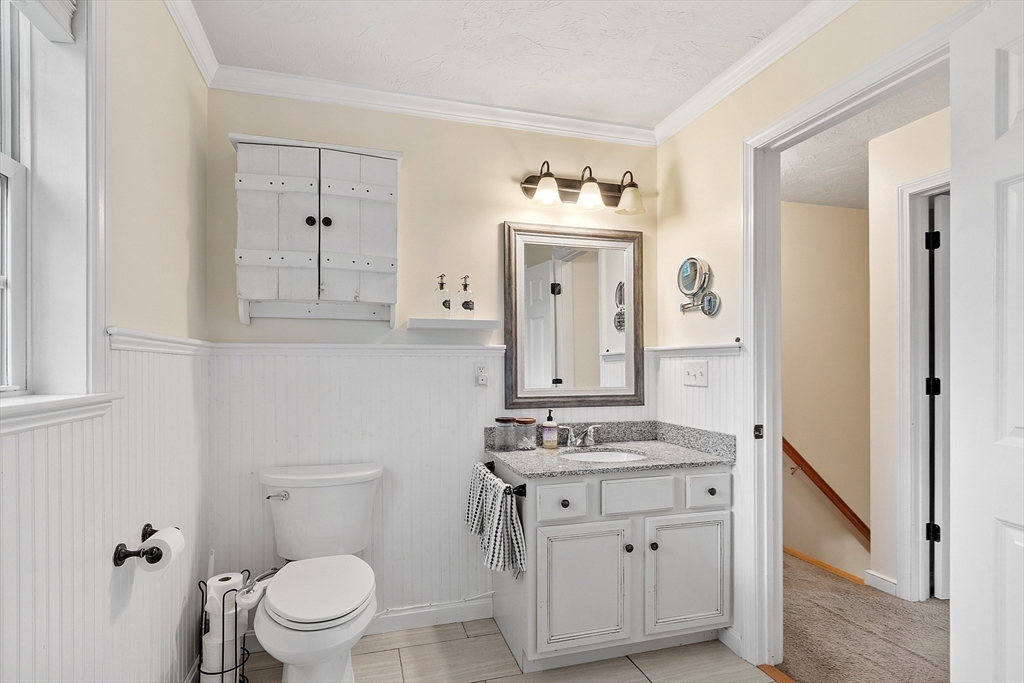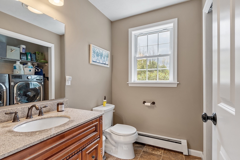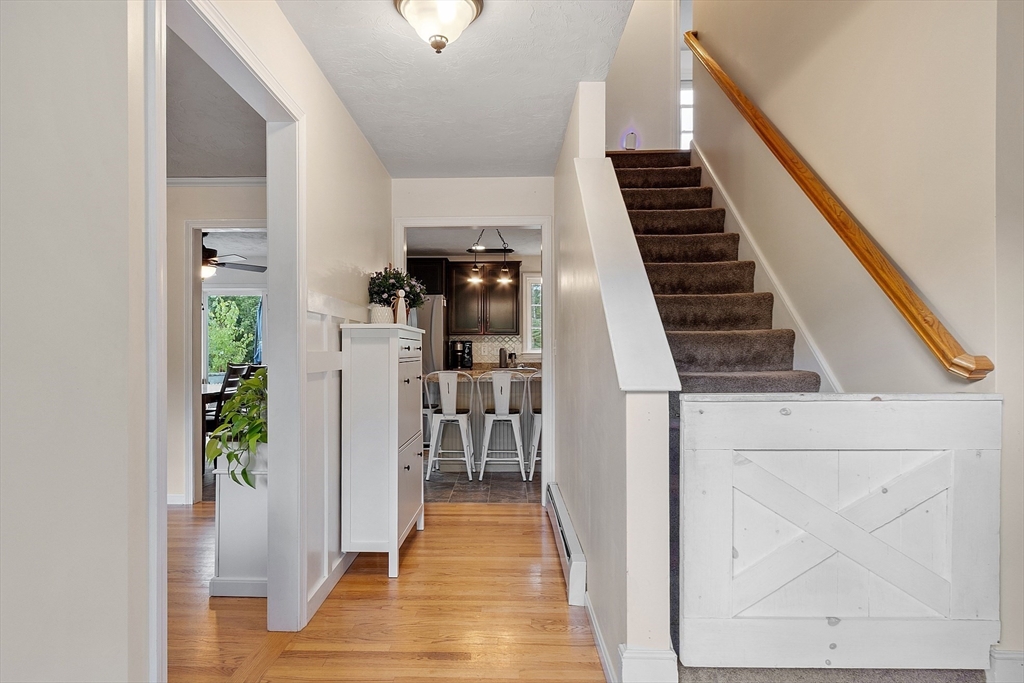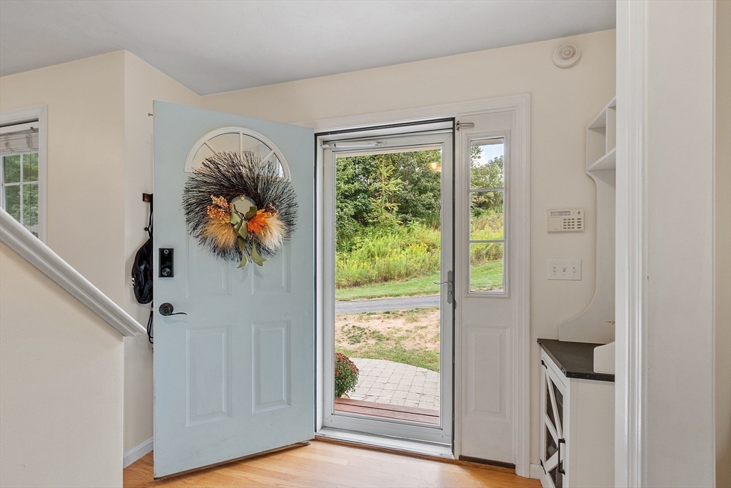 Welcome to this beautiful Federal Front Colonial, privately set back on a quiet, wooded lot in desirable neighborhood. This home offers the perfect blend of charm and function. A long paved driveway leads to a welcoming farmer’s porch and bright, sun-filled interior. The entryway, accented with wainscoting, opens to a spacious eat-in kitchen featuring a beadboard island, new stainless steel appliances, tile backsplash, crown molding, and gleaming hardwood floors. The first floor includes a versatile bonus room with closet—ideal for an office or playroom—plus a granite-appointed half bath with laundry. Upstairs, the oversized primary bedroom offers both a walk-in and second closet, along with two additional bedrooms and a full bath. The walk-out basement, framed with plumbing rough-in and full-size windows, provides excellent potential for expansion. A beautiful home in a peaceful setting, ready to welcome its new owners.