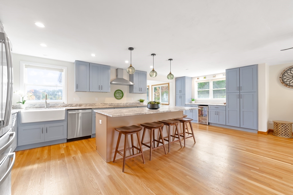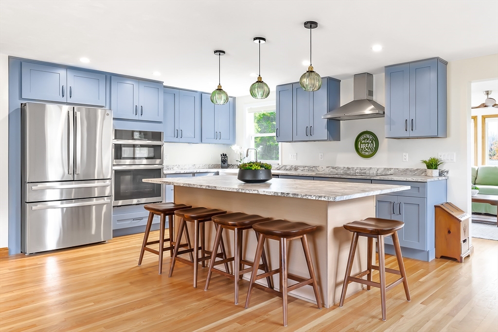 Location, location! This updated home on a bucolic, tree-lined side street, steps from Westwood, is arguably the most desirable neighborhood in Norwood. Newly reno'd state of the art kitchen is one you'd see in multi million dollar homes. Stainless appliances, vented out convection cooking, double ovens,under counter lights & huge island w/ seating will make any cook feel like a chef! Open concept kitchen/dining/living area makes for a warm, welcoming entertaining space. Family rm is bathed in natural light w/ all the surrounding windows. Sliders to deck for private morning coffee & access to lg backyard w/ patio & shed on this 15K sq ft lot. Direct access oversized two car garage w/ storage. Lower level could be a perfect in-law/au pair suite w/ its own kitchen area w/ stainless appliances,half bath, recently updated lg bonus rm w/ elec frplce & gym/possible bedrm or office, off back through laundry. New HVAC system,upgraded electric,5 yr old roof & 2 miles to Commuter Rail to Boston.
