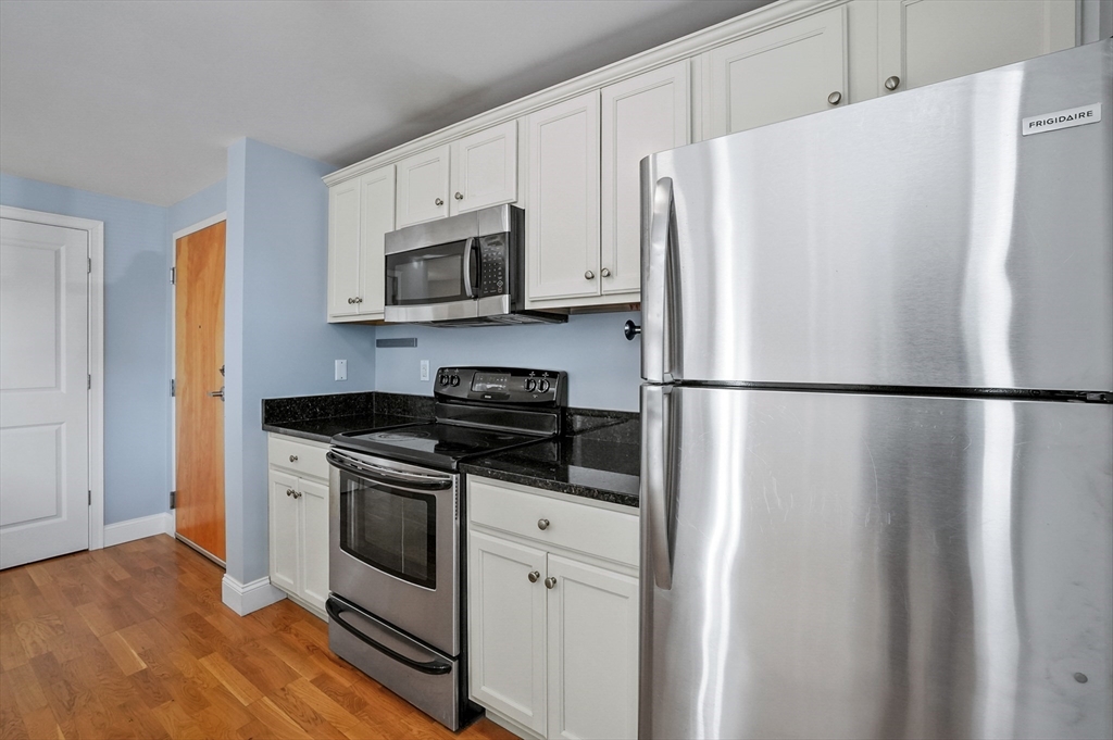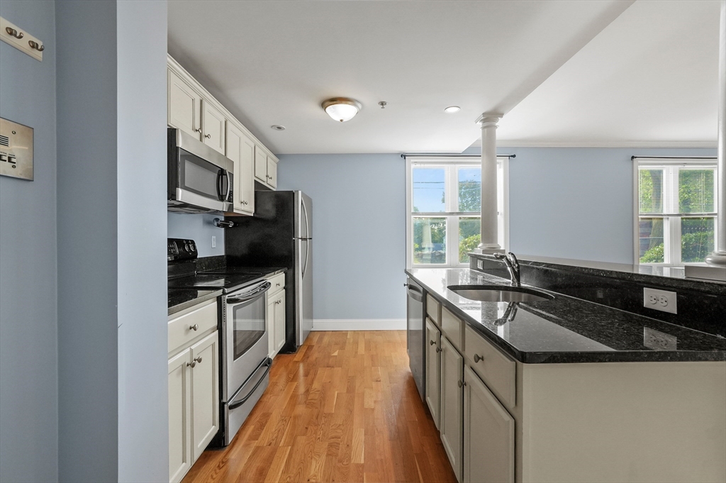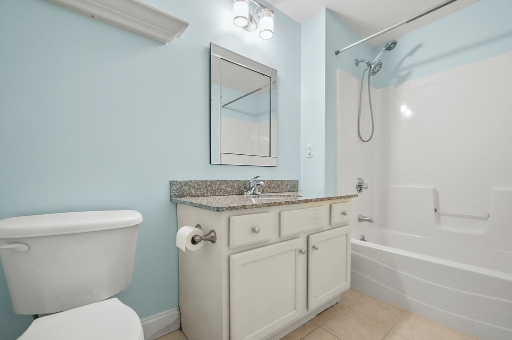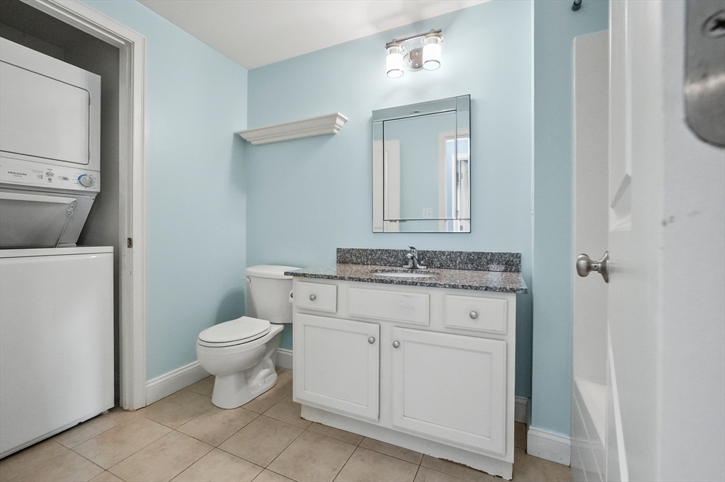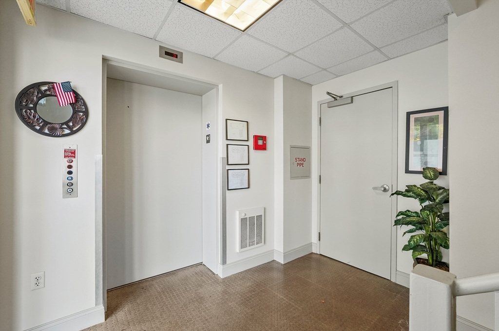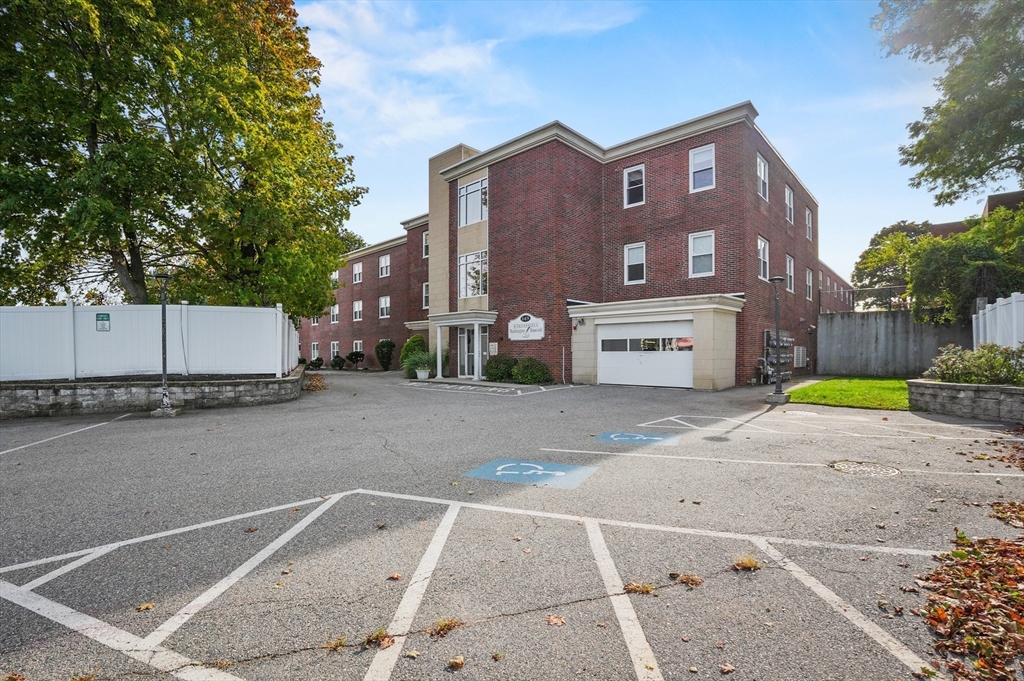 Corner unit condo in a convenient Braintree location, offering 2 bedrooms and 1 full bath with a bright, open layout. The living room features wood laminate floors, recessed lighting, and exterior access, while the kitchen boasts granite counters, stainless steel appliances, an electric stove, and a breakfast bar. The spacious main bedroom includes a walk-in closet, with a second bedroom perfect for guests or an office. The full bath has a tub/shower and in-unit laundry, updated with a new laundry center in January 2025. The dishwasher was replaced in 2022 for peace of mind. Parking is easy with a heated garage space (#14) and a second spot available in the outside lot—no sticker required. Association fee covers water, sewer, master insurance, exterior maintenance, snow removal, and more. Enjoy central air, extra storage, and an elevator in a well-maintained building close to highways, schools, and shops.