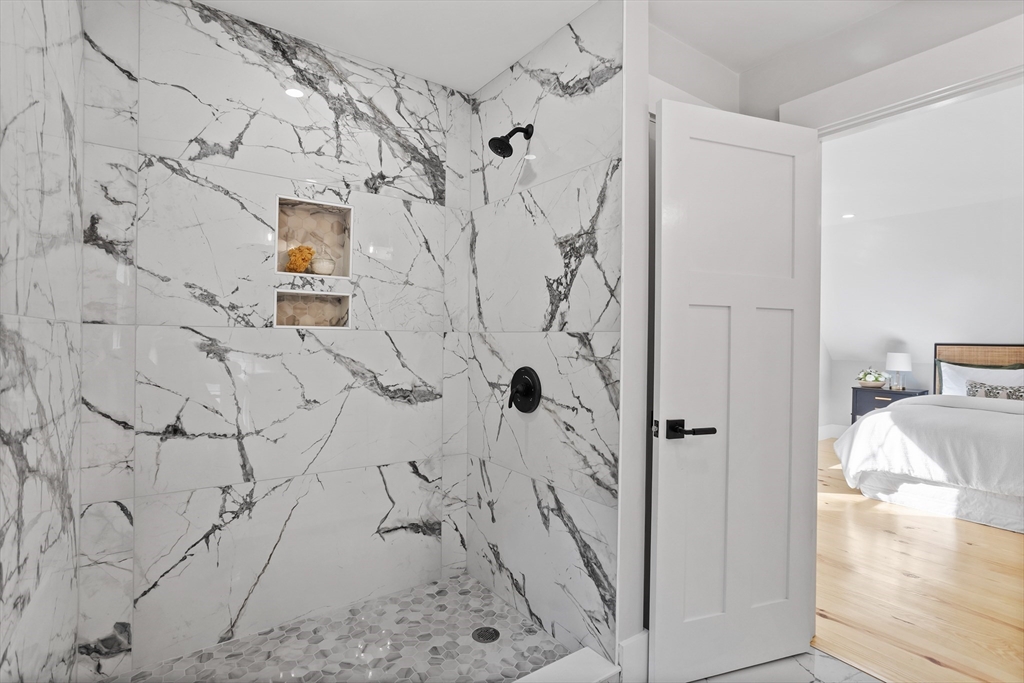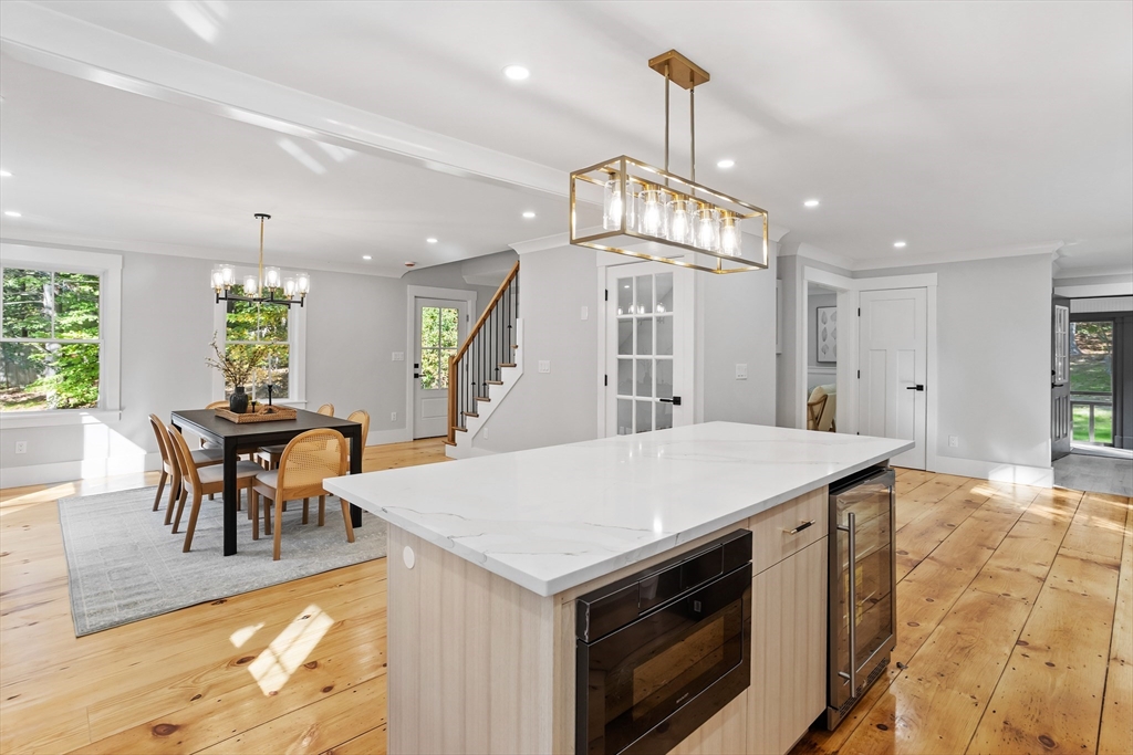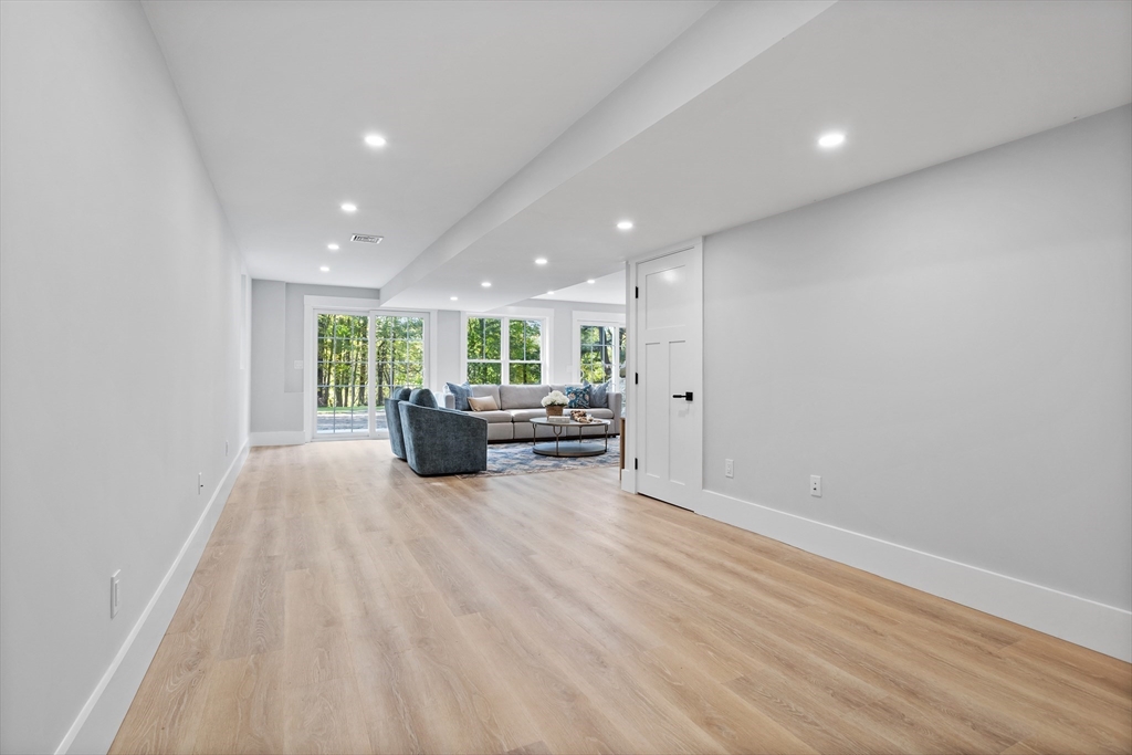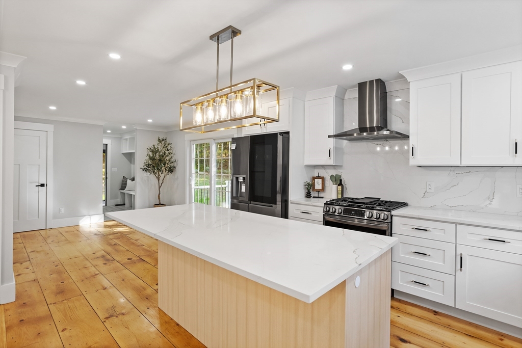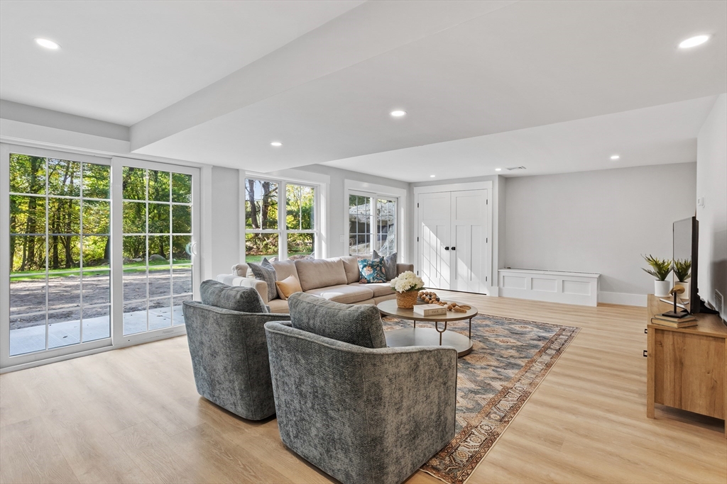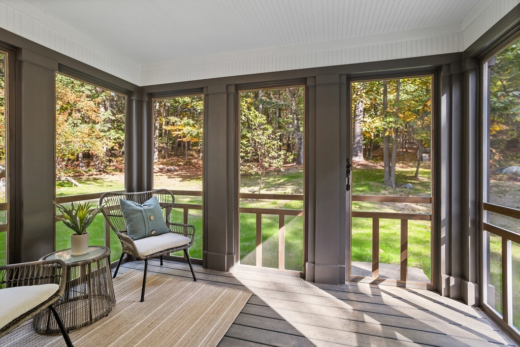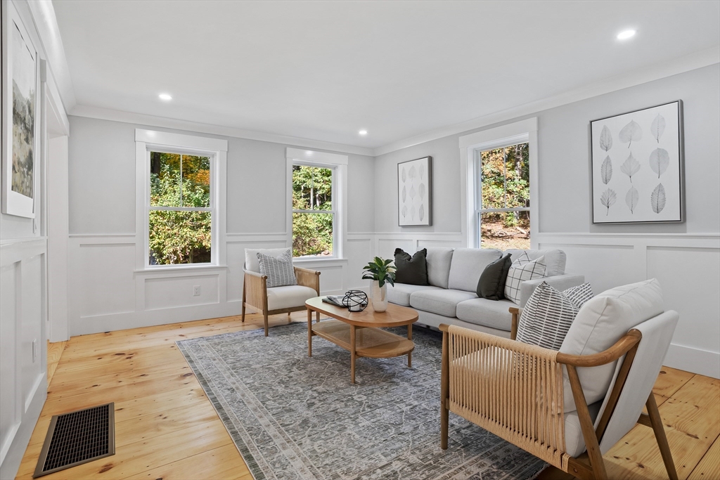A natural stone approach leads to this exquisitely remodeled Cape privately set on 2.7 serene acres abutting protected land. The stunning white center island kitchen w/ quartz counters, breakfast bar, gas range & sun-filled dining area flows into a spacious dining room & beautifully appointed living room—an open-concept design perfect for entertaining. Unwind in the dreamy primary suite showcasing a spa-worthy bath w/ luxurious tiled shower & double quartz vanity. Two additional bedrooms & gorgeous full bath complete the 2nd floor. The enviable finished walk-out lower level boasts a bath with tile shower, bonus space & a sprawling family room with twin sliders filling the space with natural light. Relax on the screen porch or composite deck overlooking tranquil woodland views. Striking wide plank floors, a convenient mudroom keeping busy lives organized & an oversized 3-car garage add style & functionality. A rare blend of New England charm & modern luxury in a picture-perfect setting.