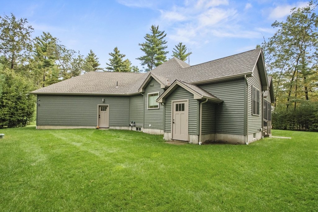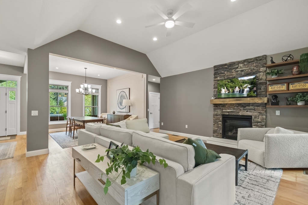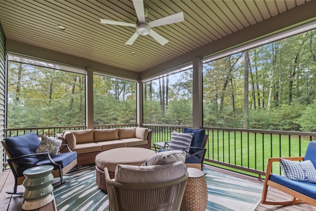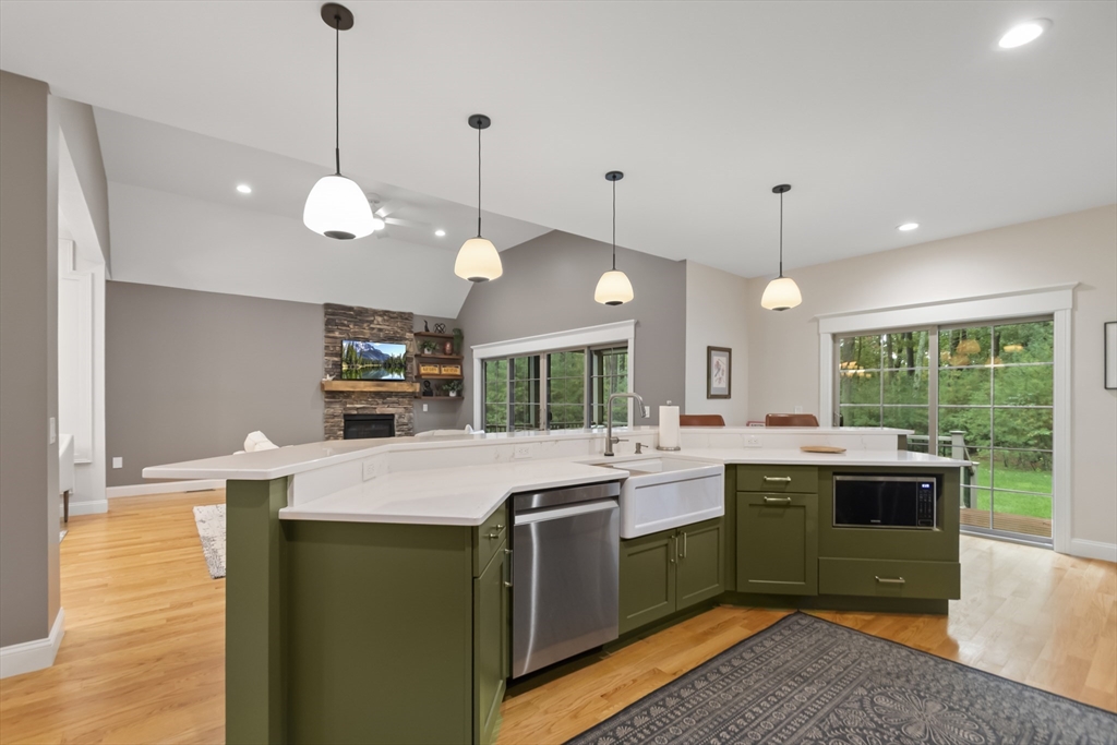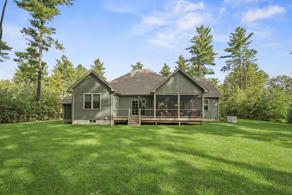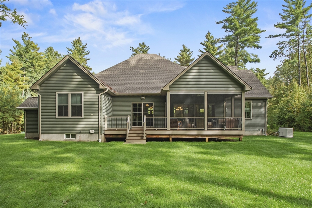 This stunning modern ranch, built in 2021, blends sleek design with everyday comfort on nearly an acre of beautifully landscaped grounds. The open floor plan highlights soaring cathedral ceilings, hardwood floors, and a dramatic stone fireplace in the living room. A chef’s kitchen shines with quartz counters, a spacious island, upgraded cabinetry, and stainless steel appliances, opening seamlessly to the dining area and composite deck for easy entertaining. The serene main suite offers a spa-like bath with double vanity, soaking tub, and walk-in closet. Two additional bedrooms both with hardwoods complete the package! Enjoy the convenience of central air, a propane heating system, central vacuum, and a full basement. Outdoors, a screened porch, sprinkler system, and level yard complete the picture. With easy access to shopping, trails, and highways, this gorgeous home delivers modern living at its finest.
