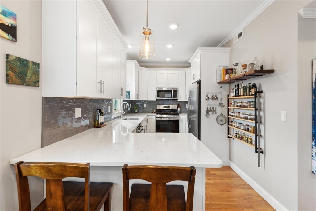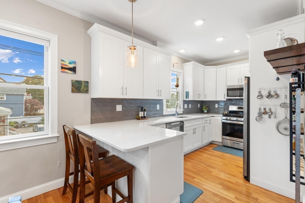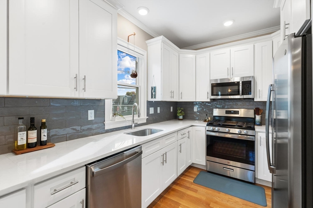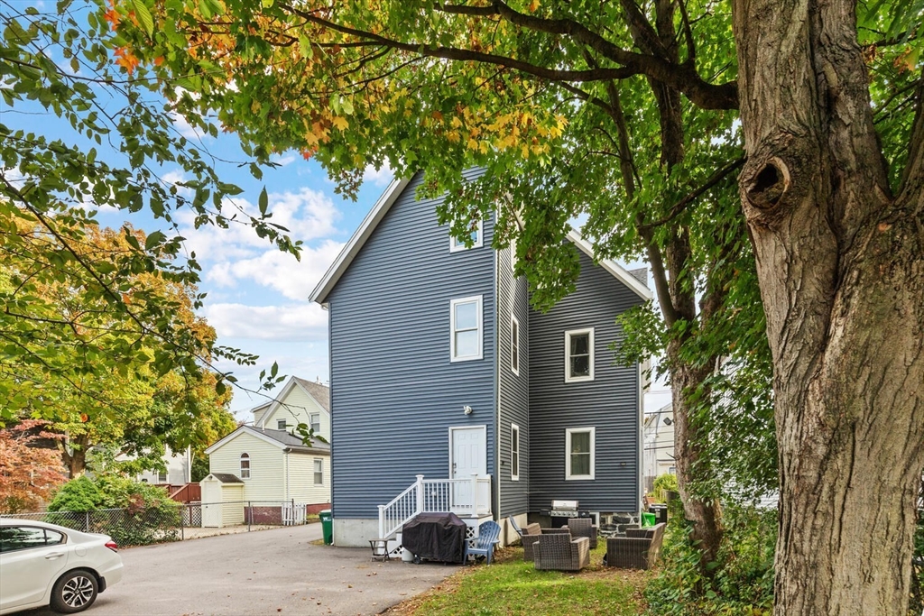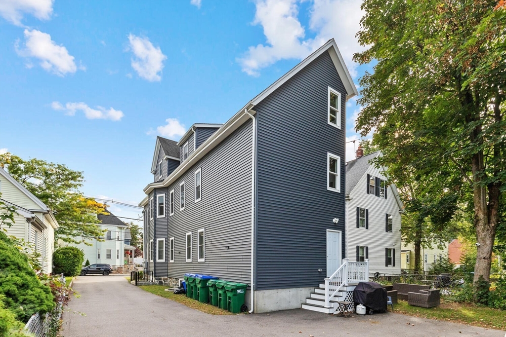 Stunning 3-bed, 2-full bath condo in prime Medford location, fully renovated to the studs in 2020! This thoughtfully designed home features a gorgeous kitchen with quartz countertops, tile backsplash, ample counter space, stainless steel appliances and a breakfast bar—perfect for entertaining. The open-concept layout flows from the sun-splashed, dining area into a spacious living room. The primary suite offers a walk-in closet and luxurious bath. Enjoy in-unit laundry, a mudroom-style back entry, exclusive outdoor space, deeded parking, and an oversized private storage room in the basement. Enjoy the close proximity to all the shops and restaurants in Medford Sq. AND Assembly Row. Having the T stations, highways, parks, and playgrounds so nearby makes this unit truly a rare find!