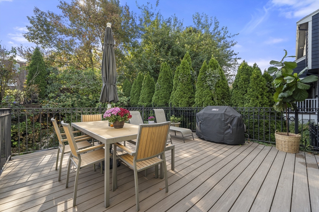 Welcome to this charming 3-bedroom, 2.5-bathroom townhome in Charlestown, offering exceptional natural light and incredible space across three levels of thoughtfully designed living. The entry level features a charming suburban-inspired mudroom that doubles as a home office, along with a bedroom tucked at the rear of the home and a convenient half bath, ideal for guests. Upstairs, the open-concept kitchen and dining area flow seamlessly to a private back deck, perfect for entertaining. The kitchen is outfitted with sleek Bosch stainless steel appliances, a spacious center island, and abundant cabinet storage. The adjacent living room boasts custom built-ins, generous natural light, and a cozy gas fireplace. On the top floor, two large bedrooms each offer large custom closets. The primary suite includes a ensuite bathroom with a double vanity and an additional full bath with a tub is located on this floor. The best part, two deeded parking spaces, one garage!