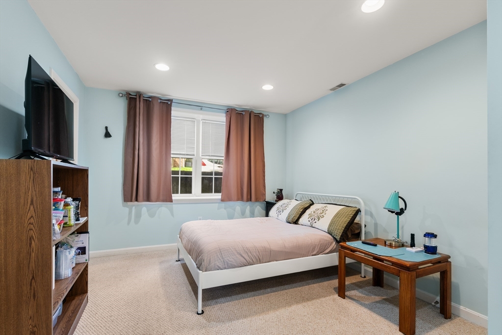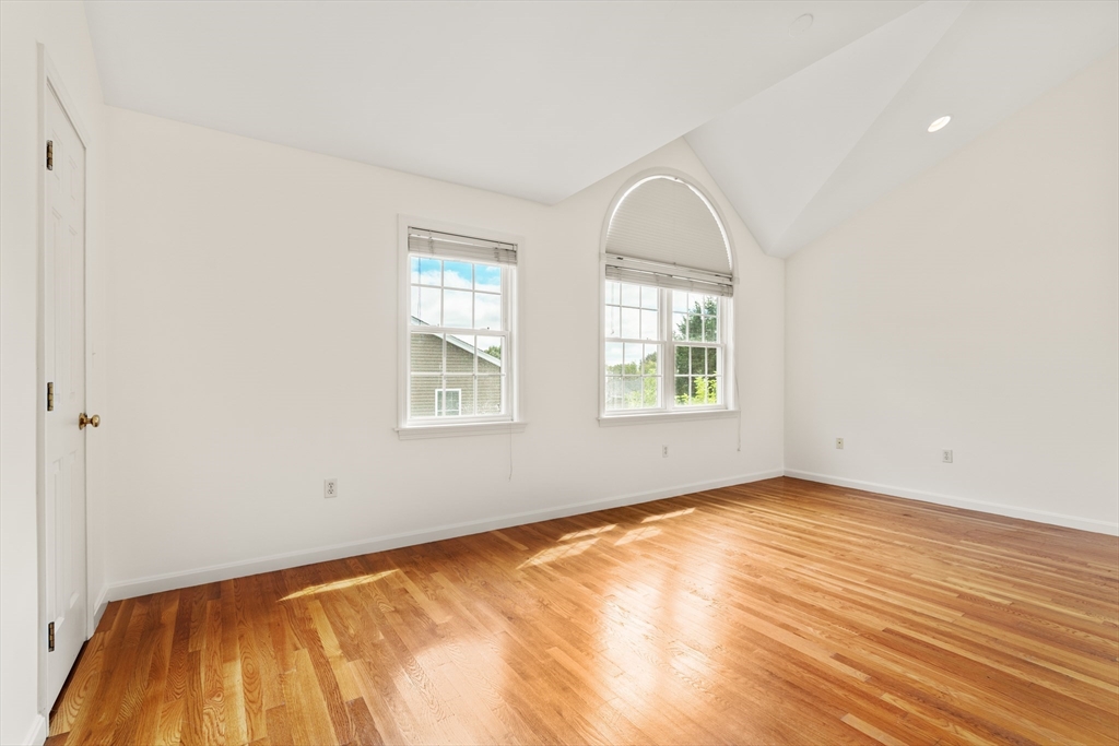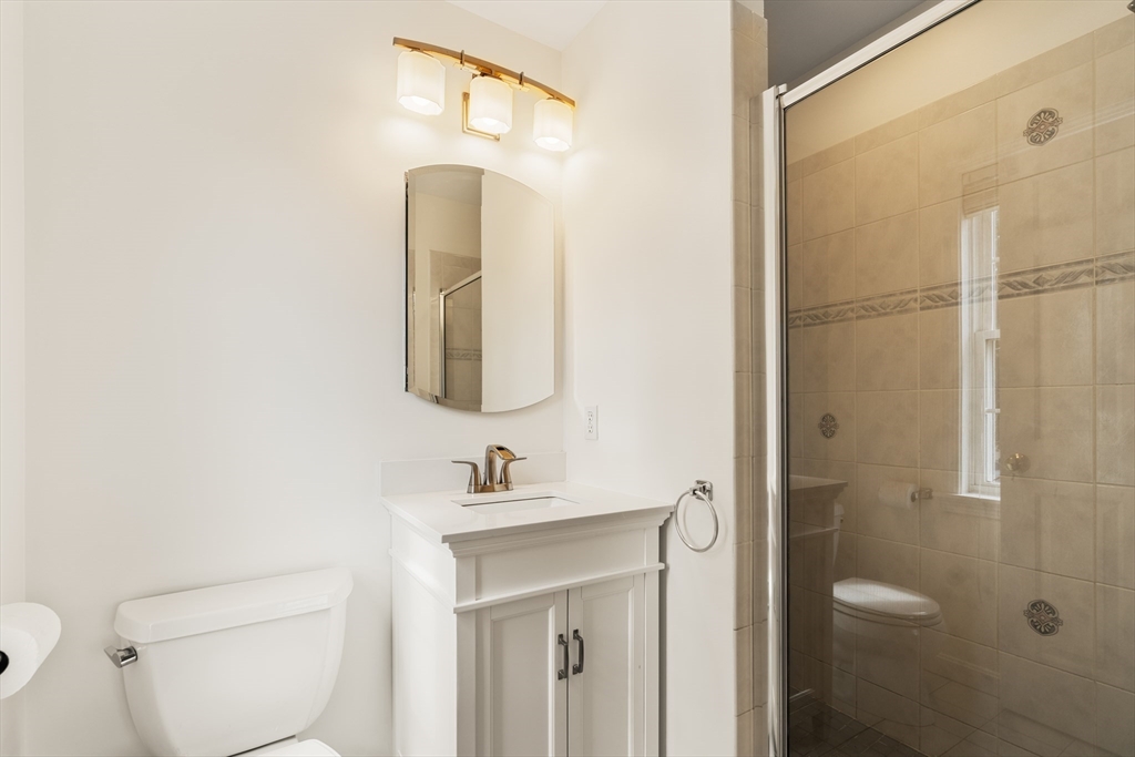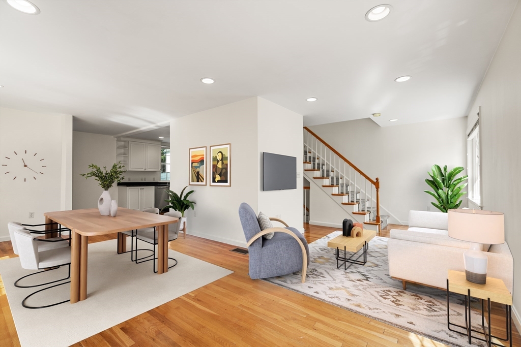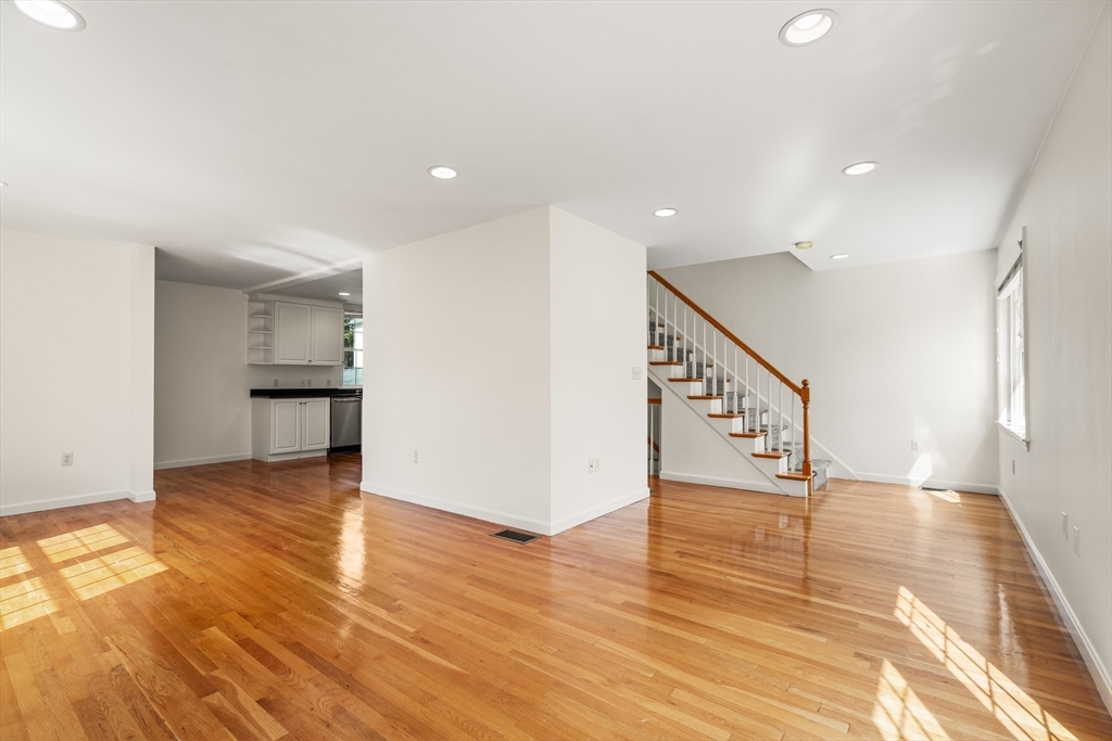 MOVE RIGHT INTO THIS PRISTINE END UNIT IN DESIRABLE TERRACES CONDOMINIUM COMPLEX! This 3 bedroom, 3.5 bath home with open floor plan, hardwood floors, central air conditioning and garage parking is convenient to 95, Cambridge and Boston! The main level features an updated kitchen with granite counter tops and stainless steel appliances, dining room, gas fireplace, living room with access to a private deck, and a powder room. The open floor plan allows for seamless flow between the living, dining, and kitchen areas, creating a comfortable and inviting atmosphere. The second level will impress with a spacious cathedral ceiling primary bedroom suite with palladium window, master bath, walk in closets, an additional spacious bedroom and bath, and in unit laundry. The lower level greets you with a welcoming foyer and garage access along with the first floor ensuite bedroom and full bath. The home is Pet friendly! (one dog or cat under 50 lbs).