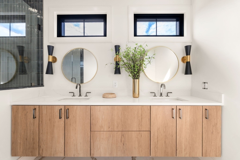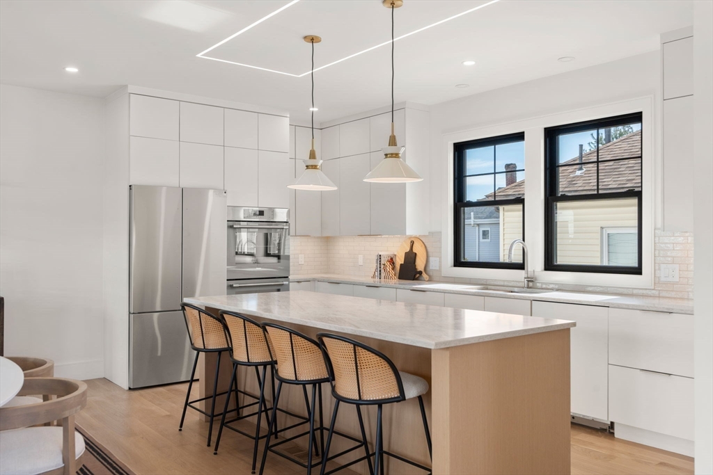 Welcome to Newton’s newest luxury townhomes, where modern architecture & refined elegance span three levels of exceptional living. Enter through the two-car garage with EV charger into a thoughtfully designed mudroom with heated floors, a chic half bath, & a custom-built office. The main level offers an expansive open plan with curated lighting, a chef’s kitchen equipped with Thermador appliances, an elegant dining area opening to a private deck, & a luminous living room with a striking stone fireplace, bespoke built-ins, & a full bath. Upstairs, discover three generously sized bedrooms, including a serene primary suite with its own private terrace. A well-placed laundry area & an additional full bath enhance convenience. Ideally situated near boutique shopping, Whole Foods, public transit, & just minutes from downtown Boston & I-90, this residence achieves the perfect balance of luxury & lifestyle. Experience the pinnacle of Newton living.