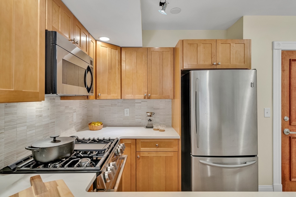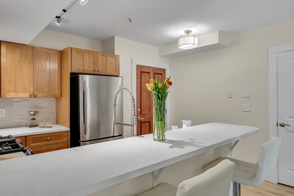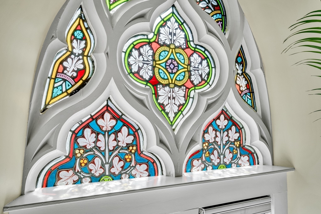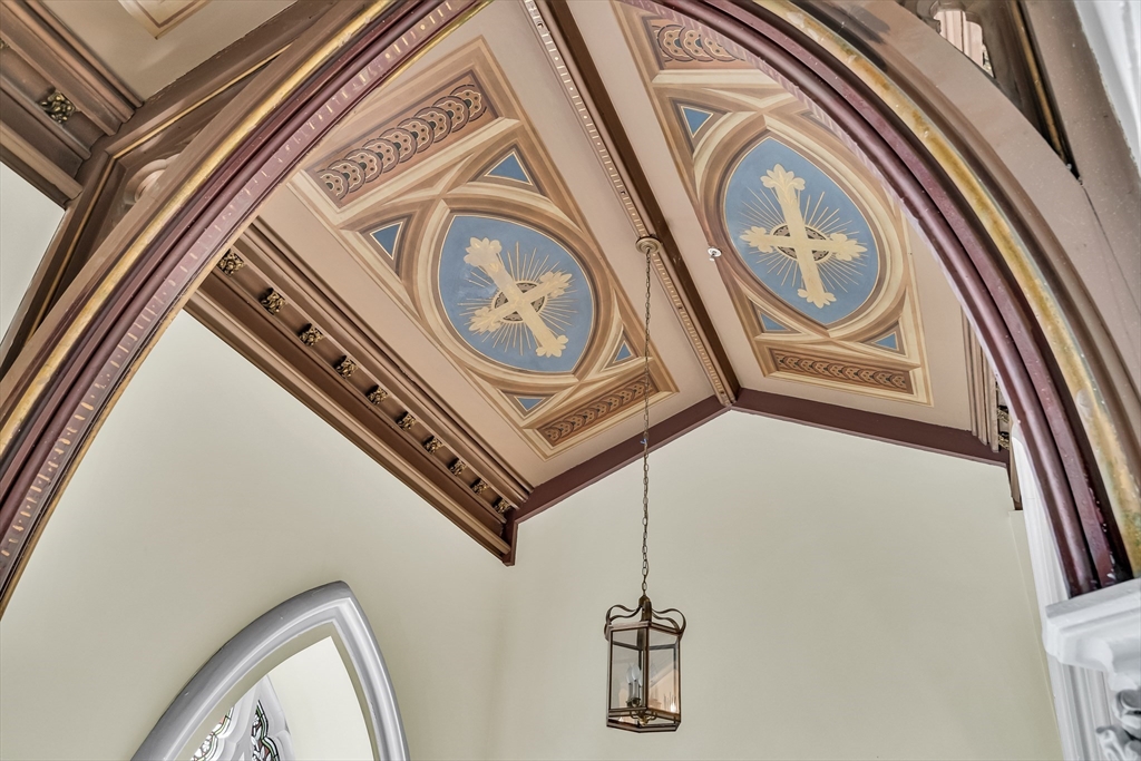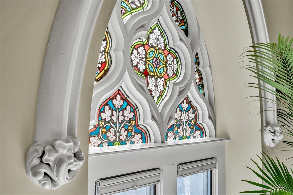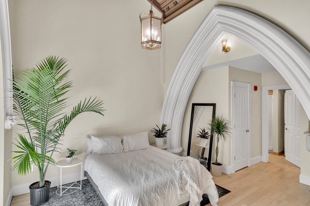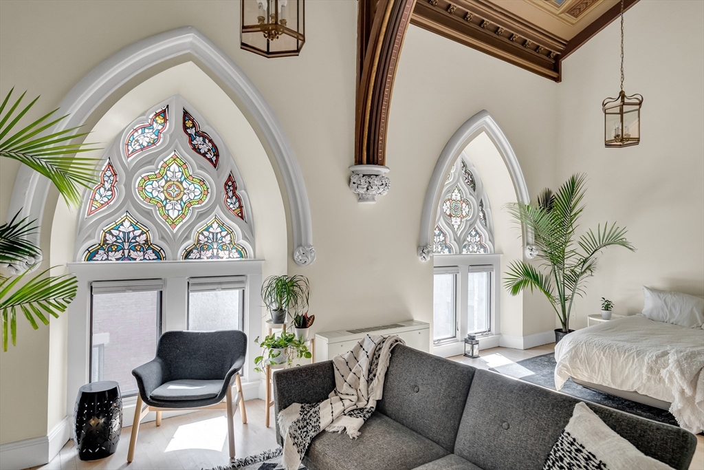 1-OF-A-KIND Condo located in a former Church in prime South Boston location just steps to the Broadway red-Line T stop! Timeless elegance meets the conveniences of modern living. This unique space has grand columns that accentuate its historic character, vaulted ceilings with the original hand painted pattern, & 4 gorgeous stained glass windows casting colorful patterns across the space. The open-concept space with hardwood floors throughout features a chefs kitchen with large quartz counter-top & breakfast bar. Gas cooking & lot of storage. In-unit washer& dryer, deep soaking tub, central A/C & custom closets. 1 DEEDED PARKING spot included. Low condo fee, perfect for owner occupant or investor. All in a well maintained professionally managed elevator building.