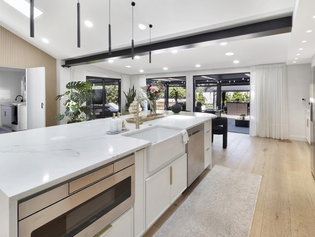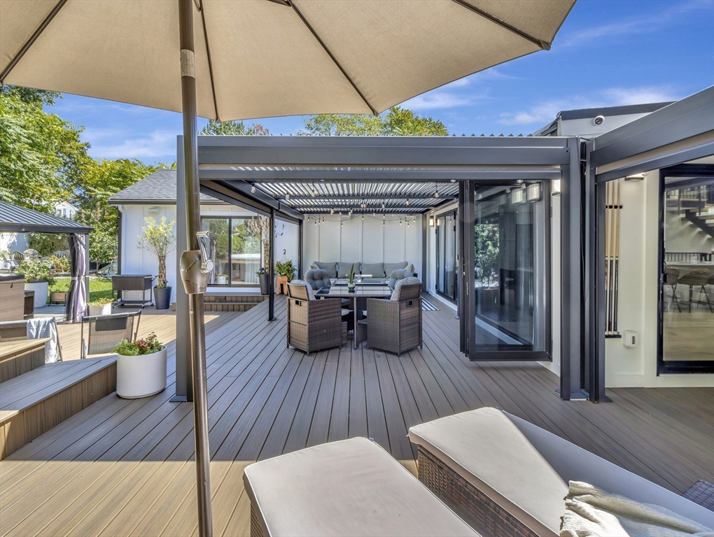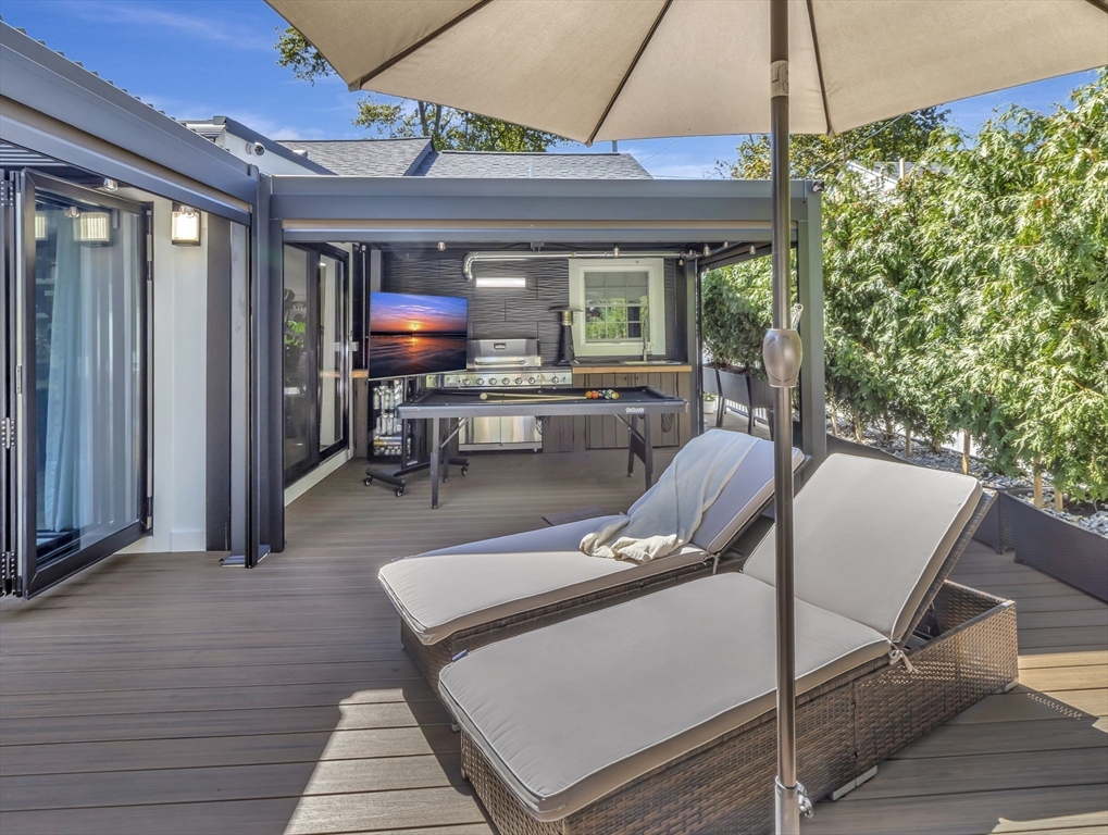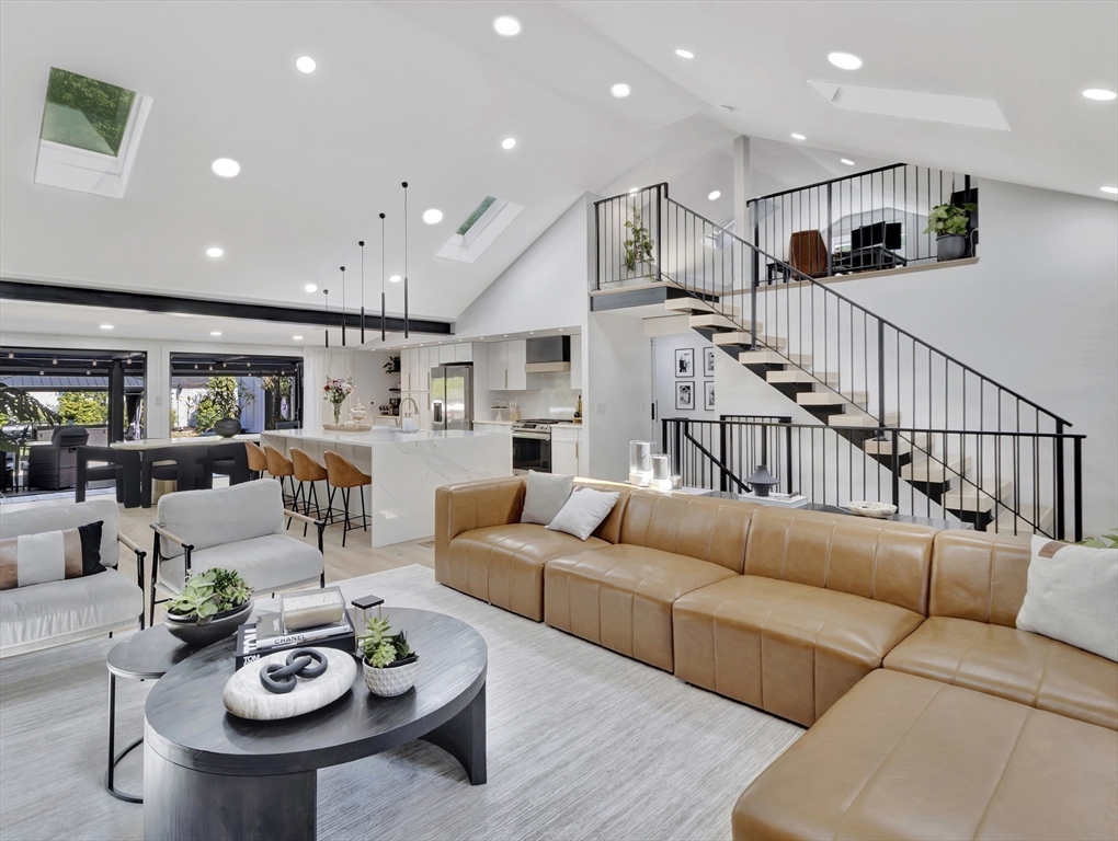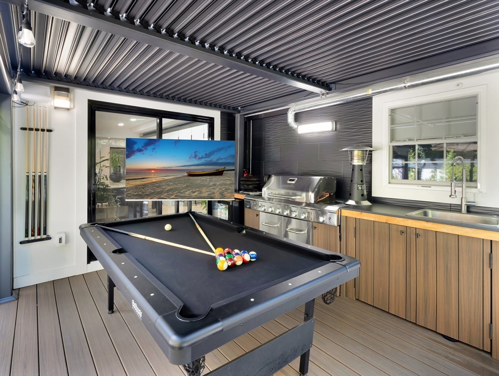 This beautiful home presents an unparalleled opportunity to own a luxury property in pristine condition. Situated in a desirable area, with a superb combination of sophisticated design and top-tier materials. The heart of this amazing residence is the kitchen, designed with both aesthetics and functionality in mind. The kitchen's shaker cabinets offer abundant storage, while the stone countertops provide a durable and elegant workspace. A skylight floods the space with natural light, complementing the backsplash and illuminating the island and bar. Open to a covered deck that leads to the adult playground beyond w/unparalleled outdoor spaces for endless entertaining possibilities. The living room presents a dramatic picture defined by its vaulted ceiling, further enhanced by a skylight that lets the sunlight in. A primary ensuite that wows, tons of storage, finished areas for exercising, gaming, relaxing and entertaining, surround sound throughout, there is something here for everyone.
