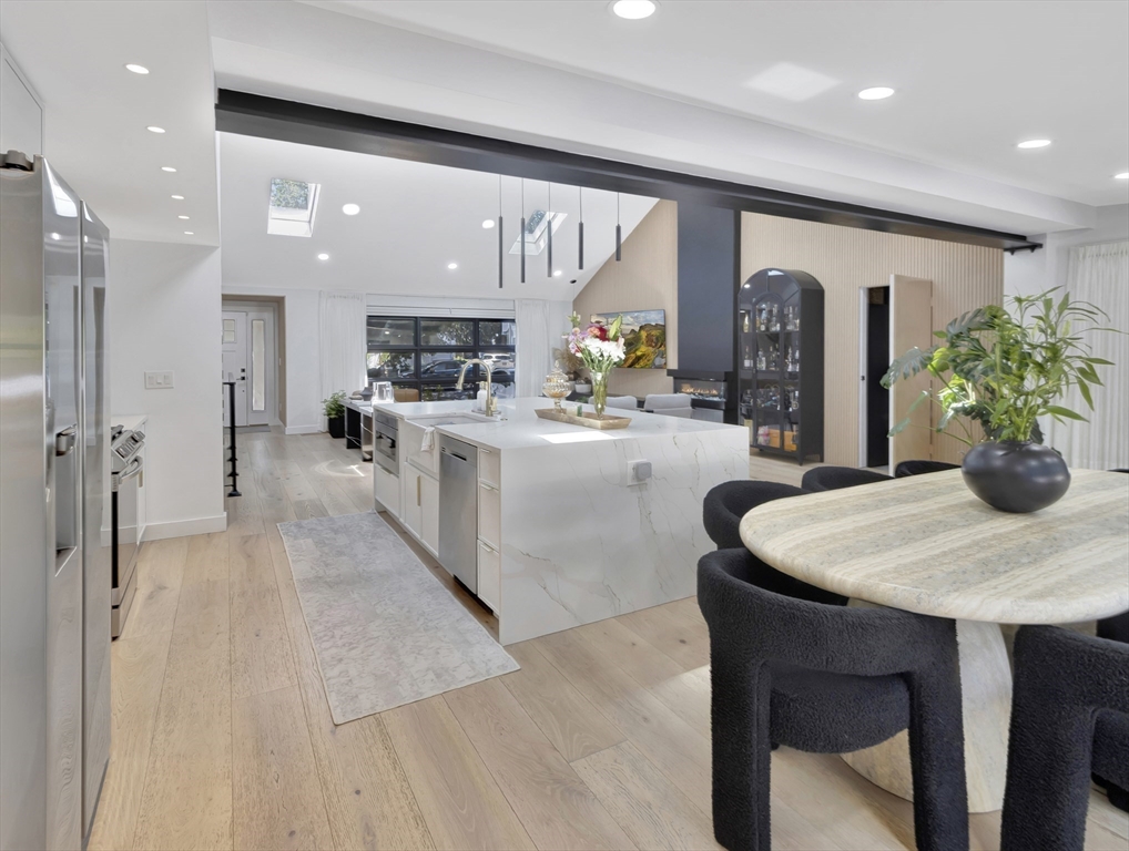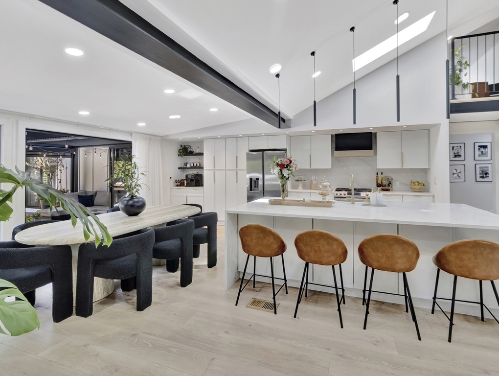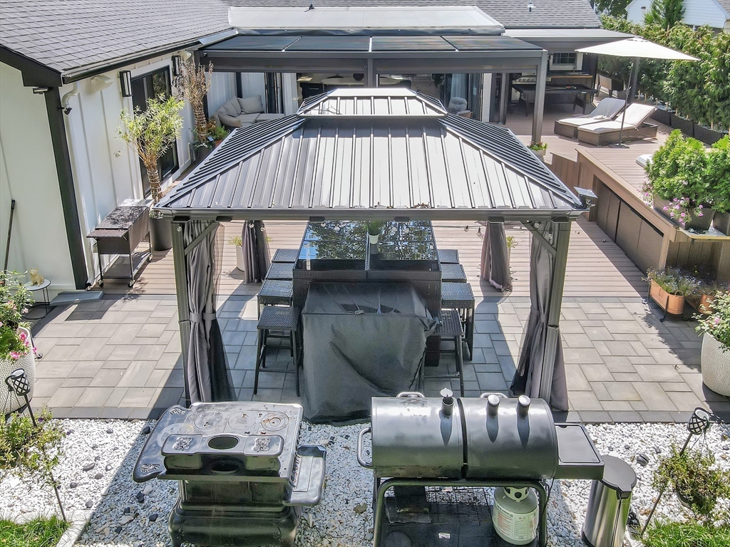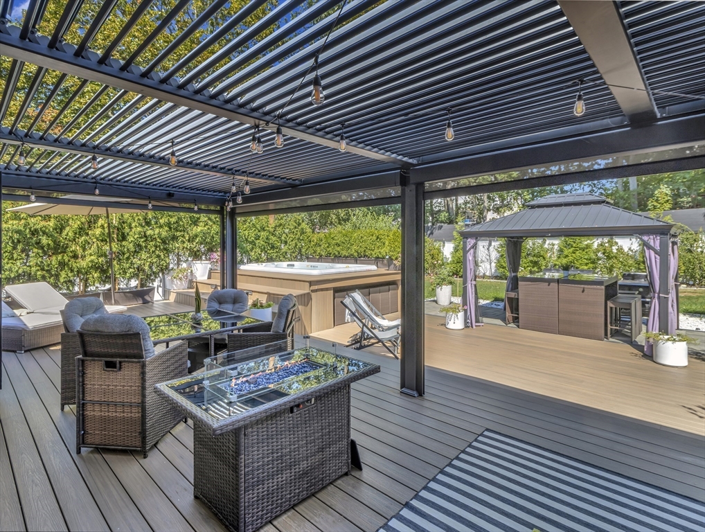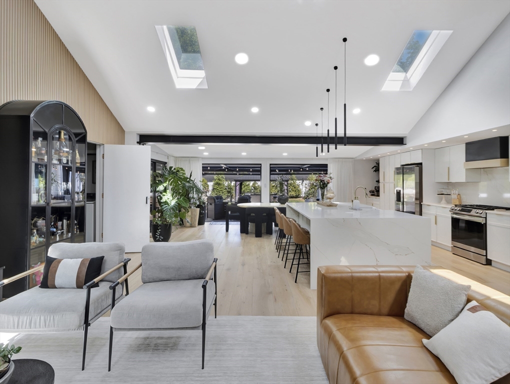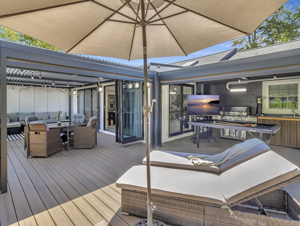 This beautiful home presents an unparalleled opportunity to own a luxury property in pristine condition. Situated in a desirable area, with a superb combination of sophisticated design and top-tier materials. The heart of this amazing residence is the kitchen, designed with both aesthetics and functionality in mind. The kitchen's shaker cabinets offer abundant storage, while the stone countertops provide a durable and elegant workspace. A skylight floods the space with natural light, complementing the backsplash and illuminating the island and bar. Open to a covered deck that leads to the adult playground beyond w/unparalleled outdoor spaces for endless entertaining possibilities. The living room presents a dramatic picture defined by its vaulted ceiling, further enhanced by a skylight that lets the sunlight in. A primary ensuite that wows, tons of storage, finished areas for exercising, gaming, relaxing and entertaining, surround sound throughout, there is something here for everyone.