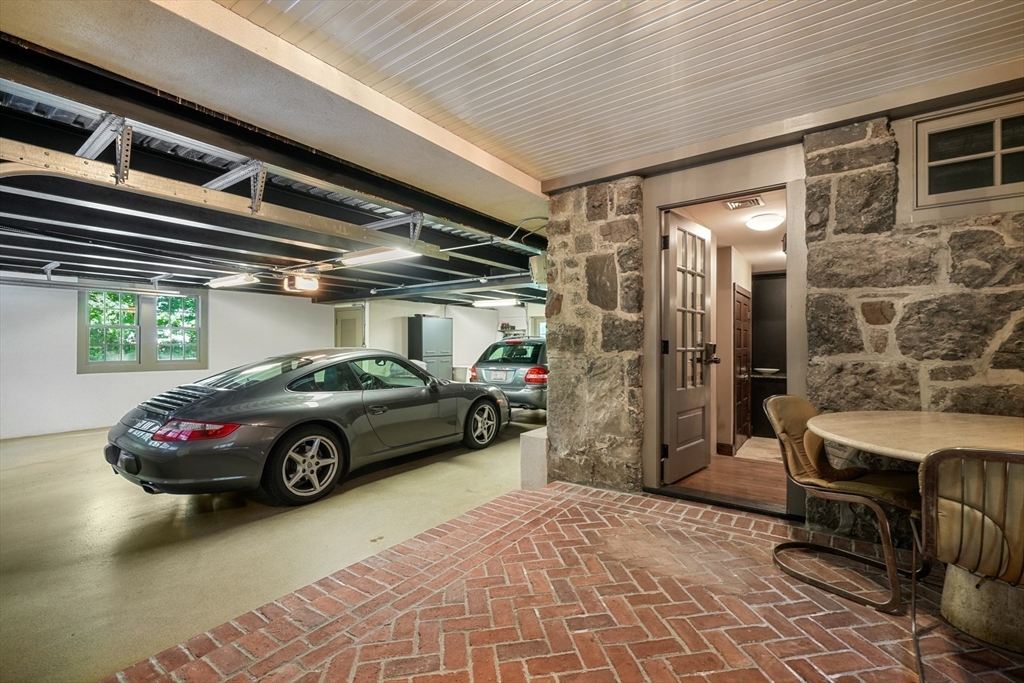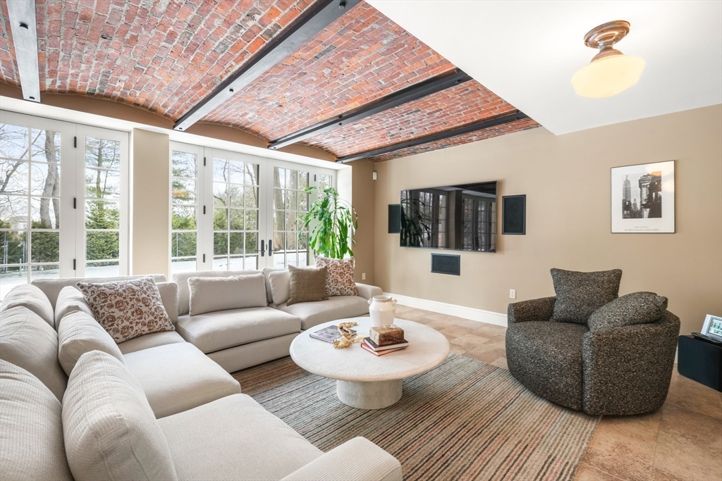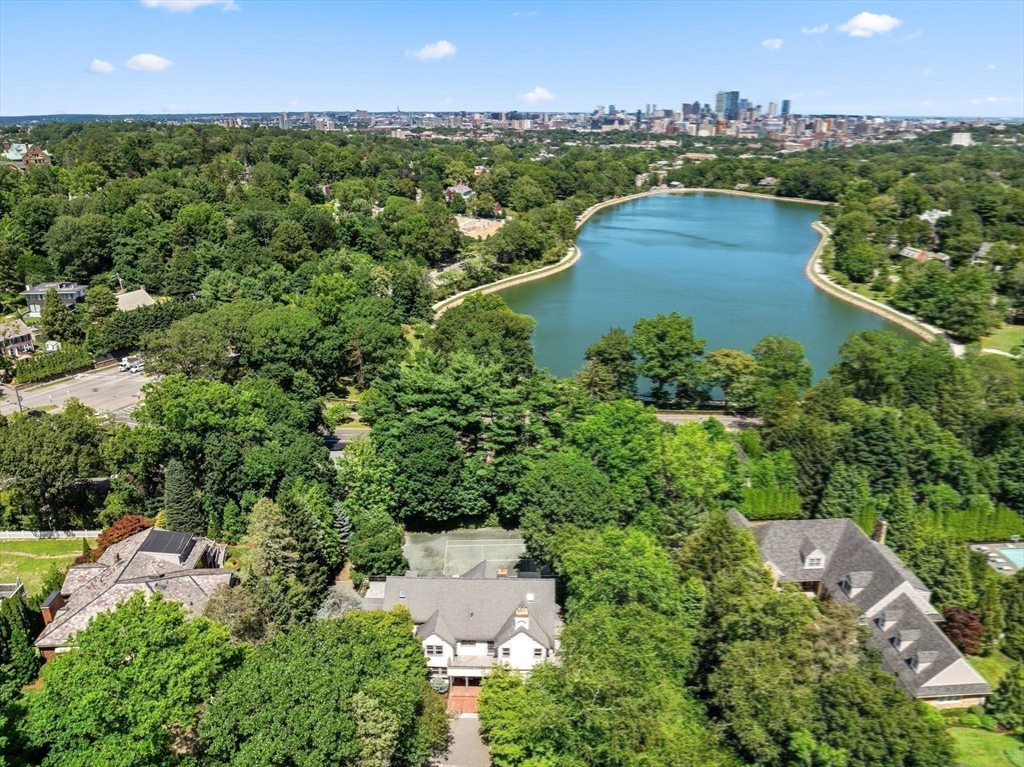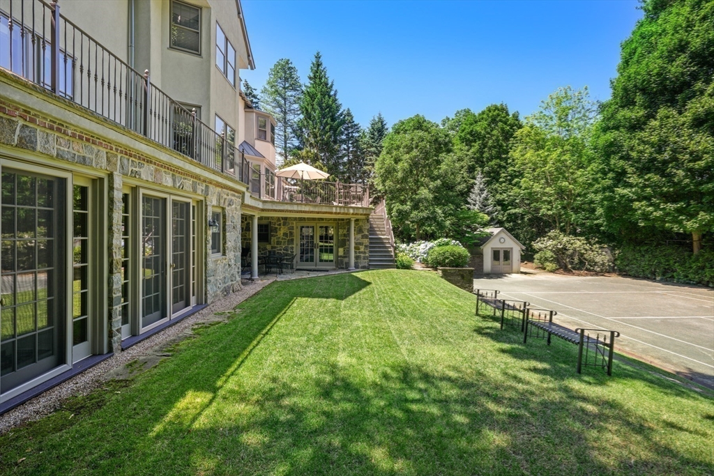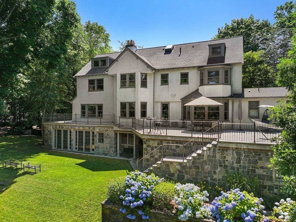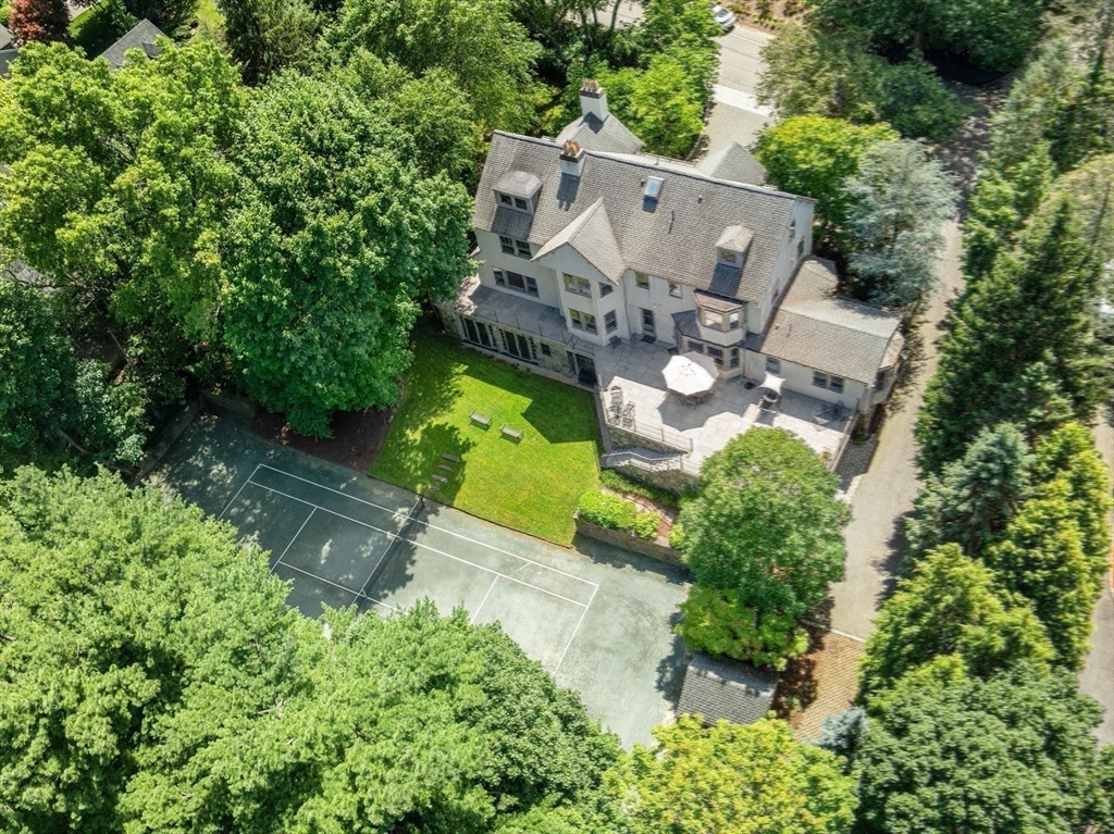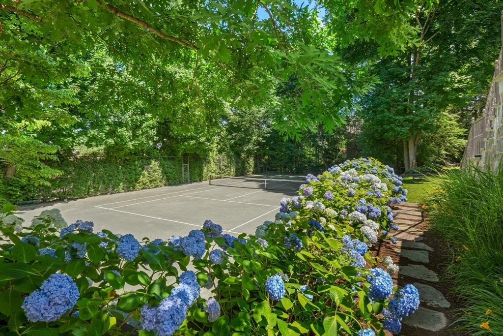 An exquisite stucco residence nestled in the coveted Chestnut Hill neighborhood of Brookline. Its hilltop location with stunning terraced grounds provides seasonal views of the reservoir and iconic Boston skyline. This property boasts a clay tennis court and completely renovated interior with a geothermal HVAC system and heated 3-car garage. The cook's kitchen with breakfast area and French doors lead to an elegant stone patio and backyard oasis. The spacious formal living and dining rooms, wood paneled library and family room complete the elegant main level. The seven bedrooms include a primary suite with dual bathrooms and dressing rooms. The third floor has a generous two-bedroom guest suite. The unique walkout lower level is extraordinary and features the original carriage house restored with an illuminated brick barreled ceiling, an unparalleled stone entertainment room and additional bedroom suite. Experience luxury living with the convenience of Boston's vibrant lifestyle.