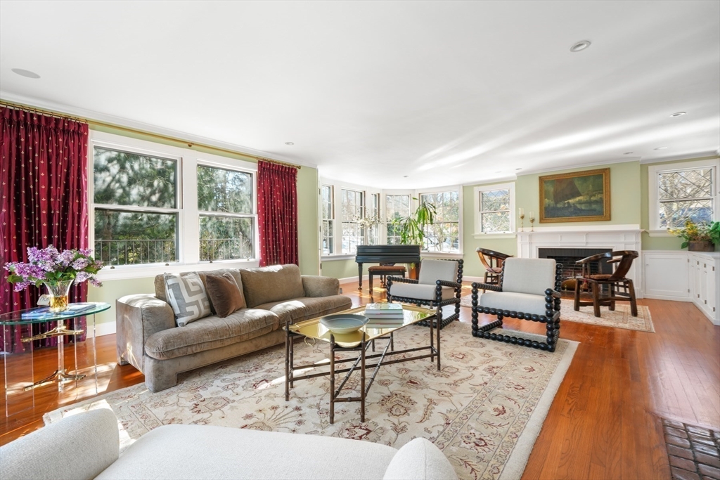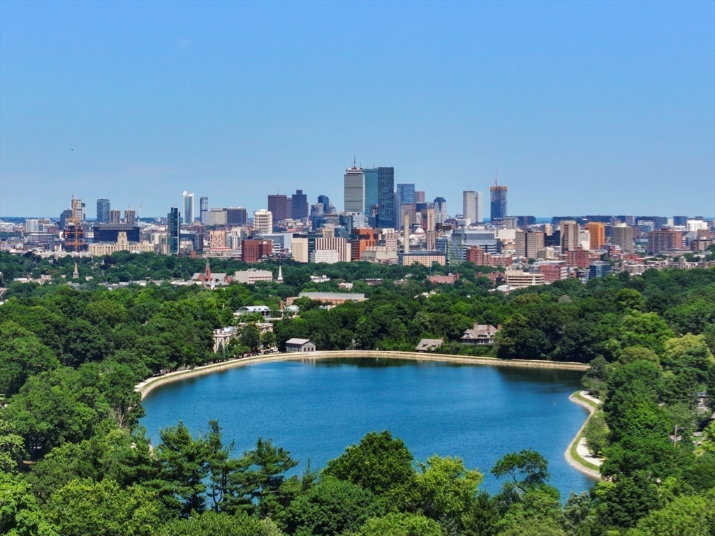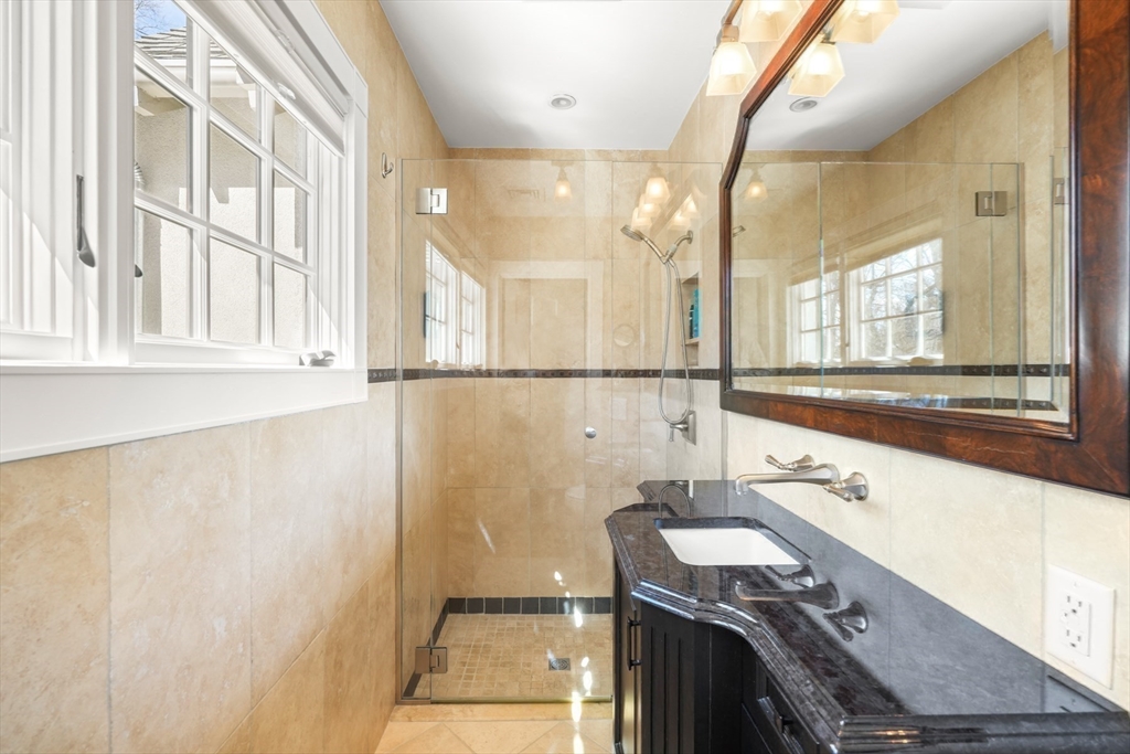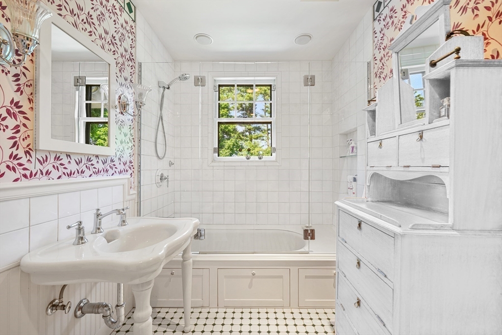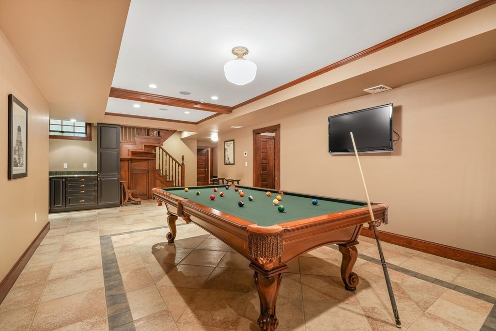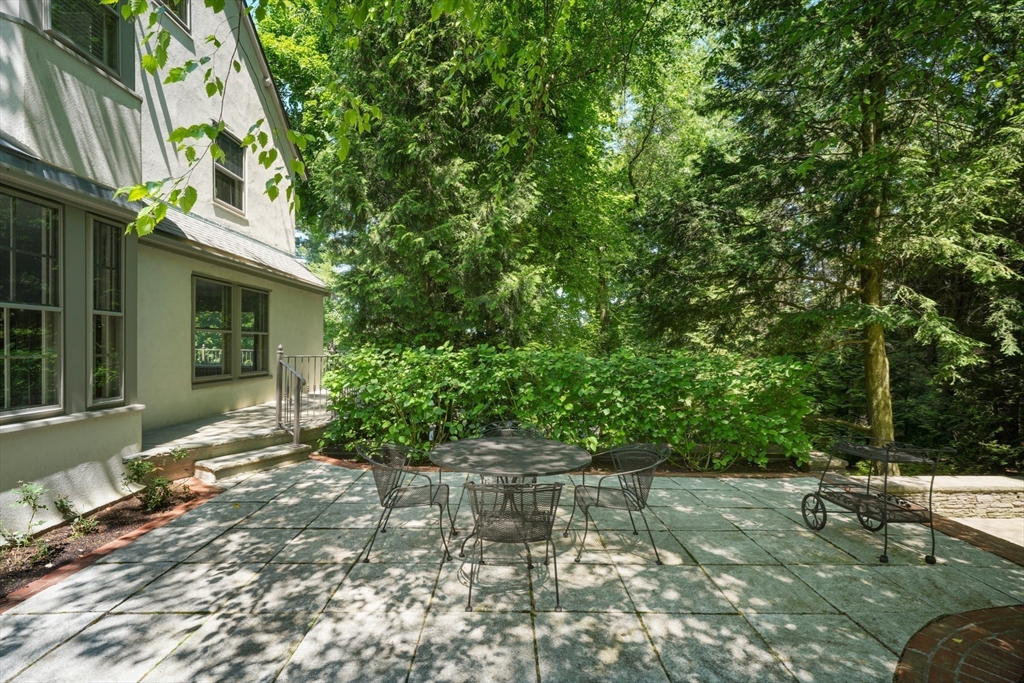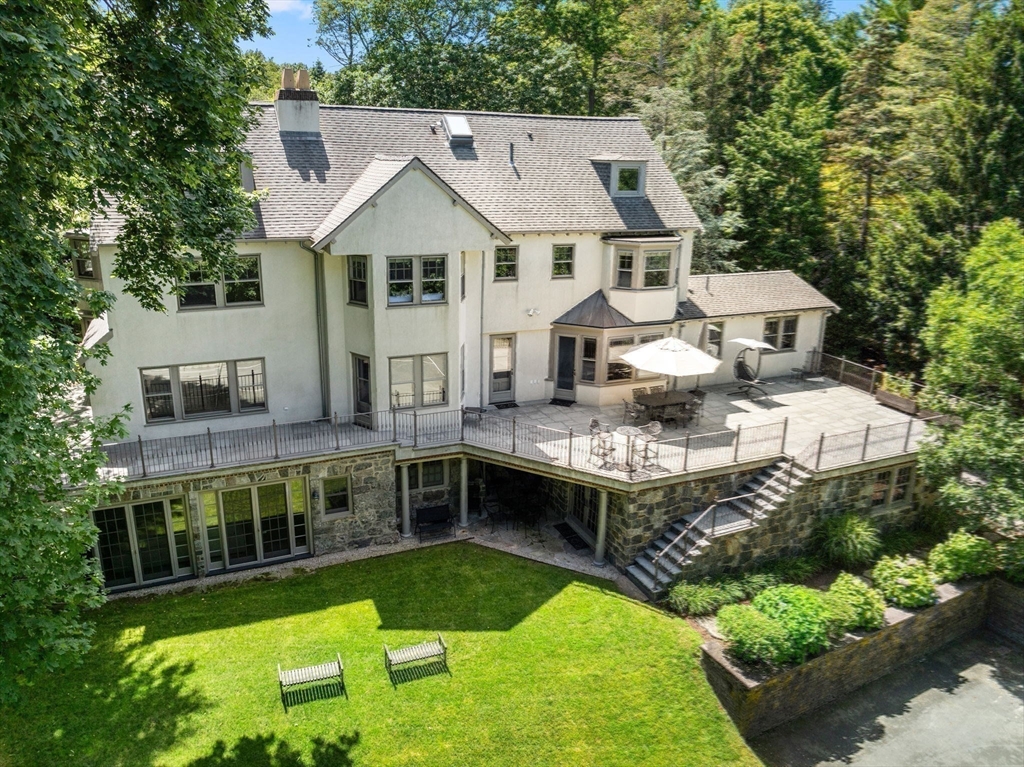 An exquisite stucco residence nestled in the coveted Chestnut Hill neighborhood of Brookline. Its hilltop location with stunning terraced grounds provides seasonal views of the reservoir and iconic Boston skyline. This property boasts a clay tennis court and completely renovated interior with a geothermal HVAC system and heated 3-car garage. The cook's kitchen with breakfast area and French doors lead to an elegant stone patio and backyard oasis. The spacious formal living and dining rooms, wood paneled library and family room complete the elegant main level. The seven bedrooms include a primary suite with dual bathrooms and dressing rooms. The third floor has a generous two-bedroom guest suite. The unique walkout lower level is extraordinary and features the original carriage house restored with an illuminated brick barreled ceiling, an unparalleled stone entertainment room and additional bedroom suite. Experience luxury living with the convenience of Boston's vibrant lifestyle.