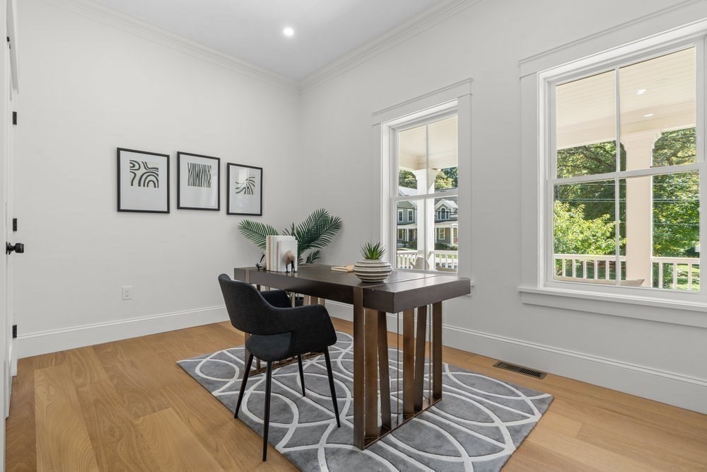 An exceptional NEW 6-bedroom, 5.5-bath modern farmhouse colonial, perfectly positioned in one of Lexington’s most coveted neighborhoods. Thoughtfully designed for both everyday comfort and sophisticated entertaining, this sun-drenched, southern-facing home showcases refined craftsmanship and timeless architectural details. Inside, wide-plank white oak floors, soaring ceilings, and elegant millwork create a sense of warmth and sophistication. At the heart of the home, the chef’s kitchen impresses with a large center island, premium appliances, wet bar, service pantry, and a sun-filled breakfast room opening to a private deck. A first-floor suite with ensuite bath offers flexibility for guests or a home office. Upstairs, the serene primary suite features a spa-like bath, dressing room, and views of the private yard. Sited on a large, tranquil lot, with mahogany porch & deck, and 3-car garage, this home blends modern luxury with classic New England charm—a rare Lexington gem.
