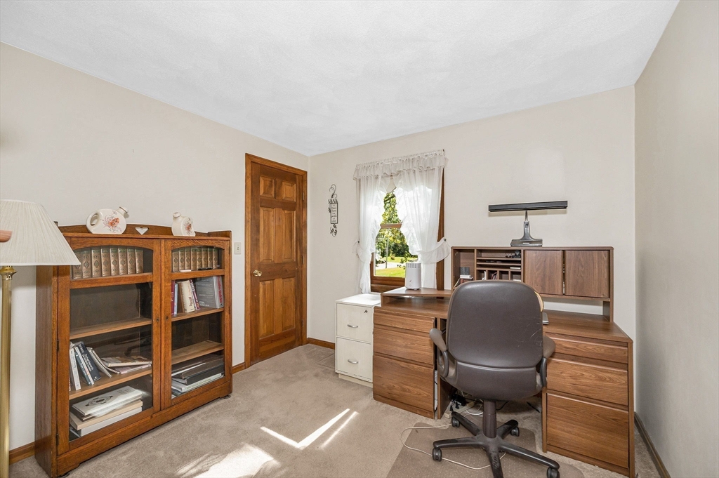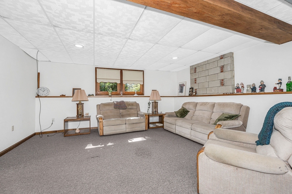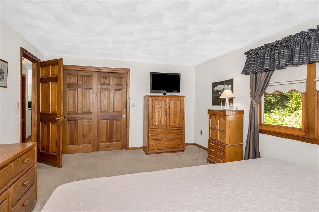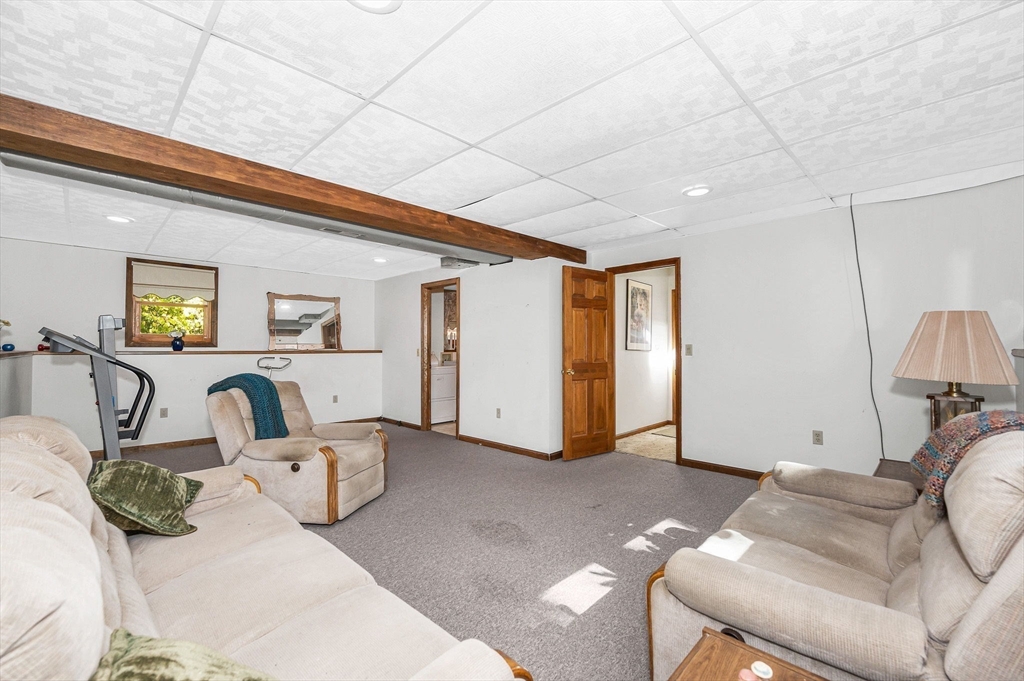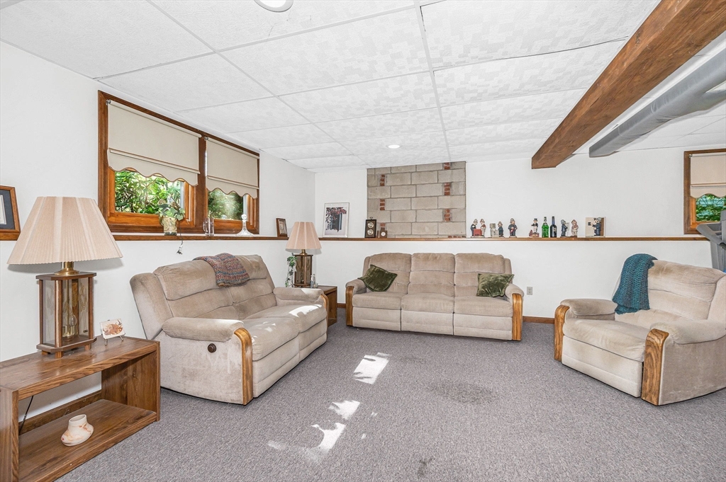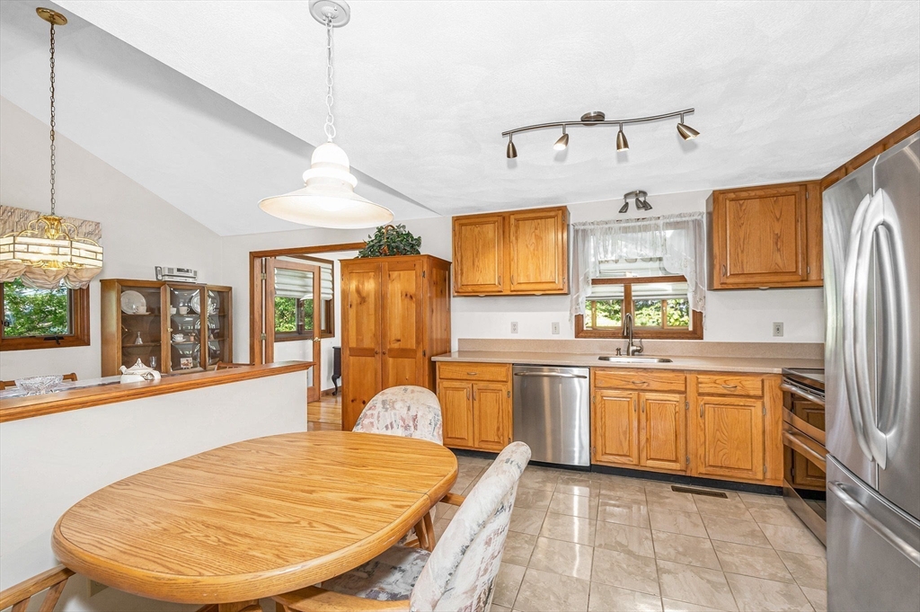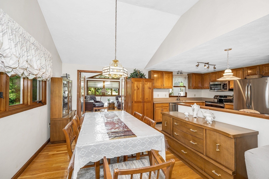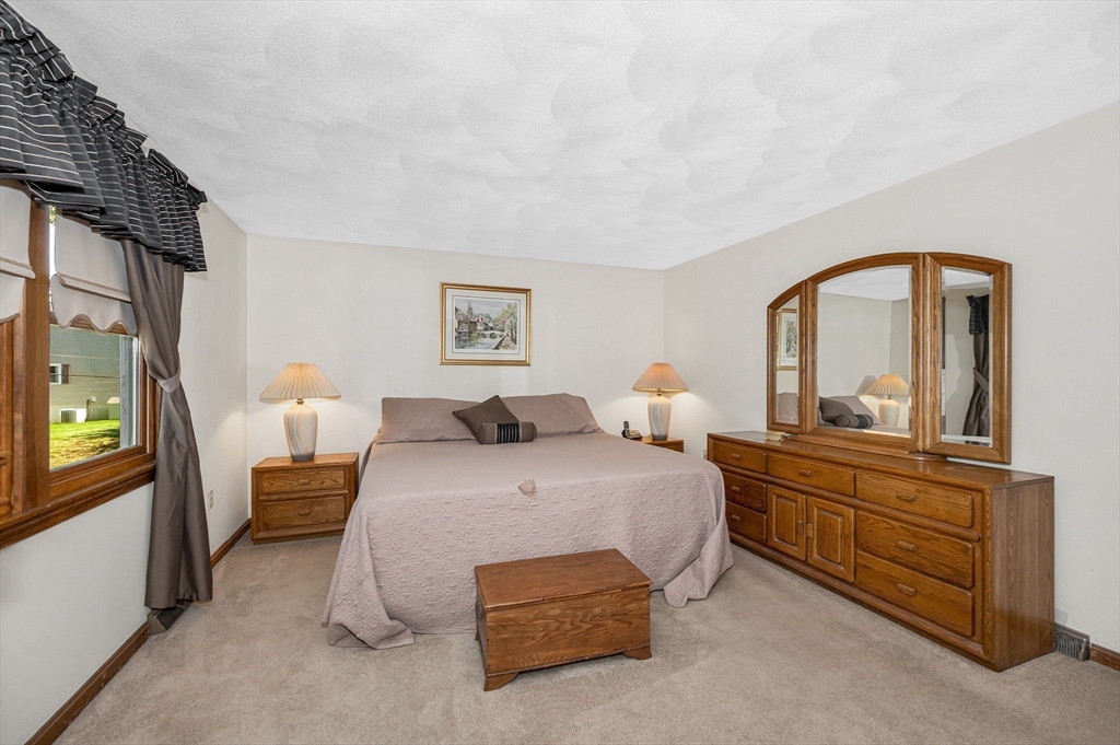 Tucked away in a tranquil neighborhood, this inviting oversized Raised Ranch offers the perfect balance of privacy & convenience! Enjoy the serenity of this almost 1/2 acre lot while being just minutes from shopping, major highways & MBTA train stations. Step inside to find a welcoming open concept fireplaced living room with soaring cathedral ceilings. The well designed kitchen with modern appliances offers an eat-in option while opening to the dining space for effortless entertaining. Relax in the spectacular heated sun room room featuring walls of windows creating a connection to nature year-round. Gleaming hardwood floors grace the living, dining & sun rooms. Down the hall you will find an updated full bath & 3 generous sized bedrooms. The lower level offers a front to back family room & 3/4 bath. The 2 car garage has brand new doors. Amenities include central air & lawn irrigation. Tours of this lovely home begin immediately! A quick closing is possible!