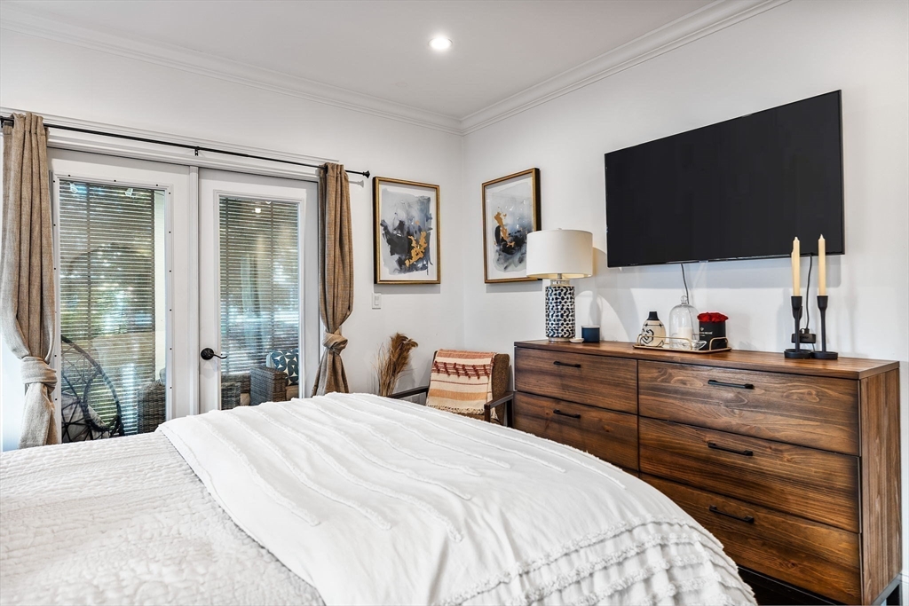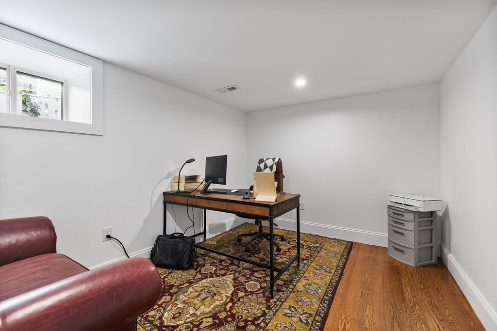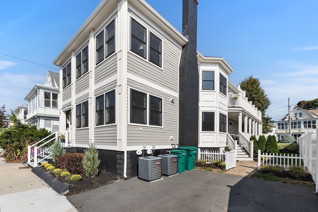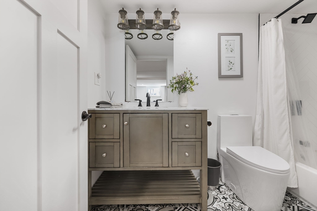 A MUST SEE! Renovated approx. 5 years ago. The main level welcomes you with a hexagon-tiled foyer and expansive living room with sleek electric fireplace, perfect for everyday living and entertaining. A show-stopping chef’s kitchen features stainless steel appliances, quartz counters, a 7-ft waterfall island, serving bar with wine fridge, and dining area. The luxurious primary suite offers a spa-like shower with, bluetooth speakers, custom built out closet, and private enclosed deck. A second bedroom, laundry, powder room, and wide-plank white oak floors complete the first level with access to a large custom deck to a private yard! Downstairs, enjoy flexibility w/ a third bedroom, office, bonus living area, and full bath — ideal for a modern lifestyle. Every detail shines with custom finishes, woodwork, and designer lighting. Extras include a personal driveway space. Conveniently located minutes to Wellington Station, Rt. 93, Assembly Row & Boston, this home truly checks every box!
