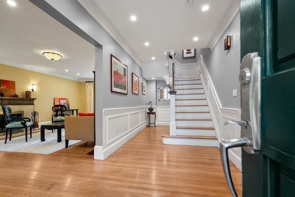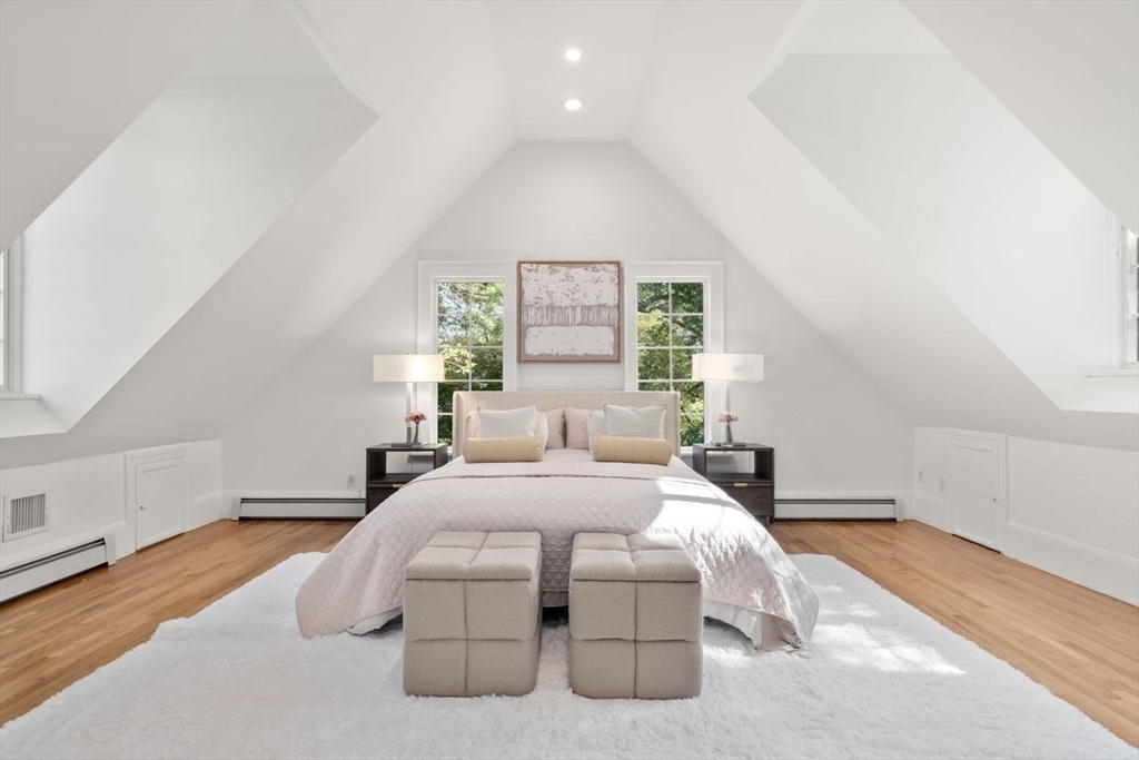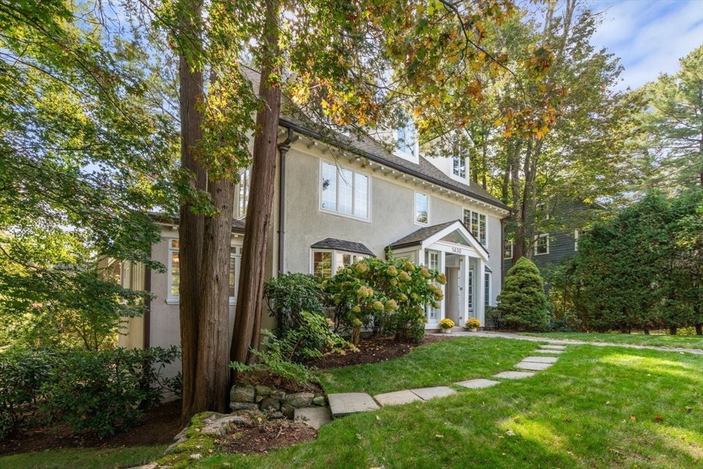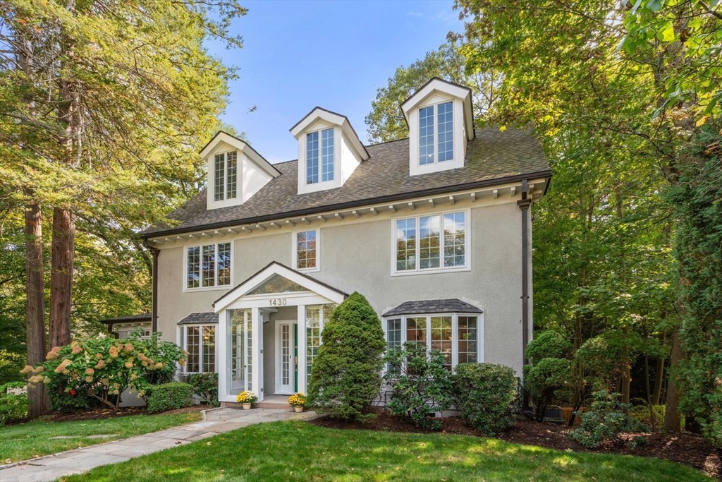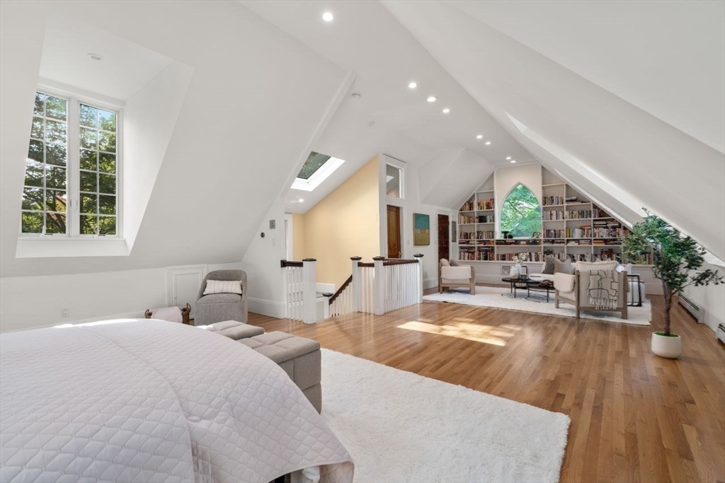 This elegant stucco single-family residence offers the best of both worlds: the timeless appeal of 1920’s architecture updated for today's modern lifestyle. This home features four generously proportioned bedrooms (three are en suite), four full bathrooms, and one half bathroom. Convenience, comfort, and stylish design are thoughtfully considered throughout. The living area encompasses 3045 square feet, providing a substantial canvas for creating distinct living spaces. A finished lower level with bedroom/living room, full bathroom, and private entrance is perfect for a live-in nanny or as an in-law suite or office/fitness room. The upper level brings the wow factor! Spanning the length of the house, it boasts a cathedral ceiling, bookshelf-lined wall, and lovely views of the surrounding tall trees. Situated on a landscaped corner lot of 8650 square feet, this home has mature plantings and tall hedges for privacy. Two attached garages and a side-street driveway with multiple parking.