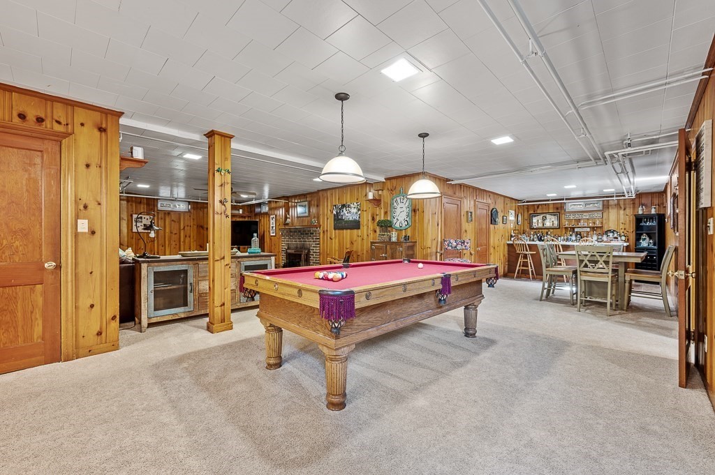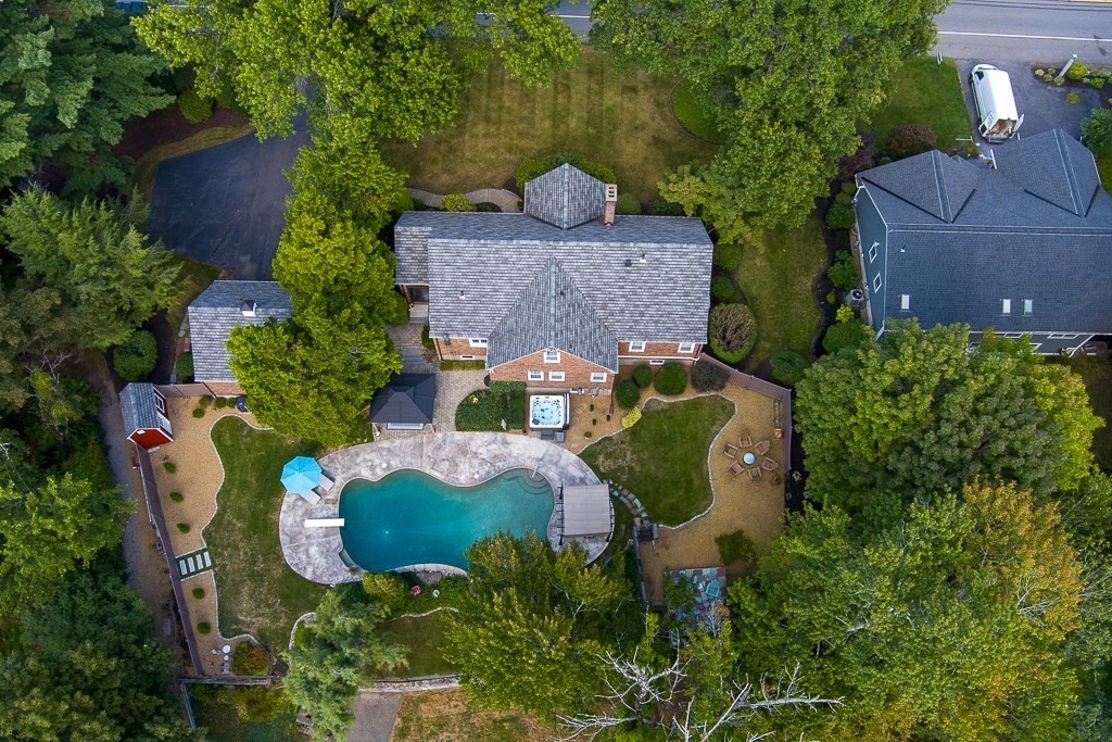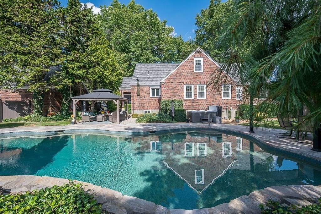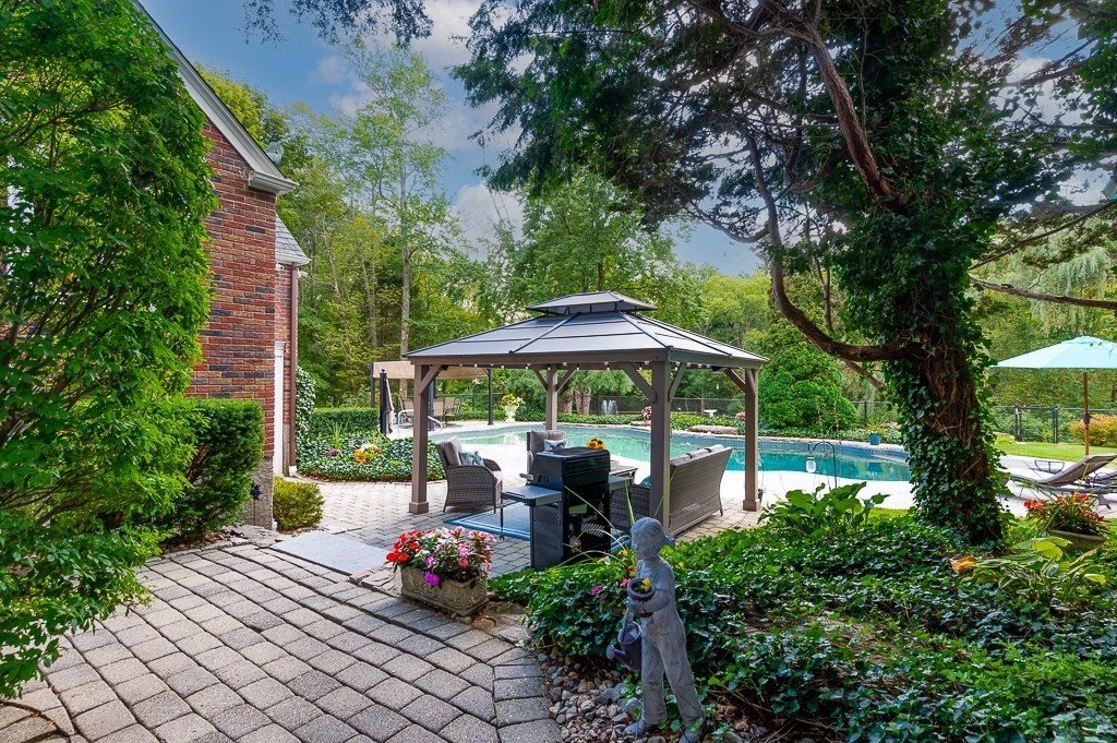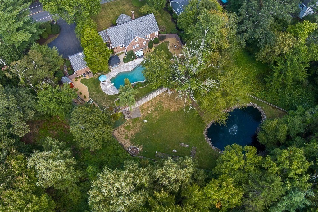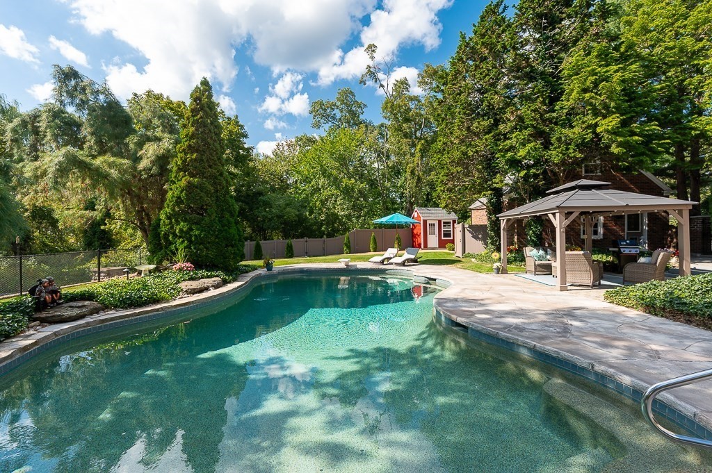 Welcome to your own private resort on sought-after Salisbury Street in Worcester! This stunning 4-bedroom, 2.5-bath home offers over 4,100 sq. ft. of finished space, including a versatile lower level. The beautifully landscaped ¾-acre lot features a sparkling in-ground pool with cabana, hot tub, and tranquil pond with fountain, surrounded by multiple outdoor living areas. Inside, the open-concept design includes a spacious kitchen flowing into the dining and living rooms, a first-floor master, updated bath with Jacuzzi tub, plus a second bedroom and office/den. Upstairs offers two additional bedrooms, a family room, and full bath. The fully finished lower level includes a family room with fireplace, game room, wet bar, bath, second kitchen, laundry, and abundant storage. A detached two-car garage with a stairway leading to additional storage and parking for 10 complete this exceptional property.